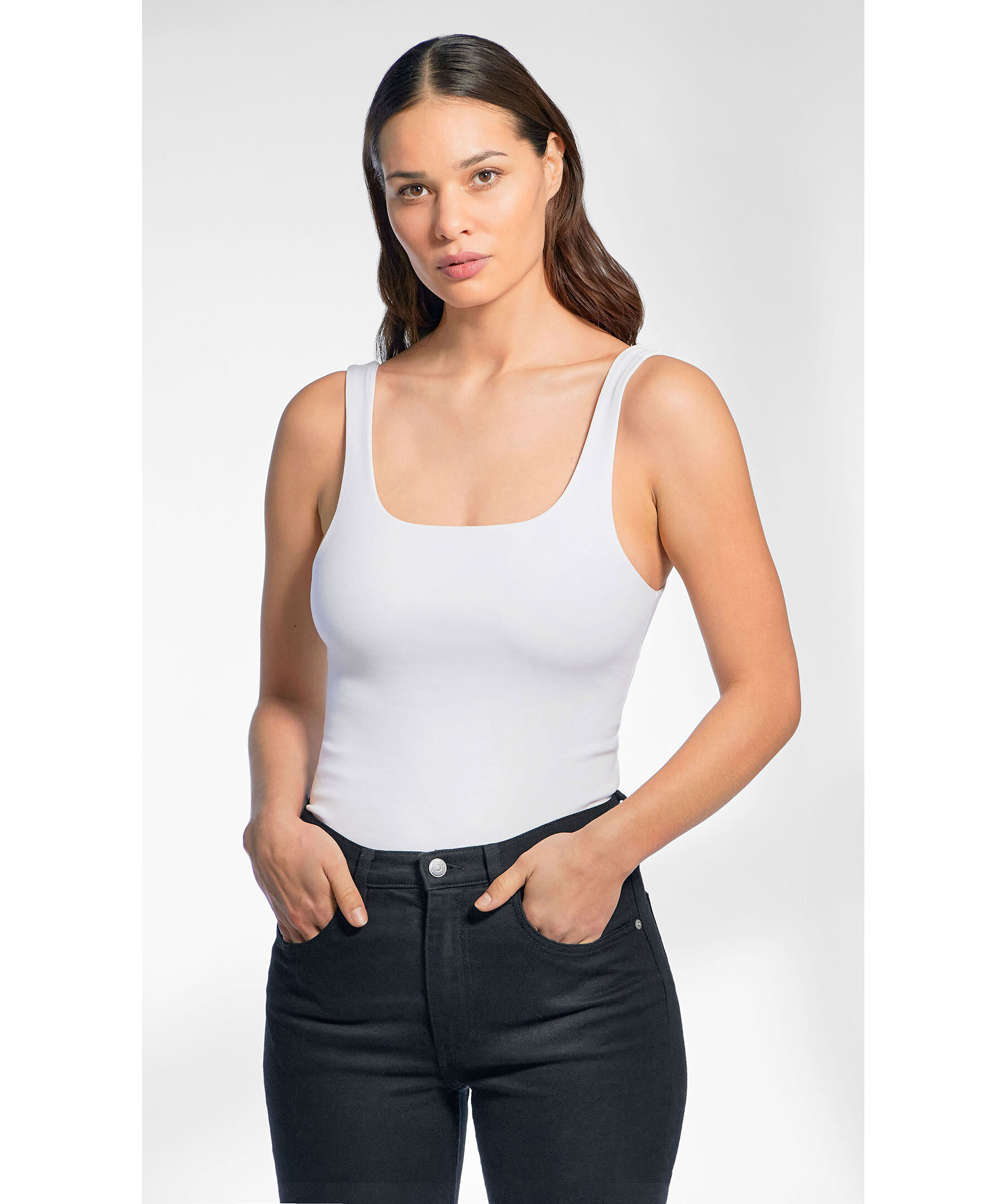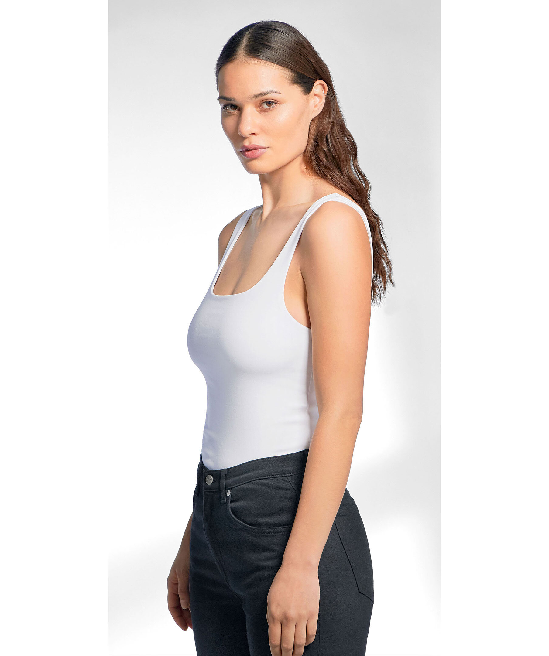 Vit topp från Bread & Boxers Daily Basics. Dubbla lager för stadga samt för att undvika genomskinlighet. Bomull- och elastan-blandning ger en stretchig passform. Dolda sömmar för en minimalistisk look, rundad halsringning fram och djup ringning bak.