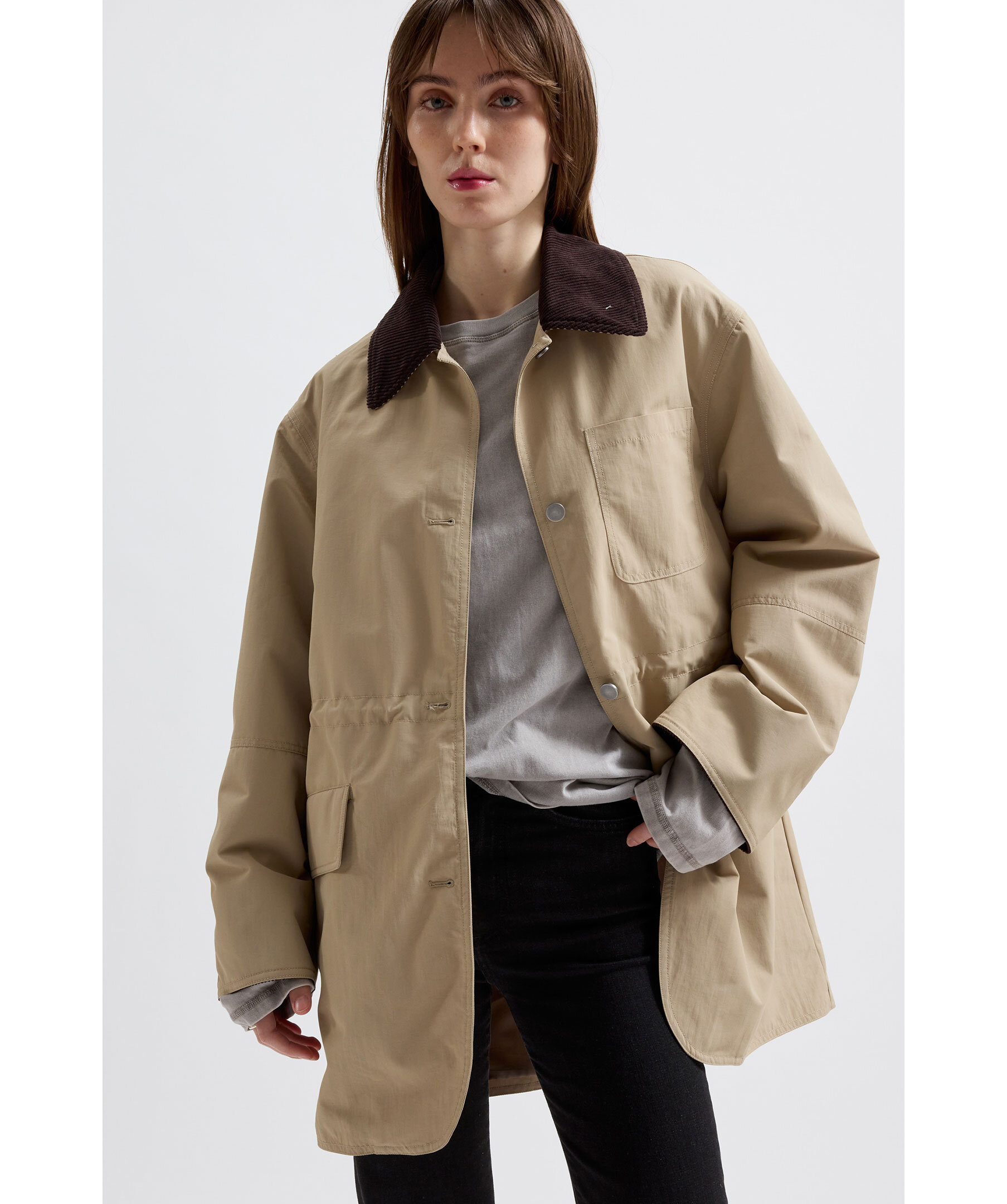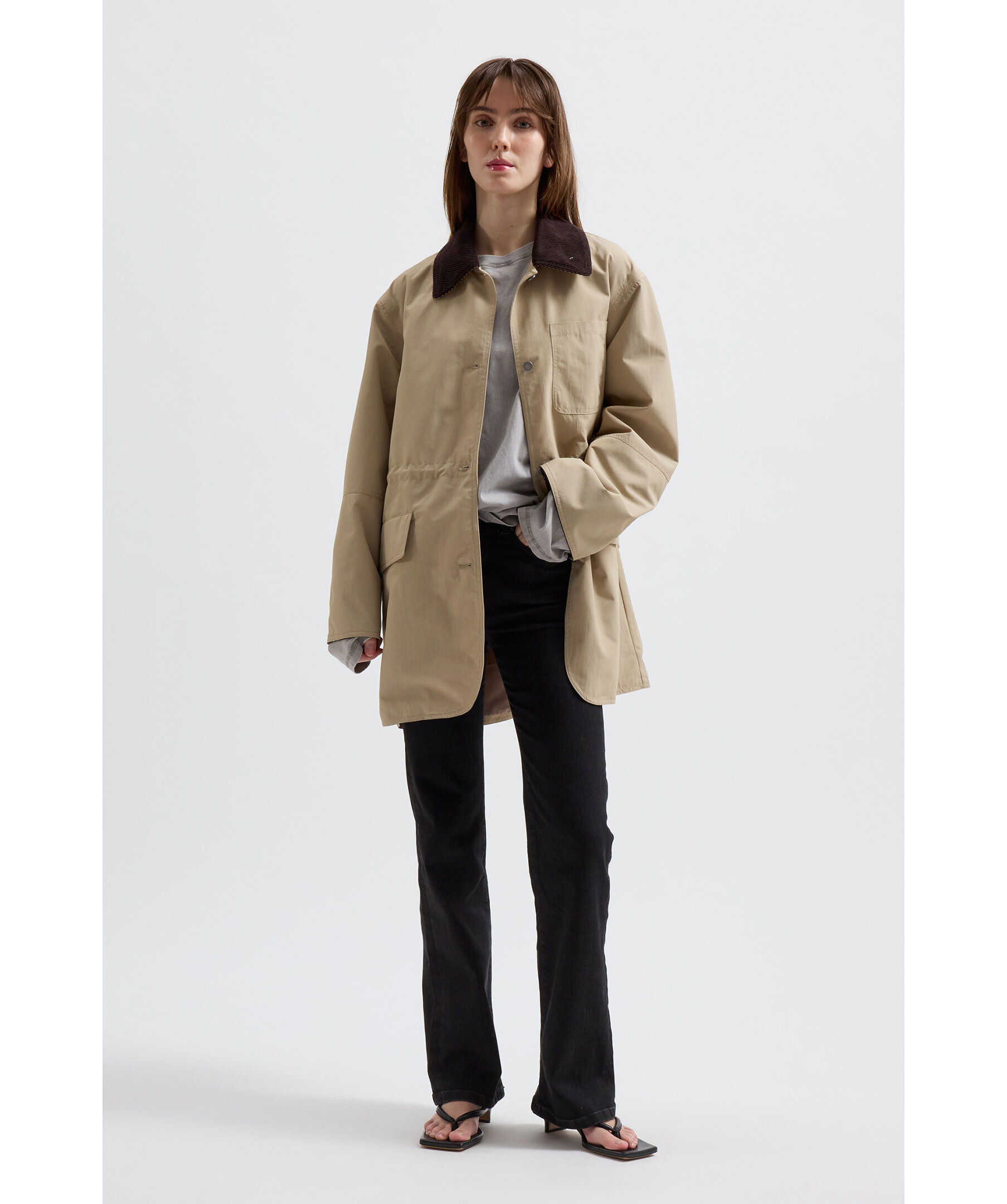 Khakifärgad jacka från Brixtol Textiles. Jackan stängs med knappar framtill och har sidfickor med lock, en bröstficka samt en innerficka. Dragsko i midjan för extra form. Jackan är även detaljerad med manschestertyg vid krage och invändig mudd. Helfodrad och vattentät. Tillverkad av ett lätt texturerat återvunnet nylontyg.
