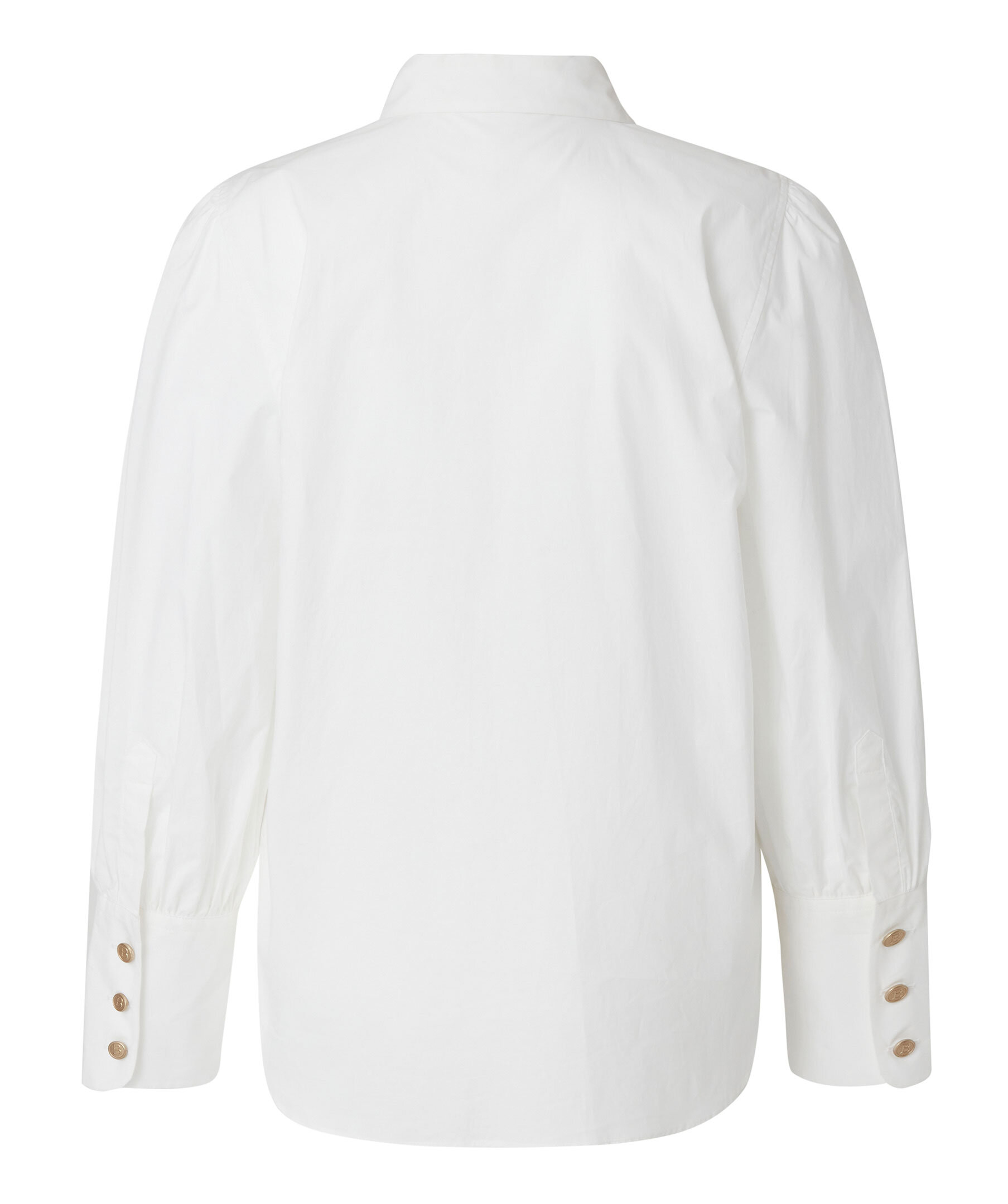 Vit skjorta med spetsig krage och detaljerad med puffiga axlar från Busnel. Guldfärgad B-knapp längst upp, dold knäppning hela vägen fram och muddar med tre guldfärgade B-knappar. Normal i storlek.