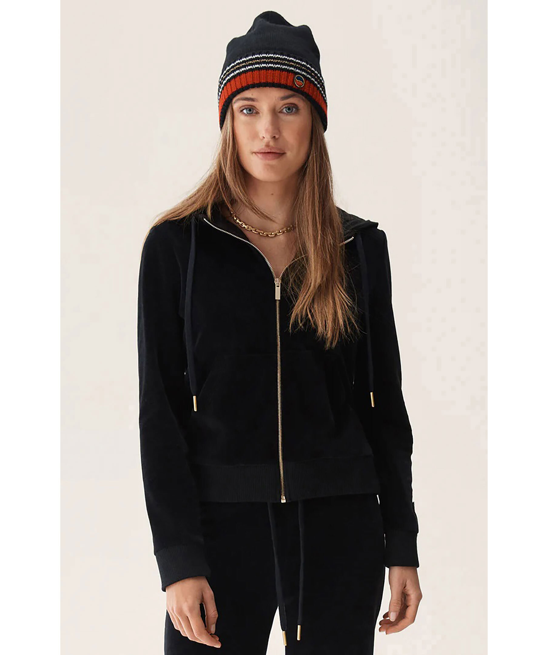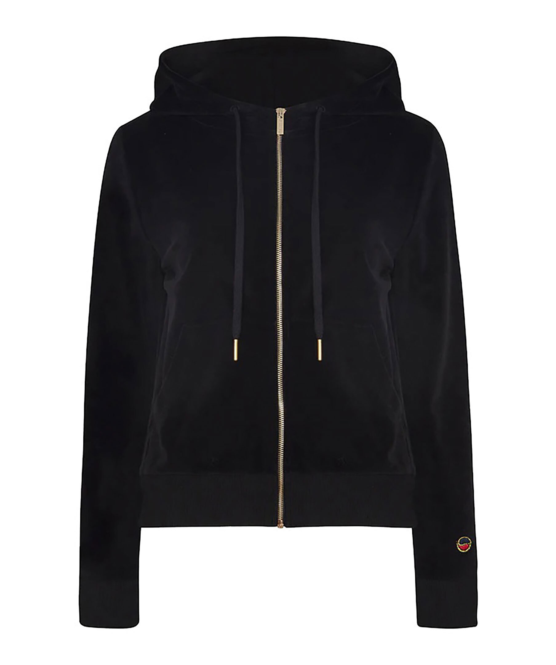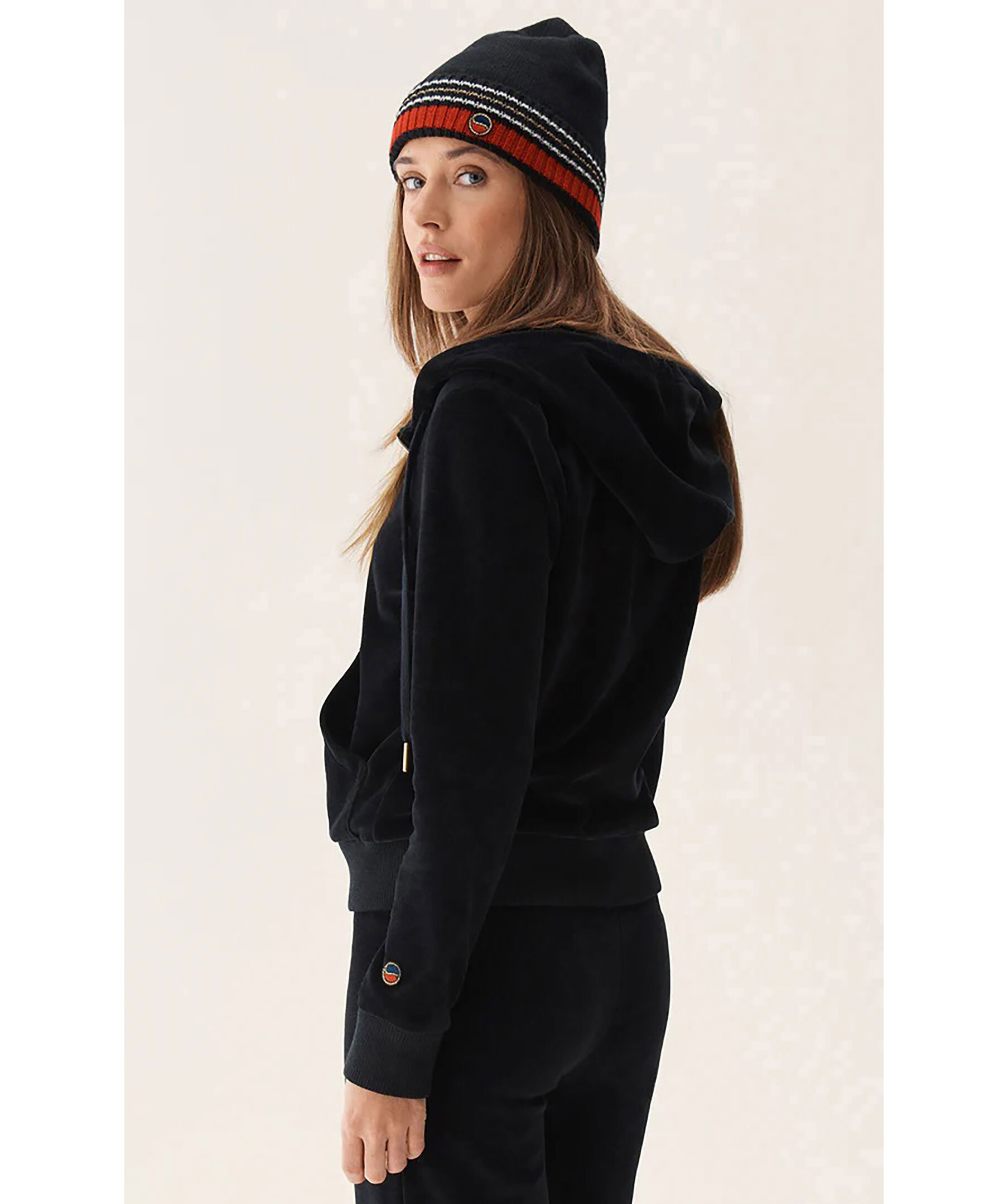 Svart hoodie i velour, designad med en avslappnad och bekväm passform från Busnel. Guldfärgad dragkedja, två sidfickor, ribbstickade muddar och avslut. Detaljerad med den ikoniska Busnel-logotypen på vänster ärm. Kombinera med matchande Magny Trousers för en mysig look. Om du är mellan två storlekar välj en större storlek. Modellen är 172 cm och bär storlek 38.