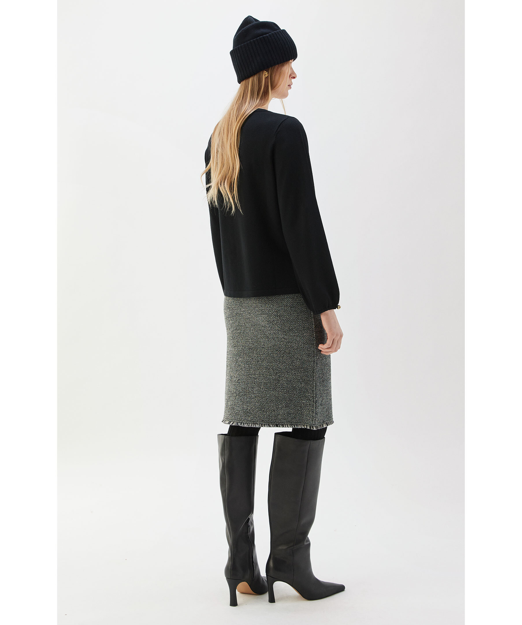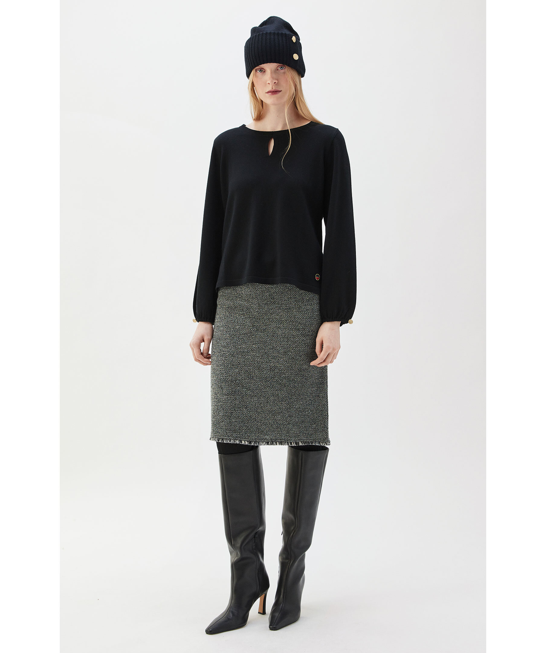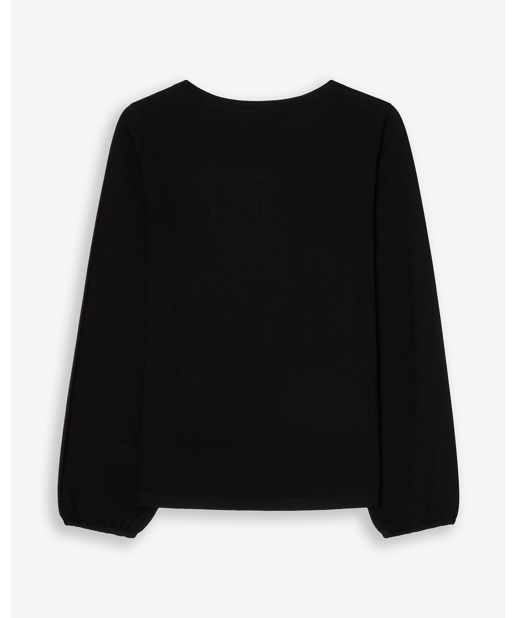 Svart, finstickad och långärmad topp från Busnel. Toppen har en båtringad halsringning, ribbstickade kanter, elastisk ärmslut detaljerad med gyllene B-knapp samt en nyckelhålsöppning framtill. Tillverkad i mjuk merinoull.