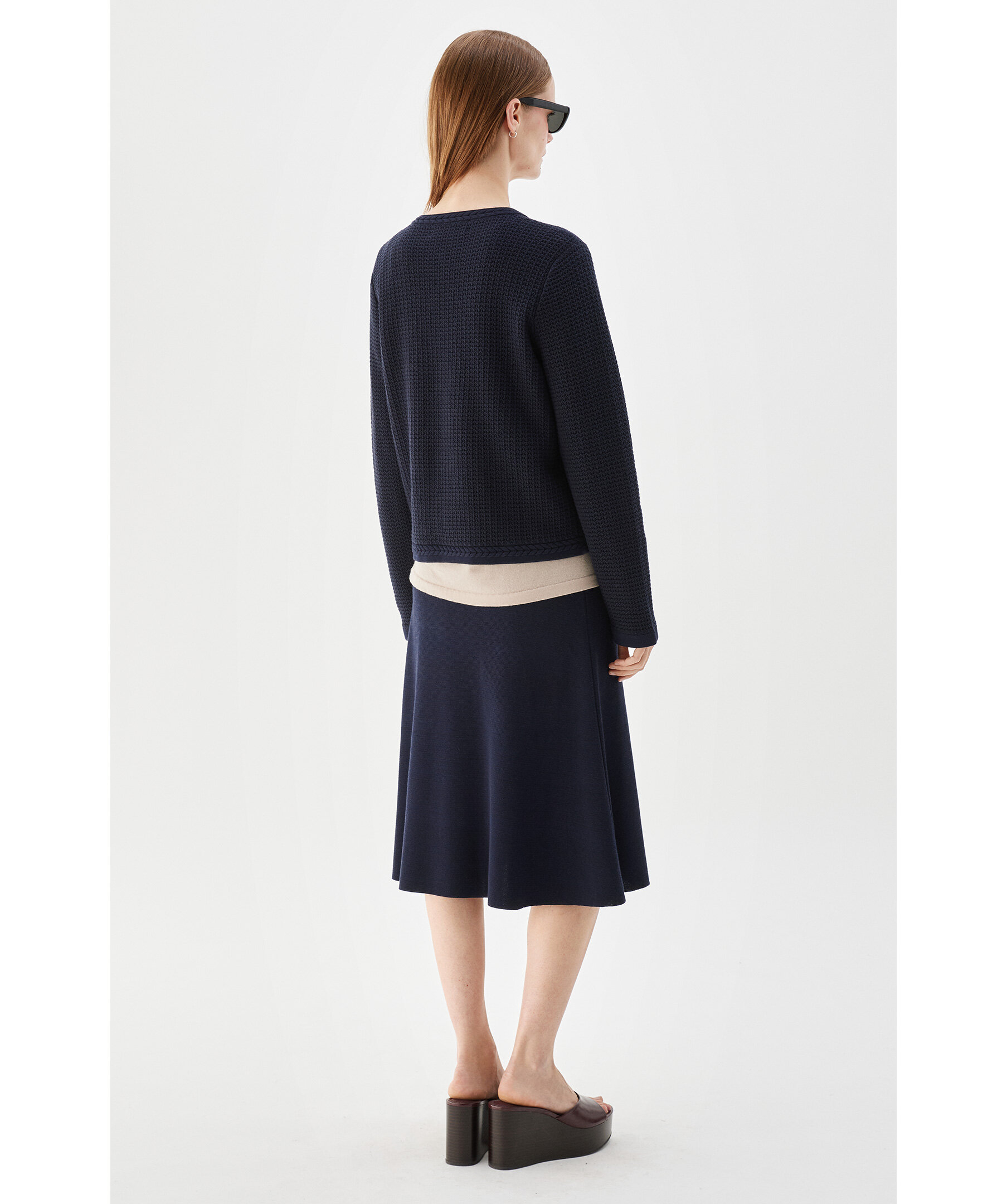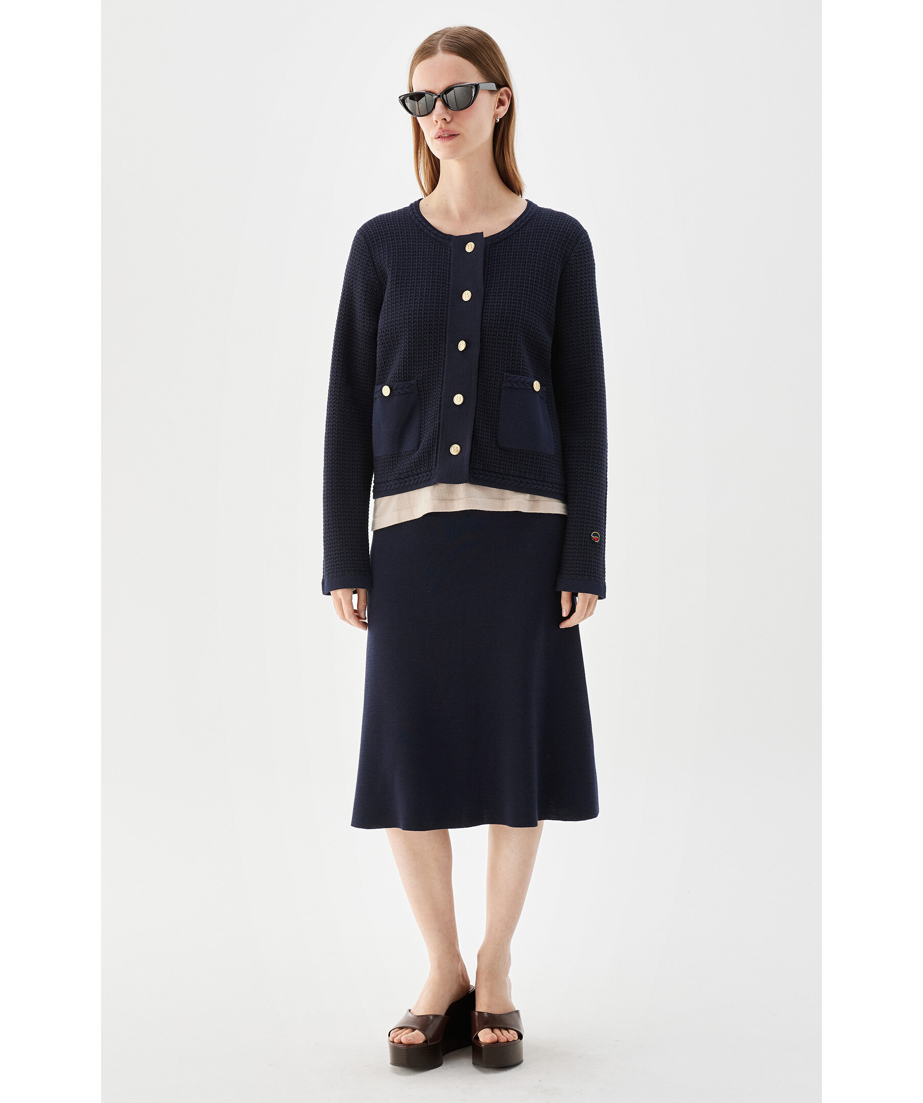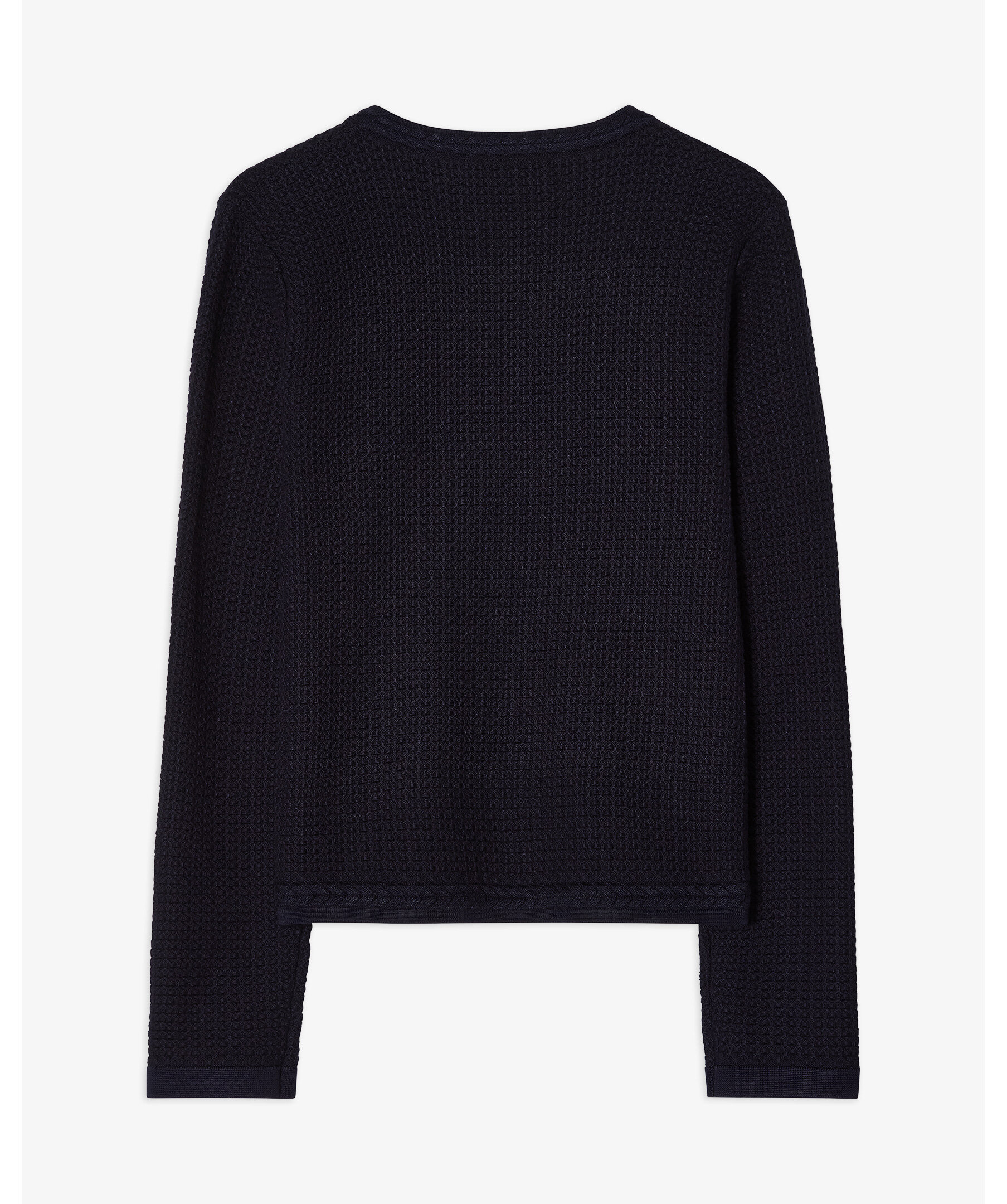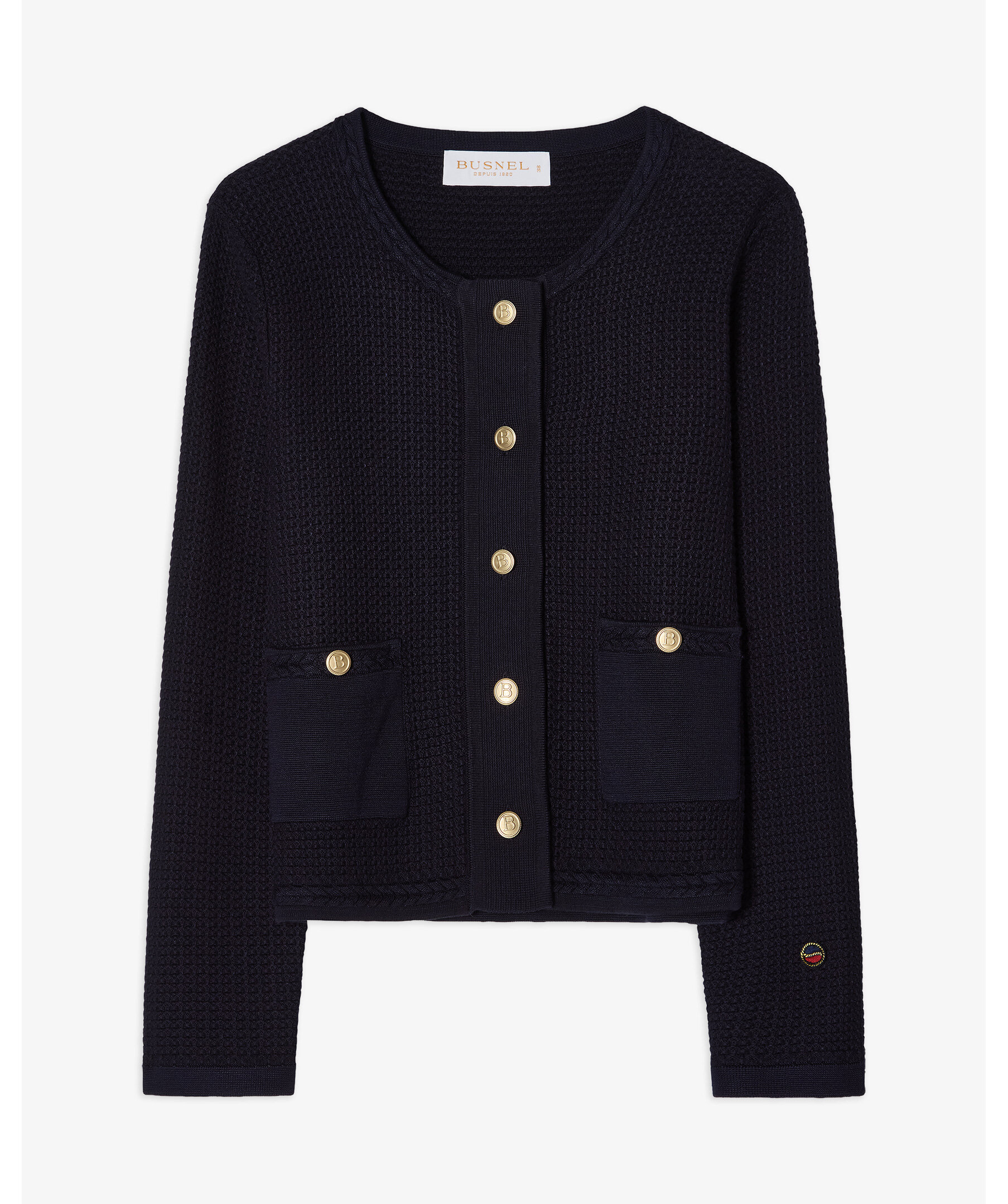 Mörkblå strukturstickad kofta i en bomullsmix från Busnel. Denna långärmade kofta har en rund halsringning, slätstickade utanpåliggande fickor och knäppkant, med guldknappar. En fin detalj till strukturstickningen är den stickade flätan som återfinns vid alla kanter.