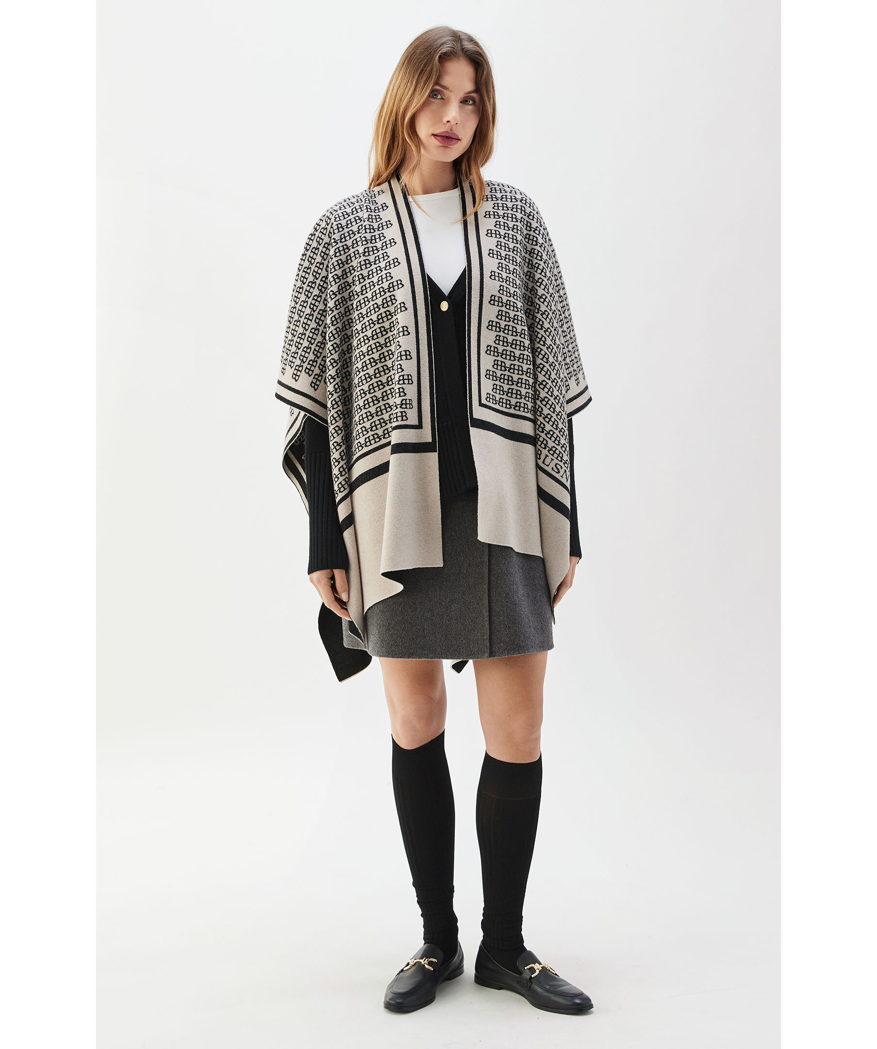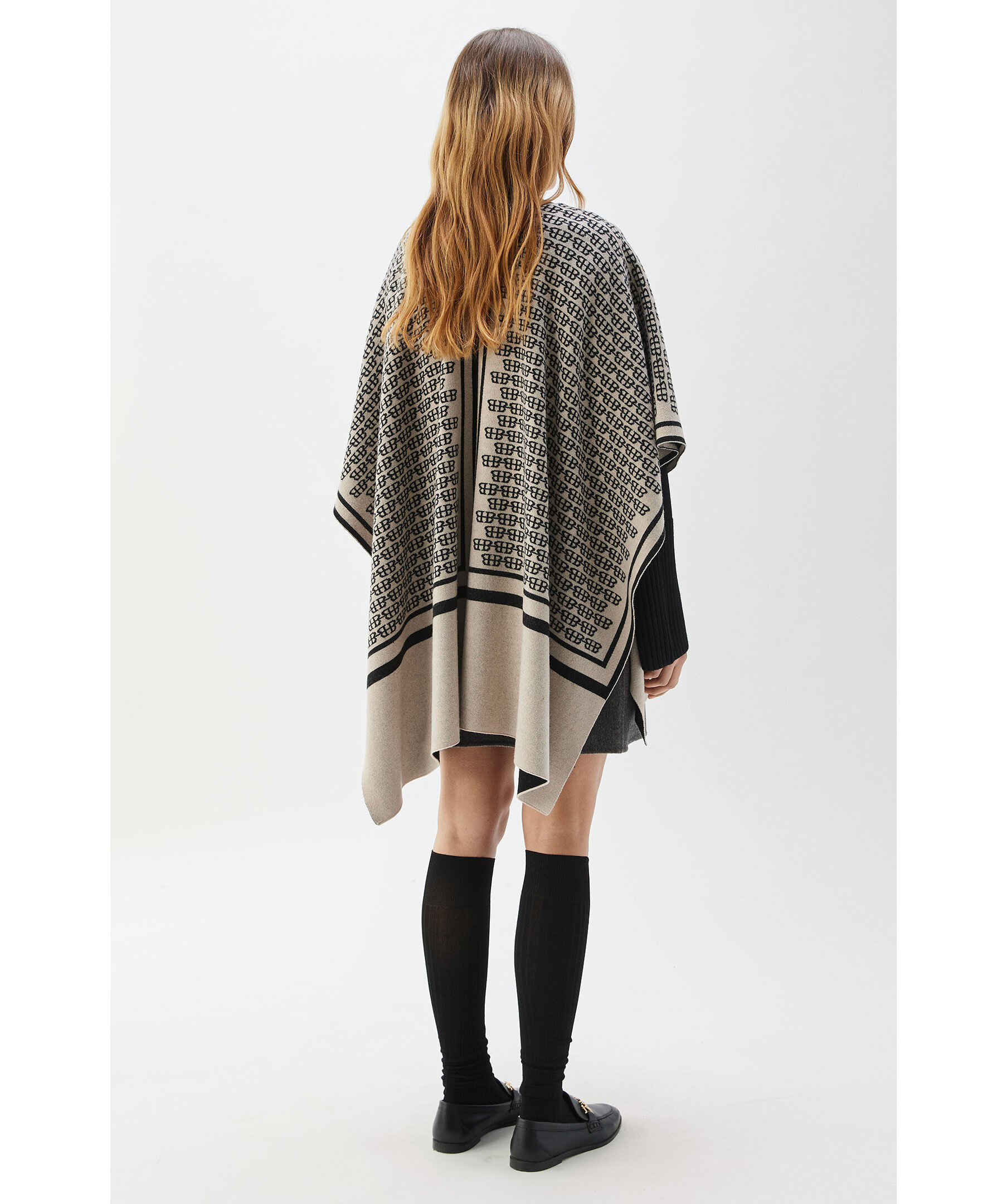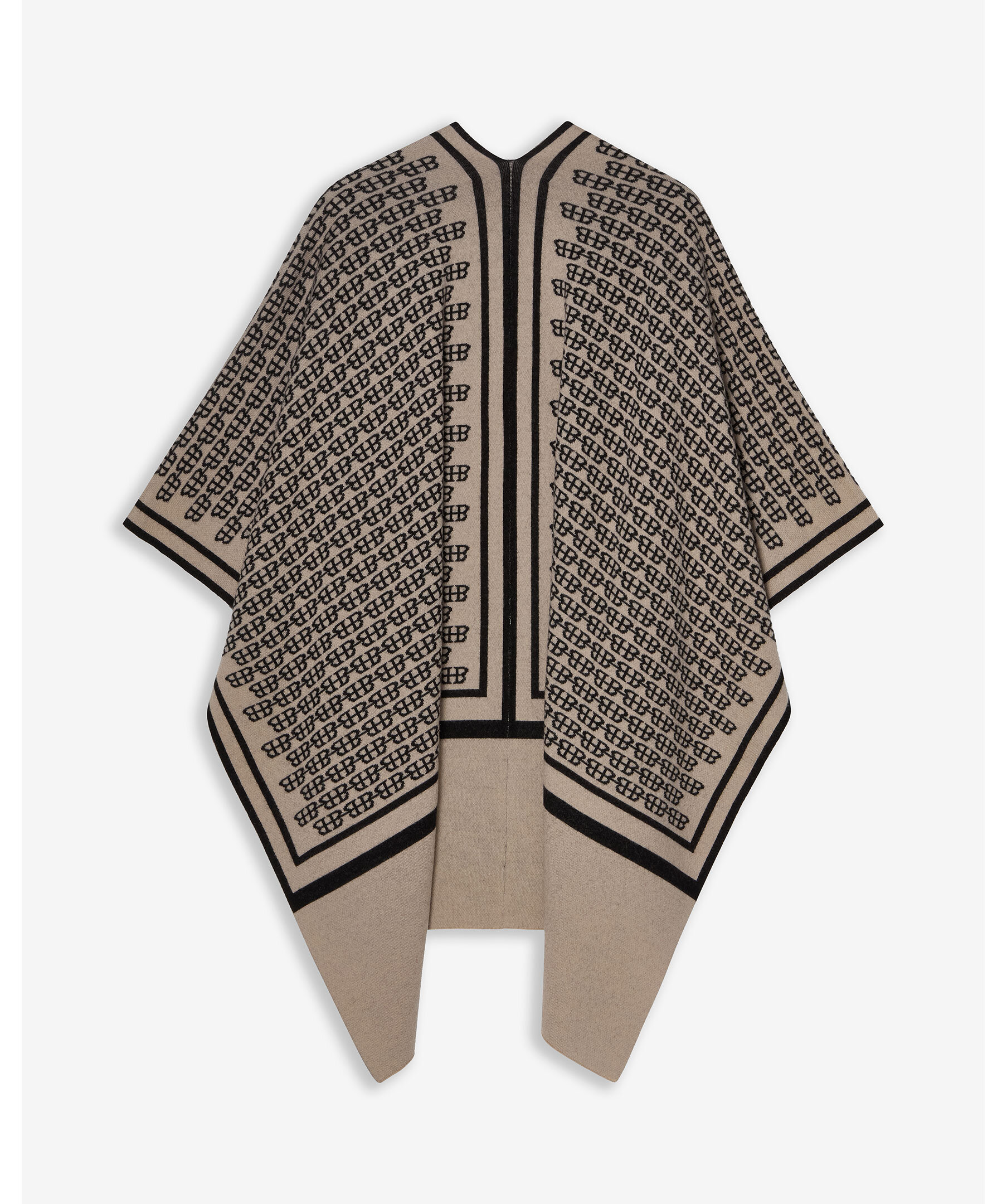 Beige och svart, mönstrad, stickad poncho från Busnel. Den har Busnel-logotypen i jacquard i kontrasterande färger, vilket skapar ett grafiskt men ändå subtilt mönster som är lätt att matcha med vilken look som helst. Dra den över axlarna, framhäv midjan med ett bälte eller bär den helt enkelt som den är. Tillverkad av den mjukaste merinoullen.