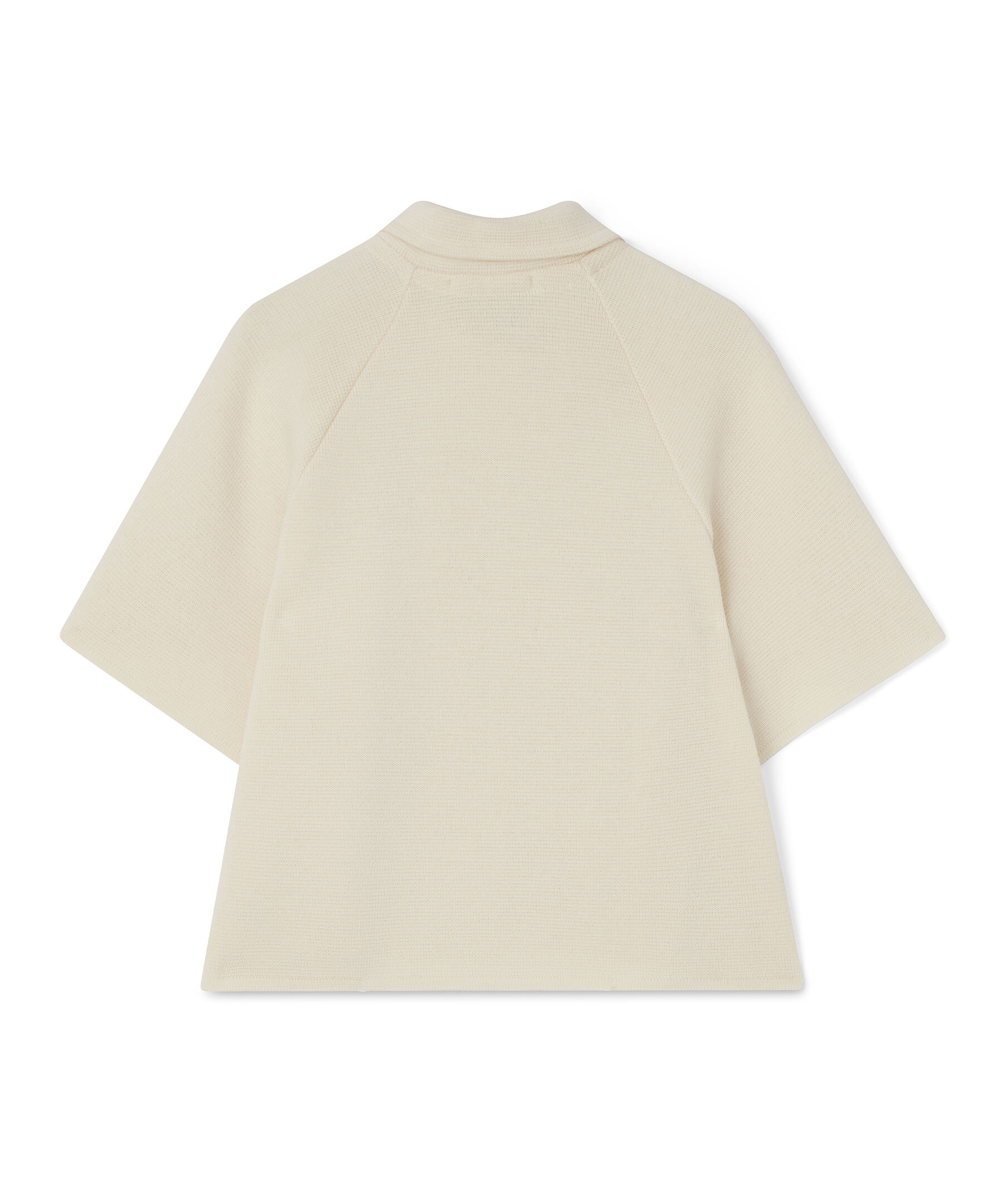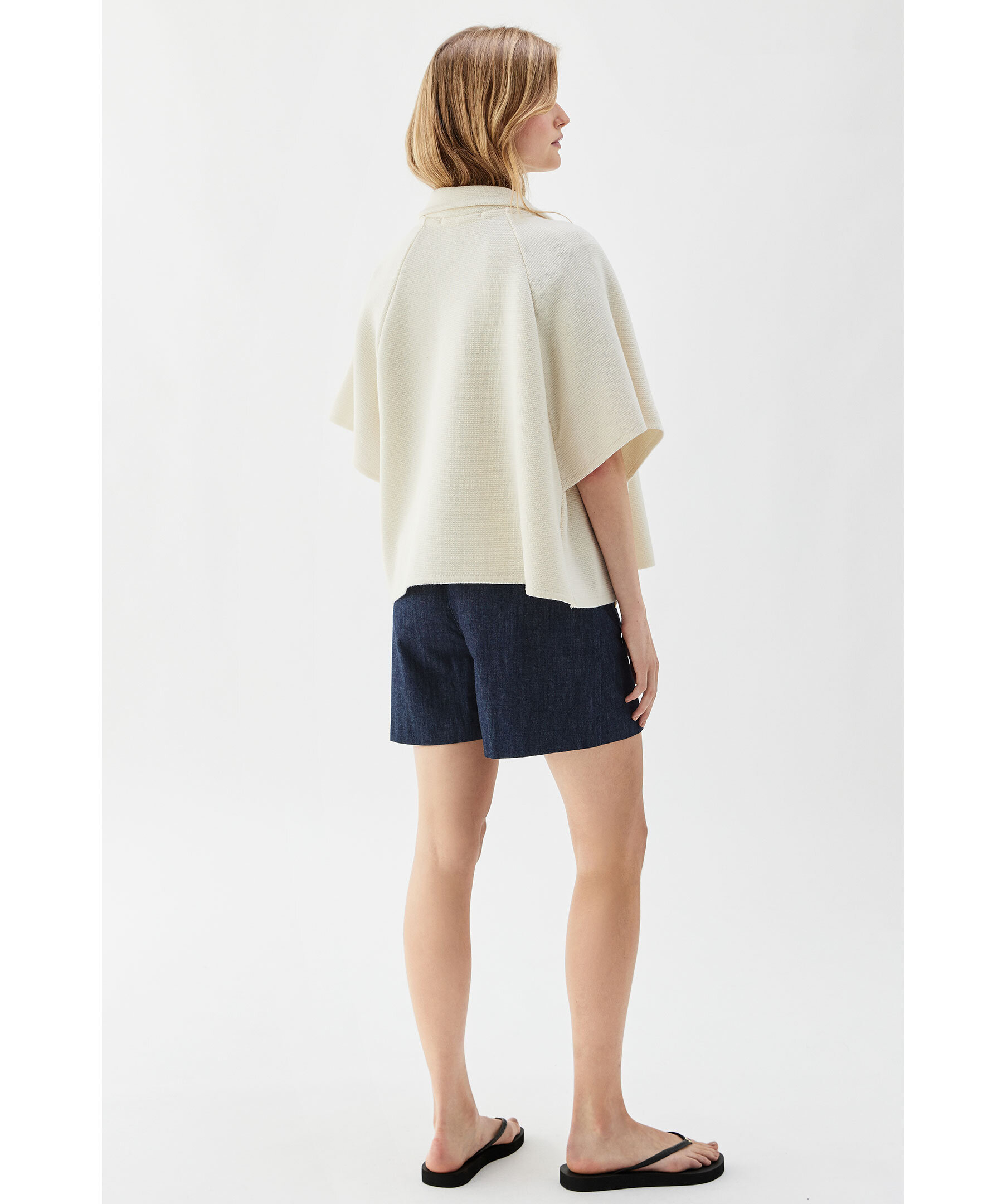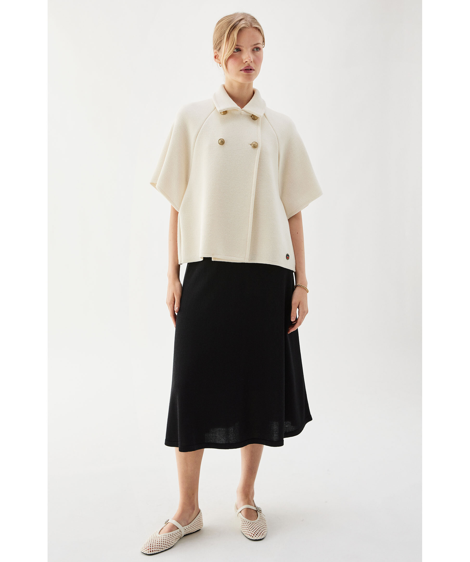 Benvit kappa från Busnel som kan bäras ute och inne. Kappan har korta ärmar och är dubbelknäppt med fyra gyllene ankarknappar upptill. Tillverkad i ull.