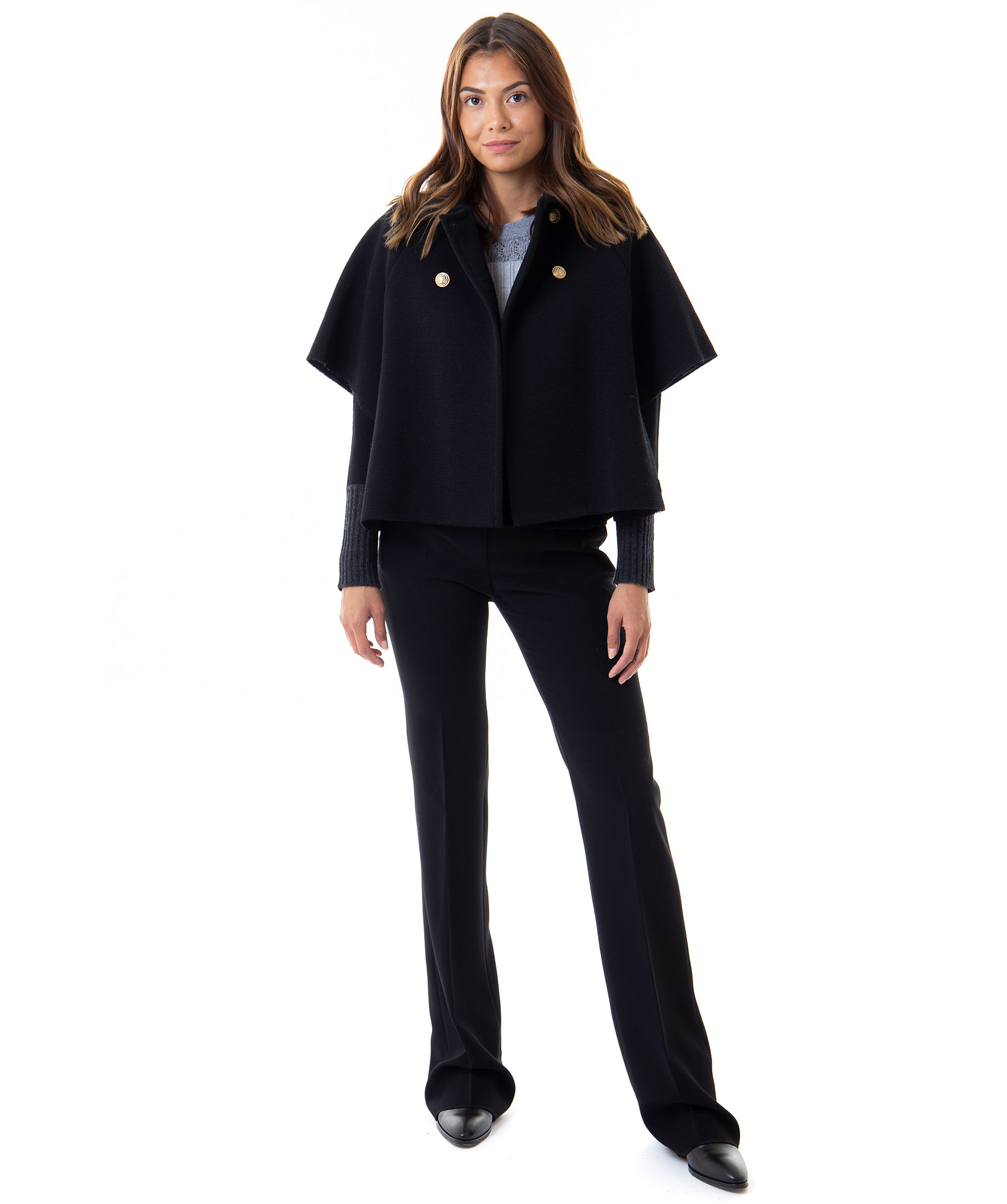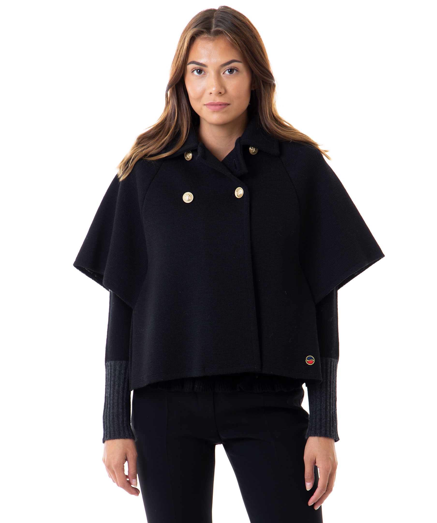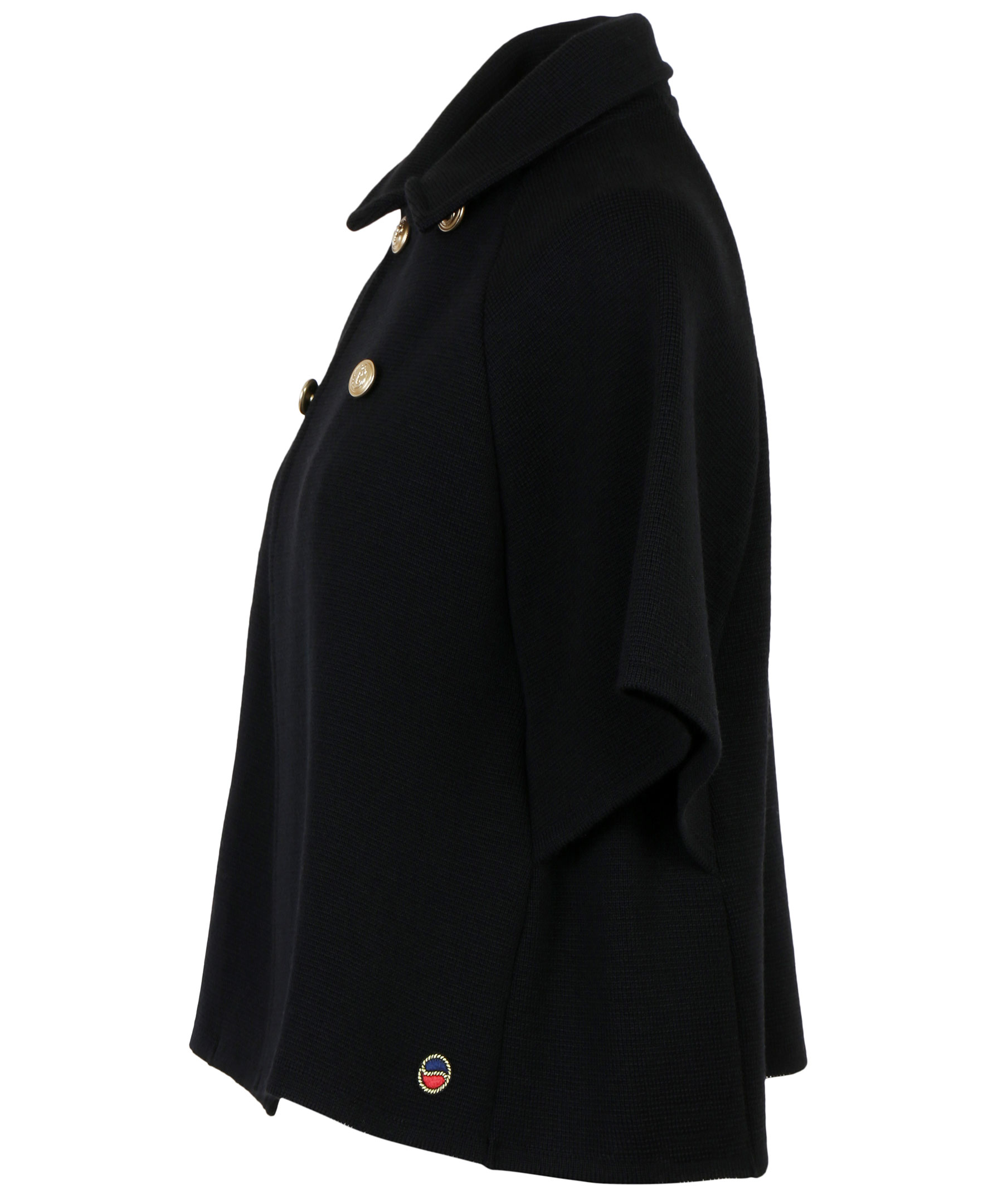 Svart stickad cape från Busnel gjord i 100% ull. Capen har en snygg krage,dubbelknäppt med fyra guldfärgade knappar, broderad logga vid plaggslut och korta ärmar. Modellen är 174 cm lång och bär storlek S.