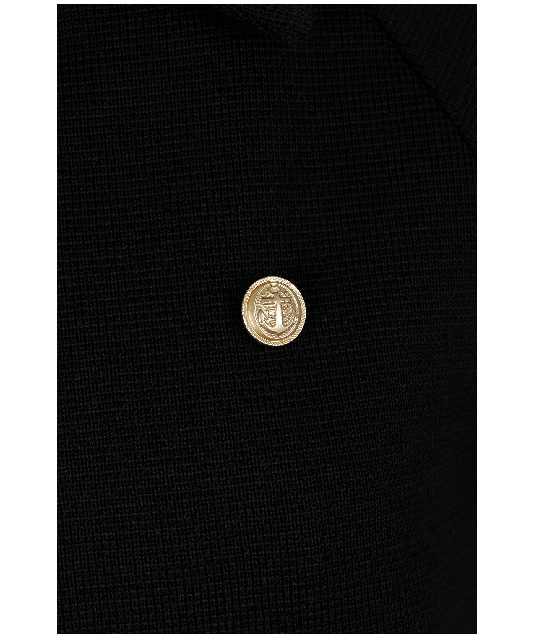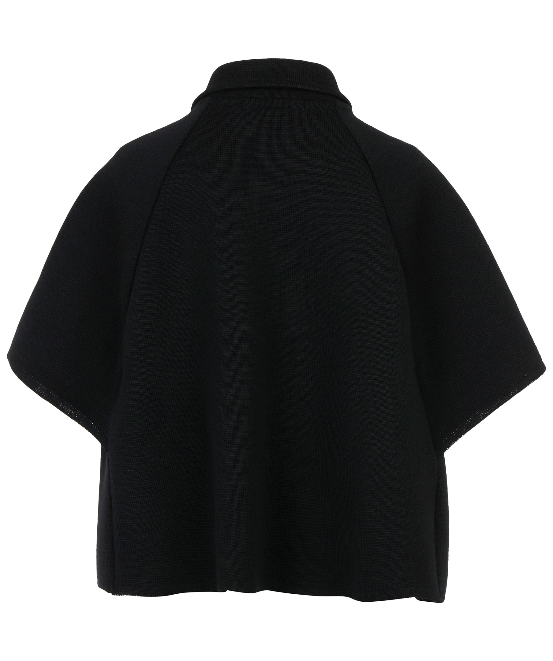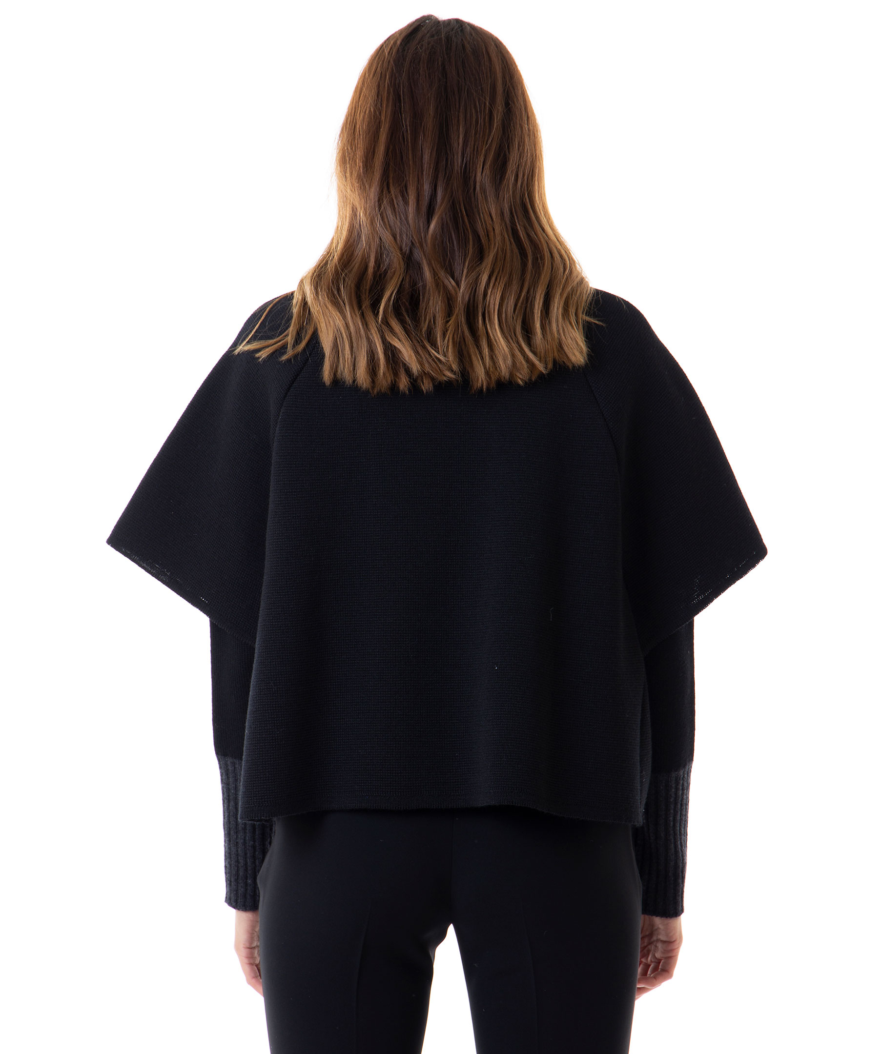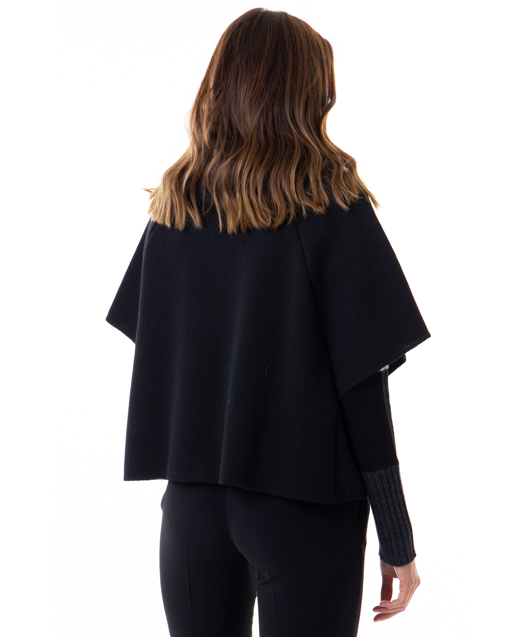 Svart stickad cape från Busnel gjord i 100% ull. Capen har en snygg krage,dubbelknäppt med fyra guldfärgade knappar, broderad logga vid plaggslut och korta ärmar. Modellen är 174 cm lång och bär storlek S.