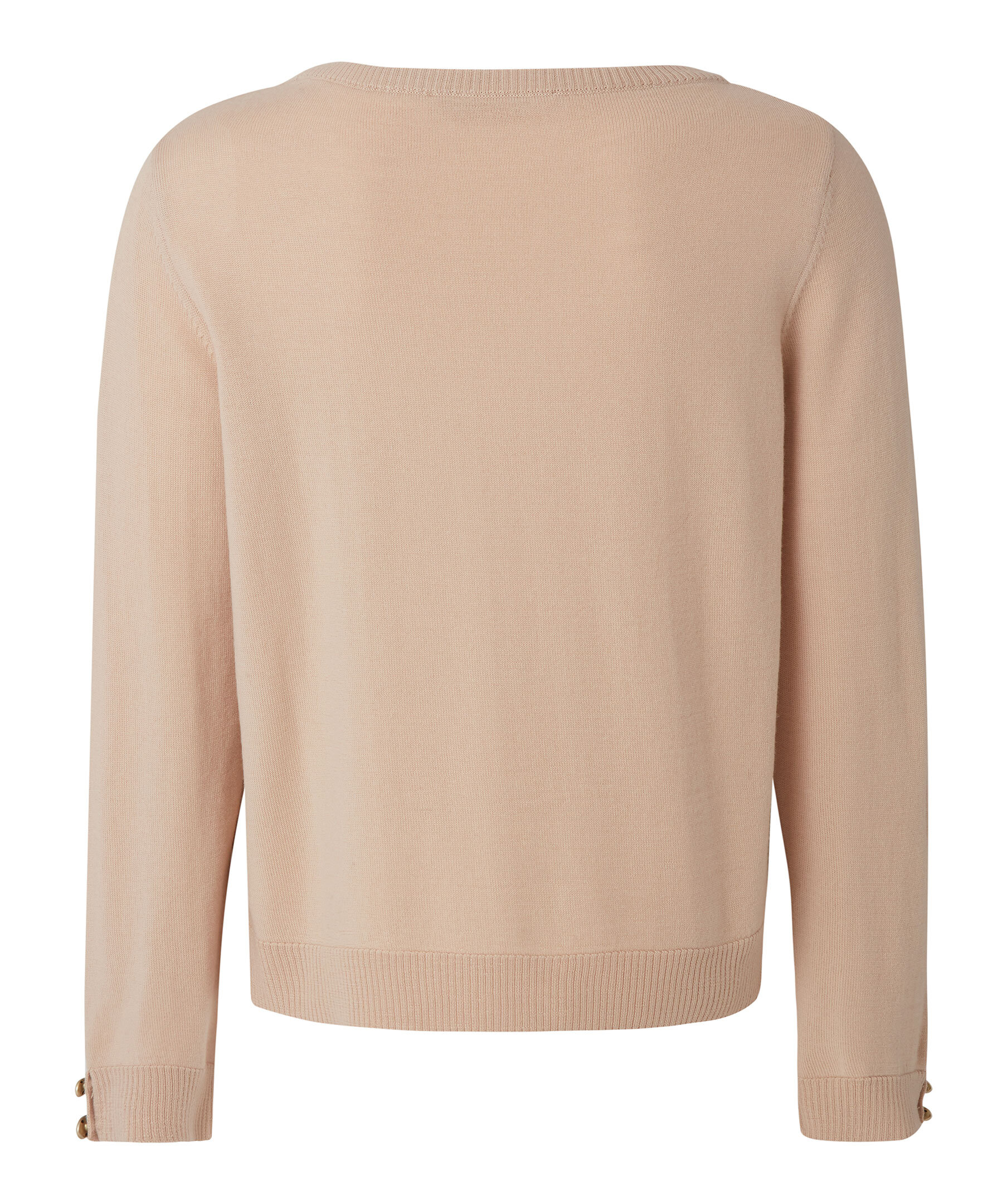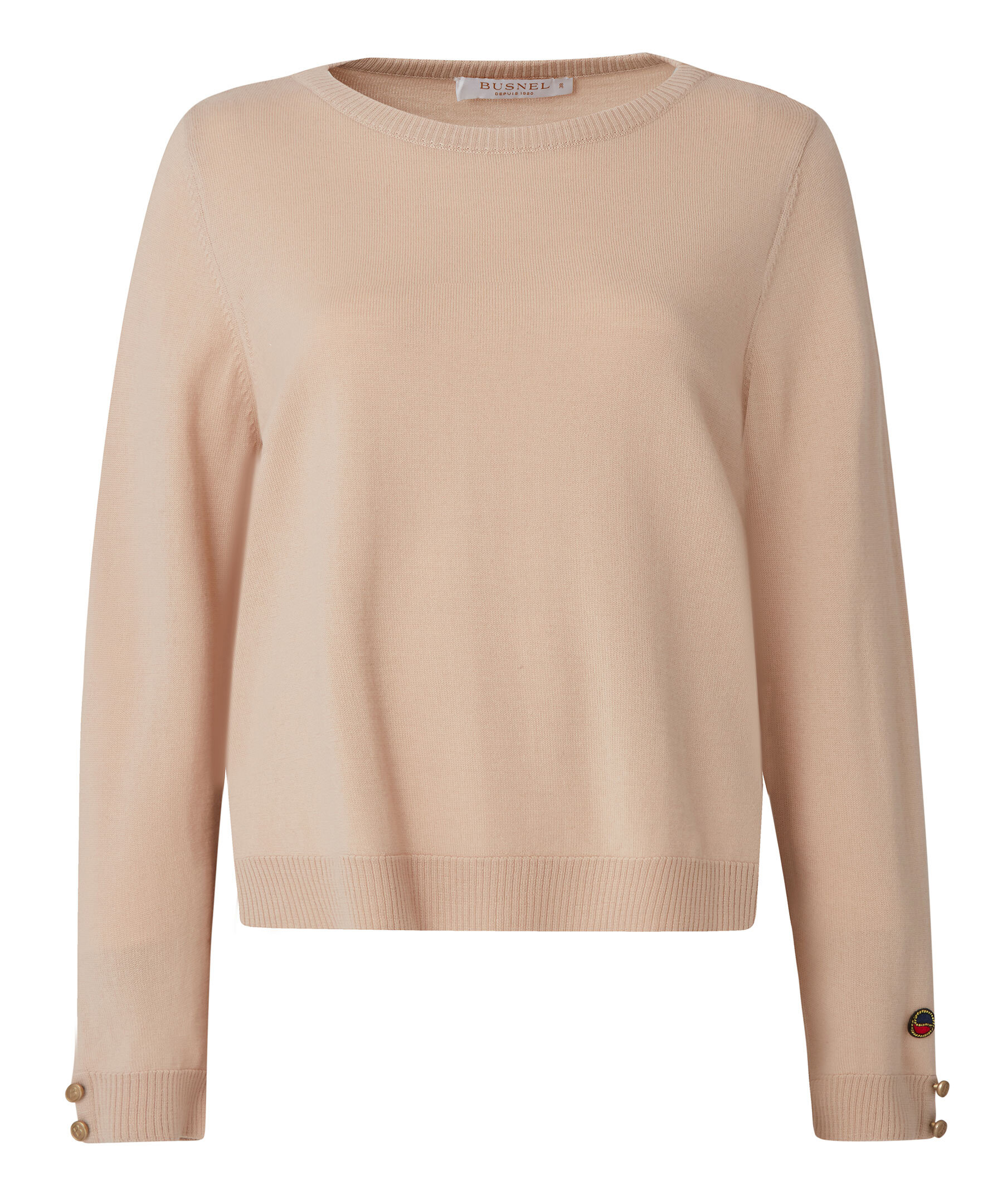 Ljusbeige, finstickad tröja i mjukaste merinoull från Busnel. Detaljerad med två gyllene B-knappar på ärmsluten och en slits på varje sida. Broderad logotyp på ena ärmslutet och hög, rundad halsringning. Passar normal storlek, ta din normala storlek.
