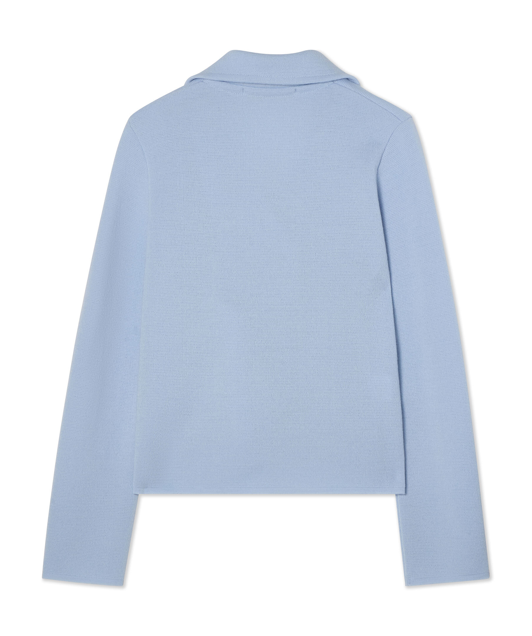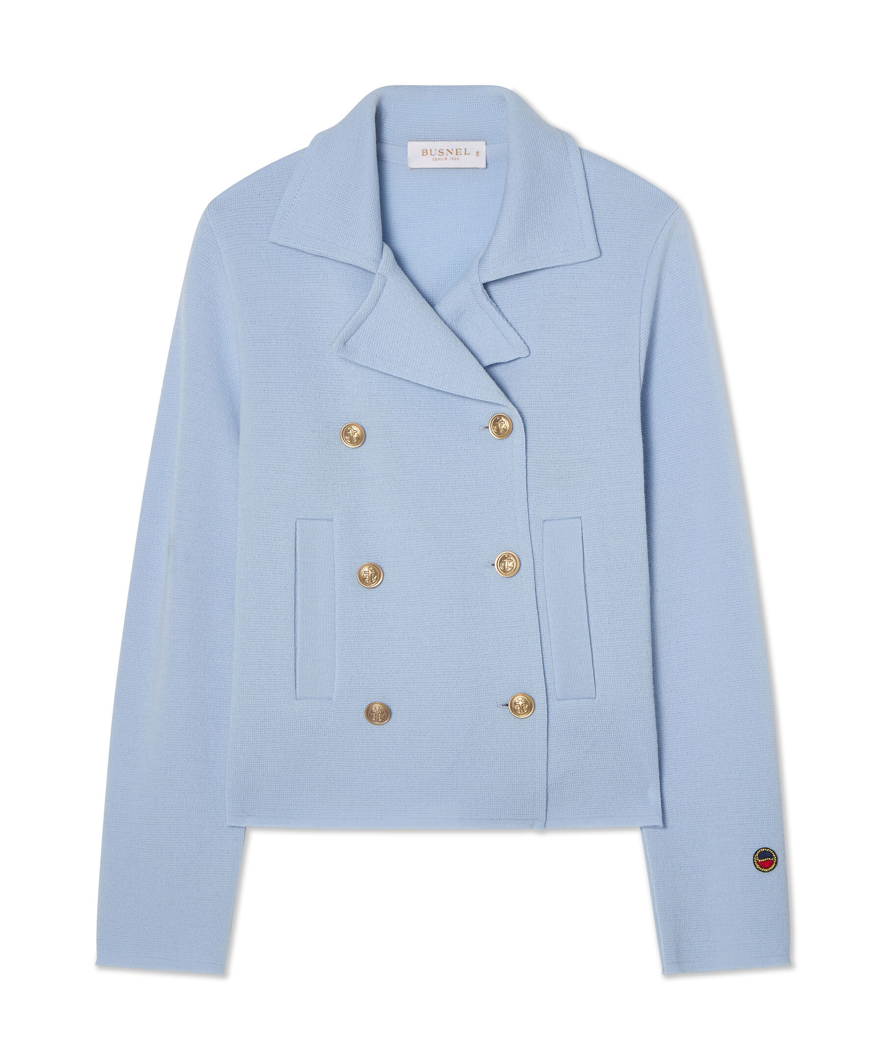 Ljusblå, stickad vårjacka från Busnel. Jackan stängs med guldfärgade knappar och har två sidfickor. Kan bäras som en kort kavaj eller ett ytterplagg. Tillverkad i 100% ull.