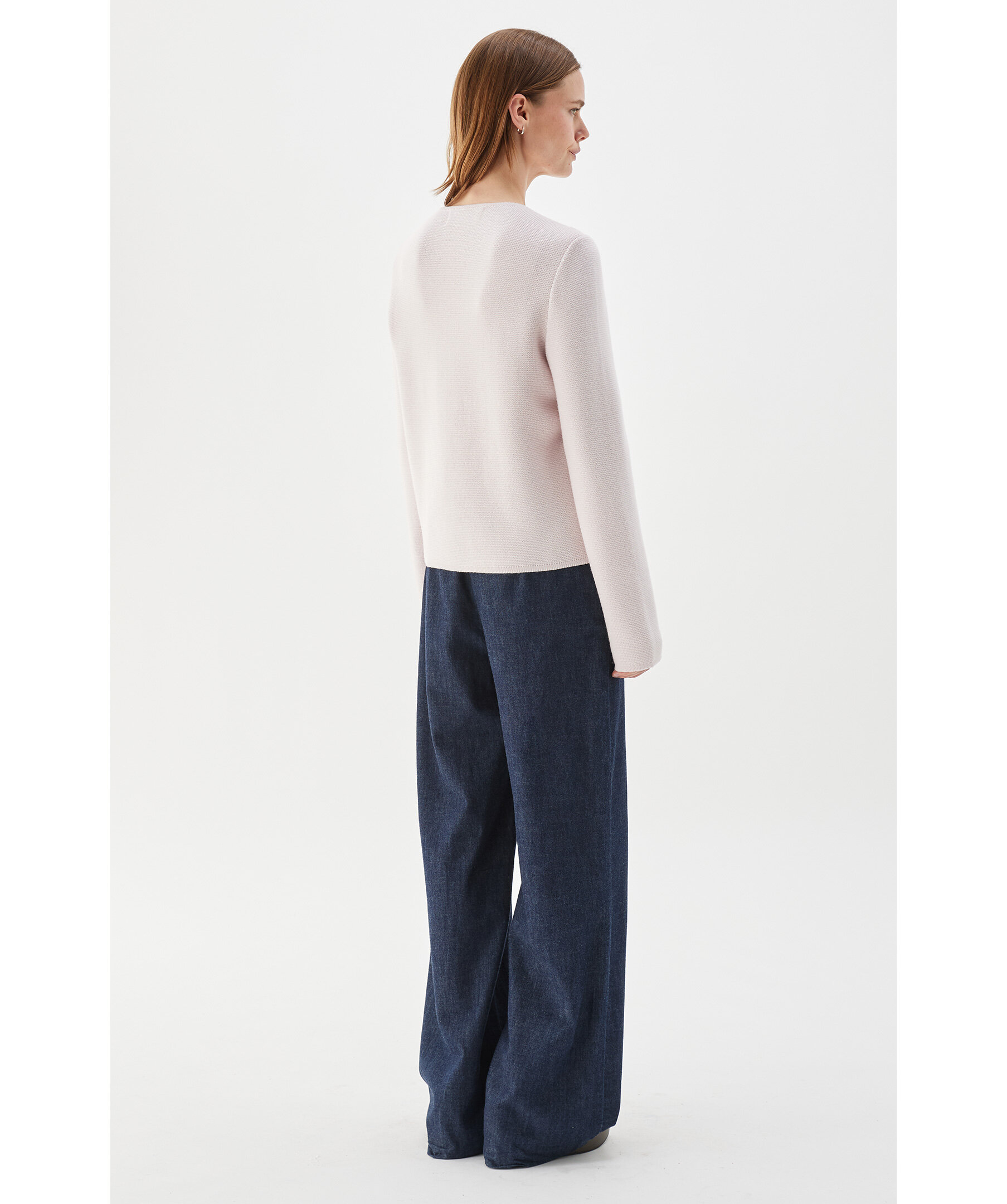 Ljusrosa dunjacka från Busnel - stickade ärmar och bakstycke för en feminin silhuett. Perfekt för vår, höst och mild vinter med en elegant, minimalistisk look.