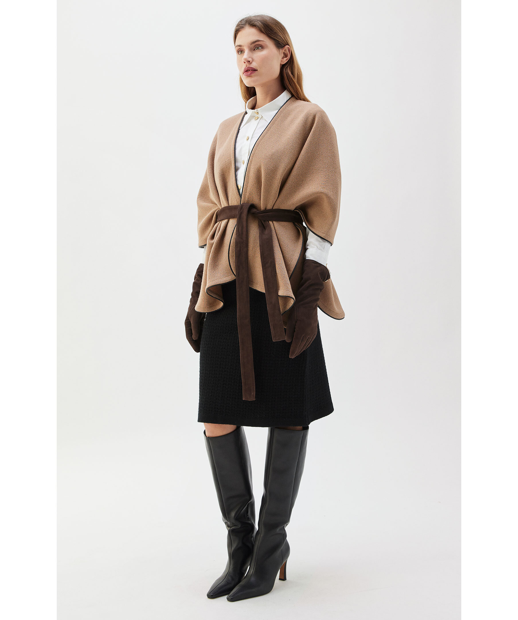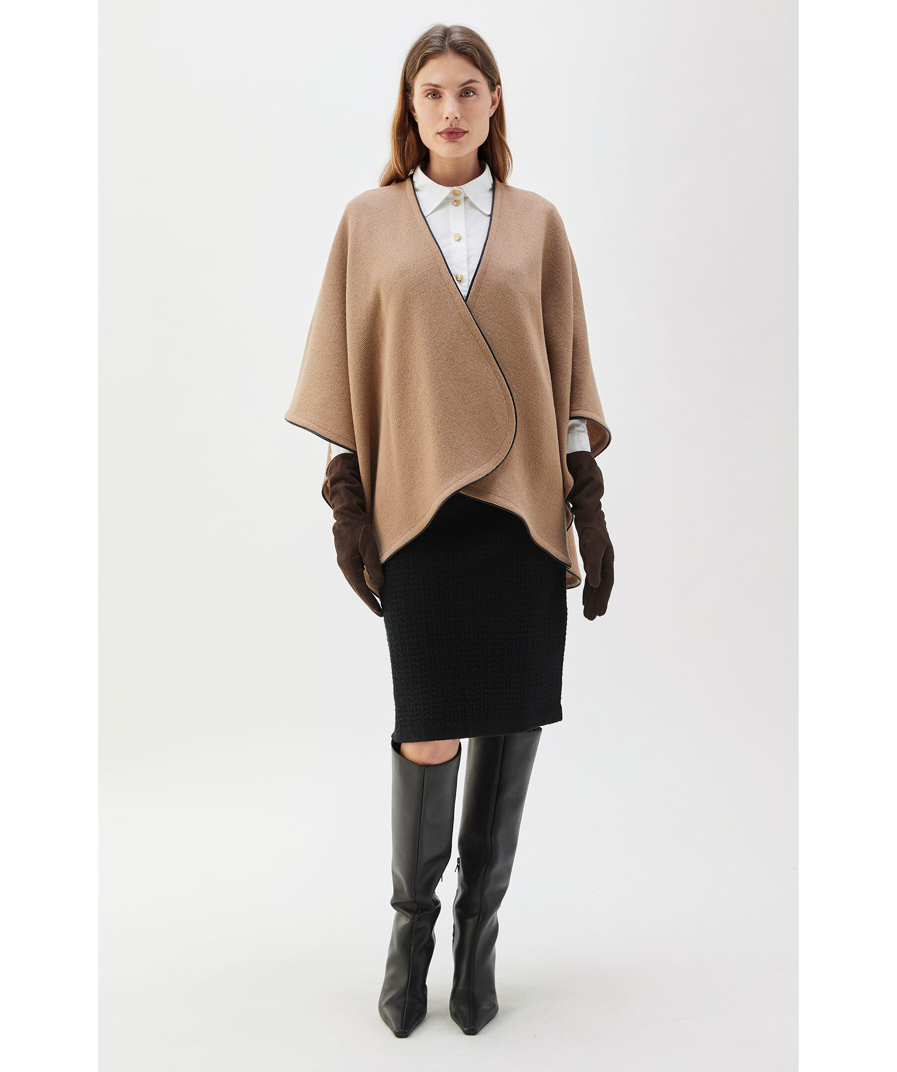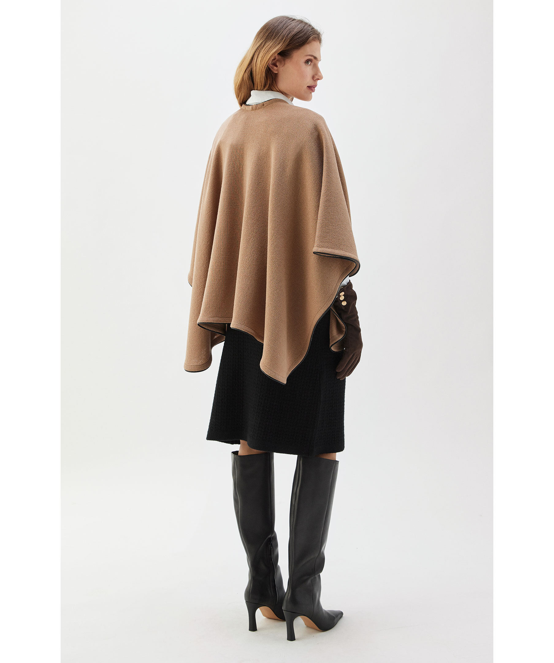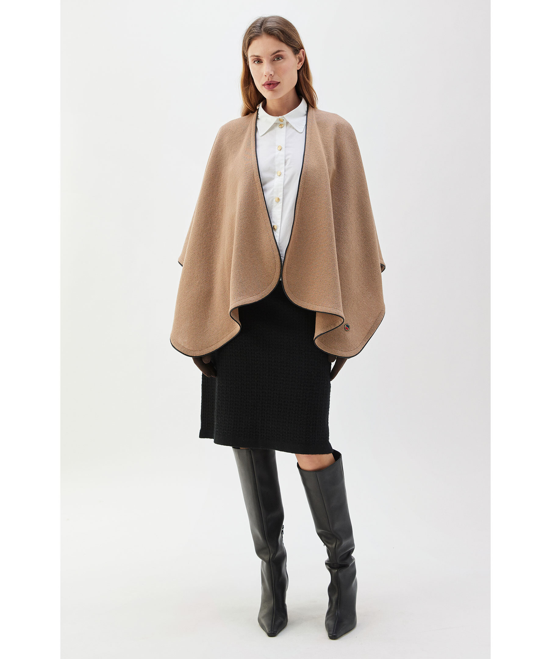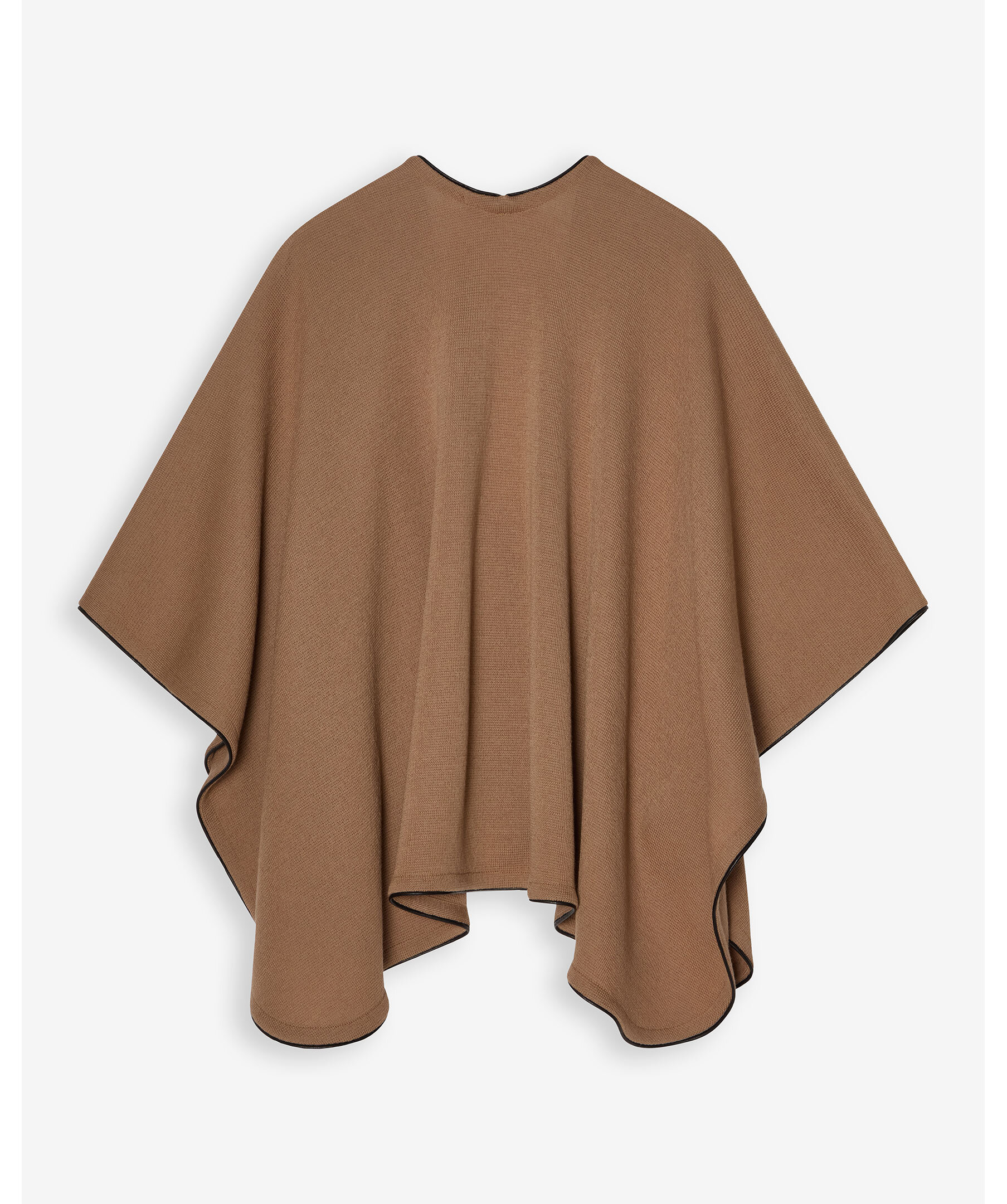 Beige poncho med smala, svarta kanter från Busnel. Ponchon har en liten logotyp i nederkant och är tillverkad i 100% ull.
