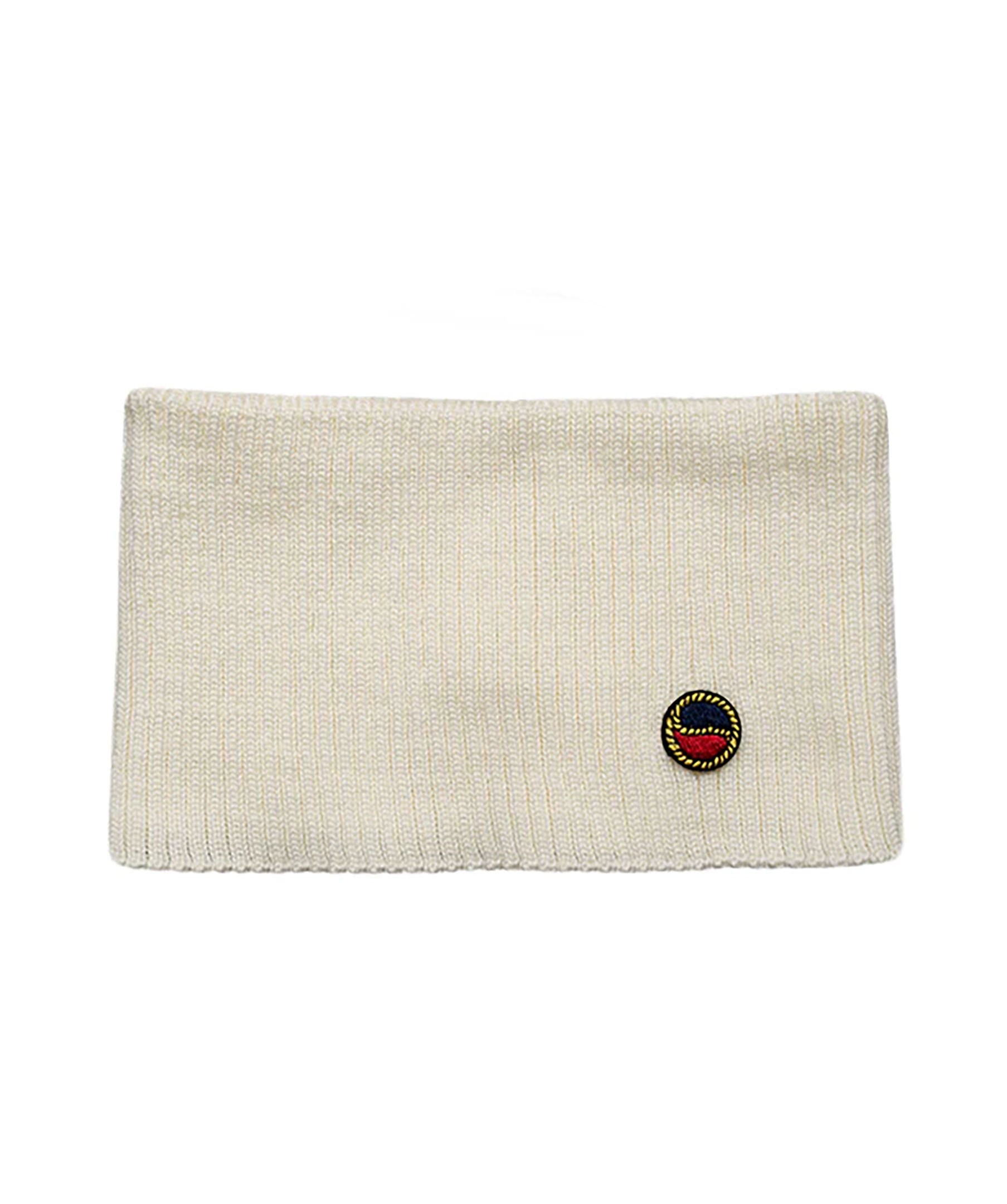 Krämvit ribbad kraghalsduk från Busnel. Kragen är gjord i fint merinoull och har en broderad logotyp på ena nederkanten.