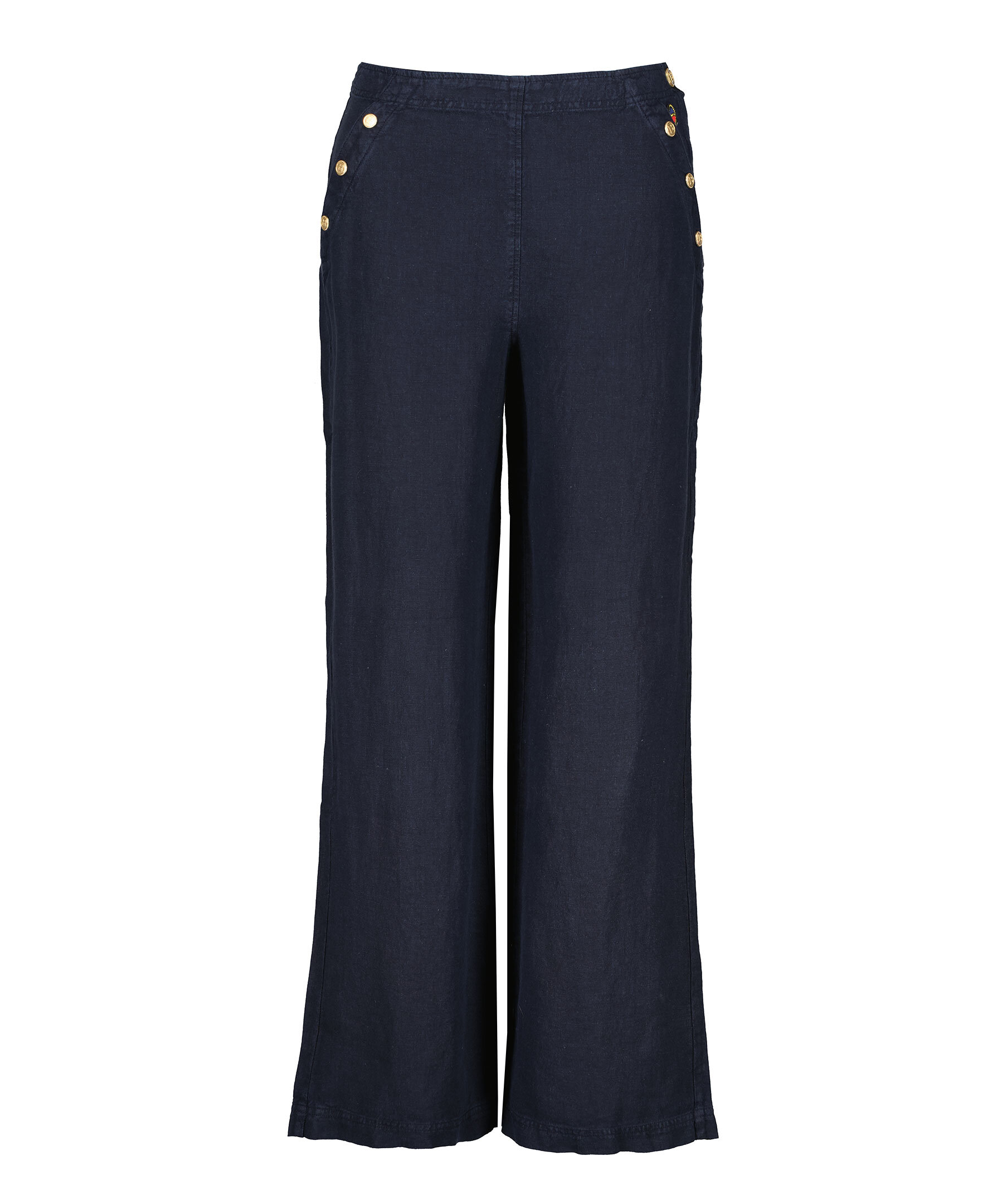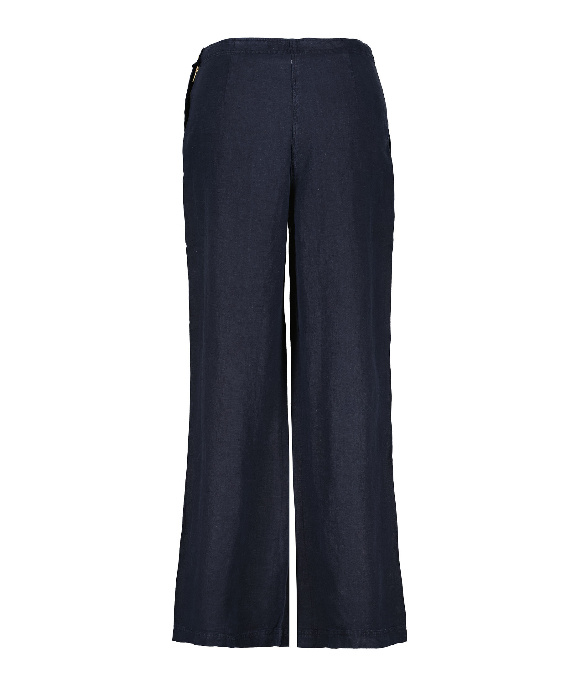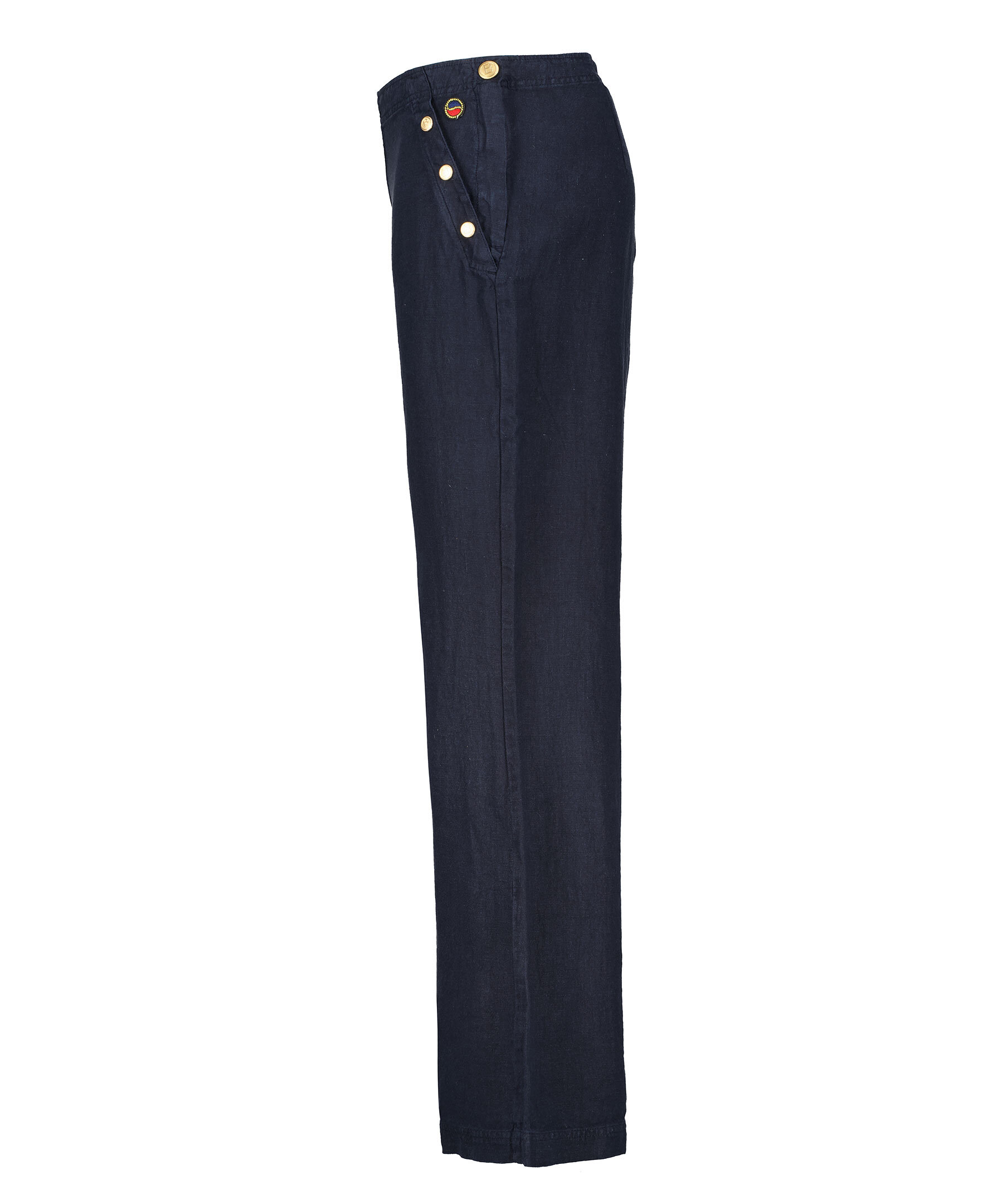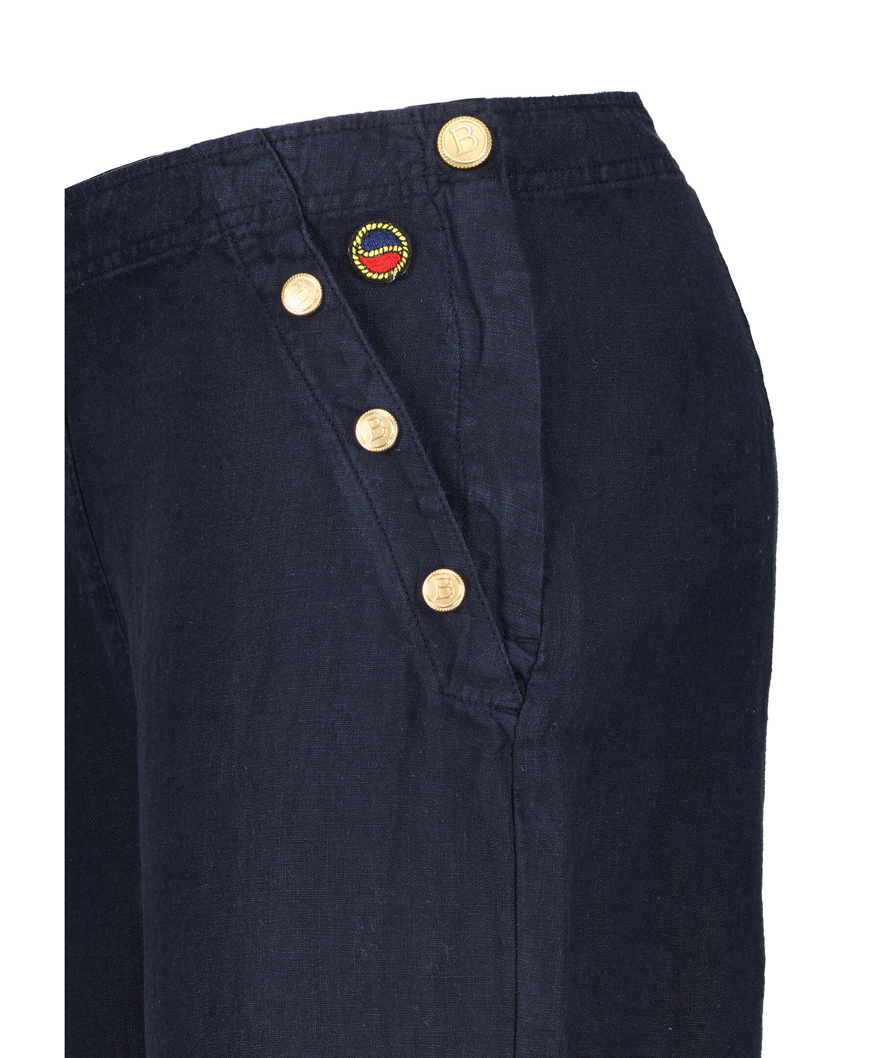 Marinblåa linnebyxor från Busnel. Två sidfickor med tre gyllene B-knappar vid vardera ficka. Byxorna stängs med en dold dragkedja på vänster sida och en gyllene B-knapp. Tillverkade i 100% linne.