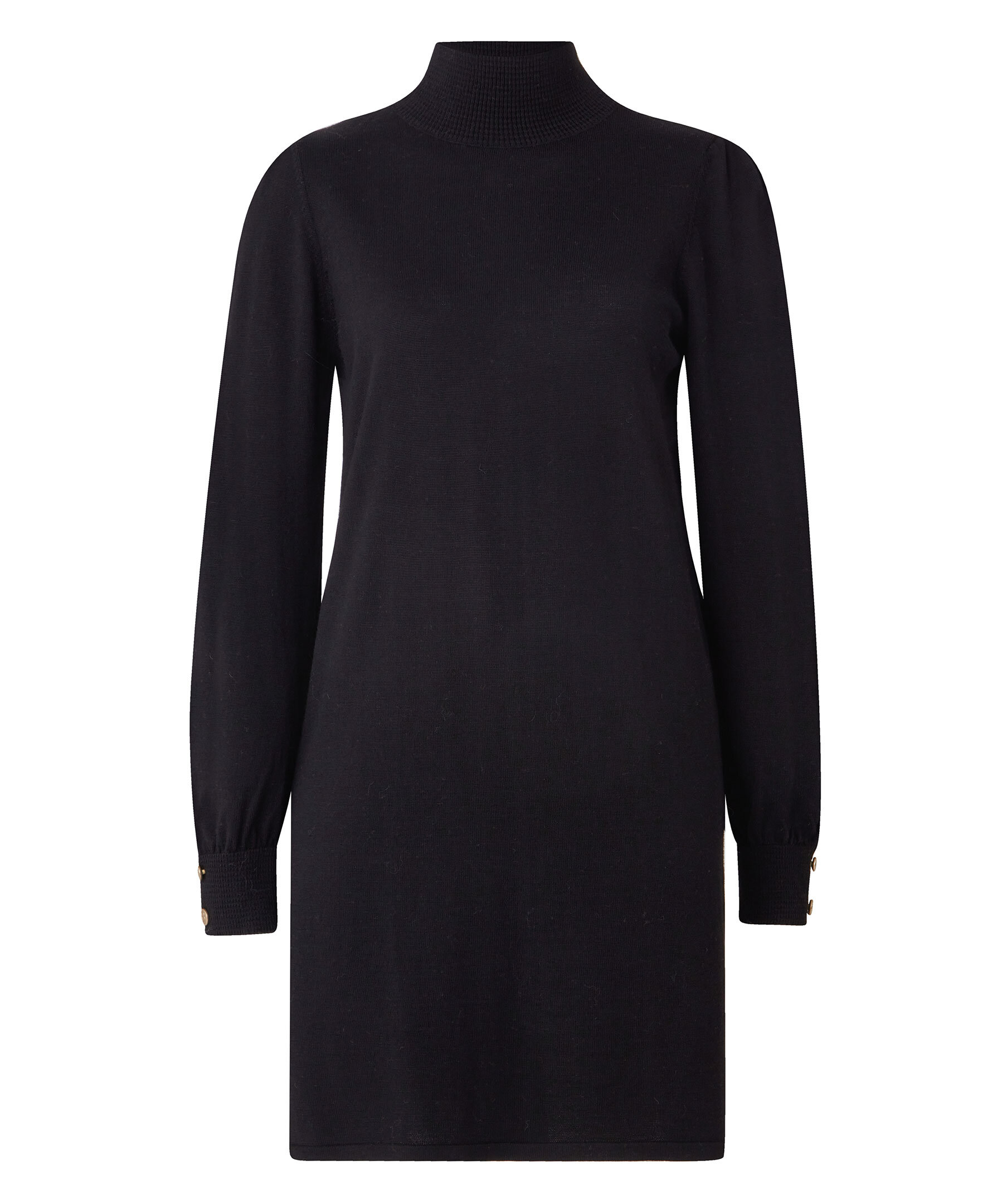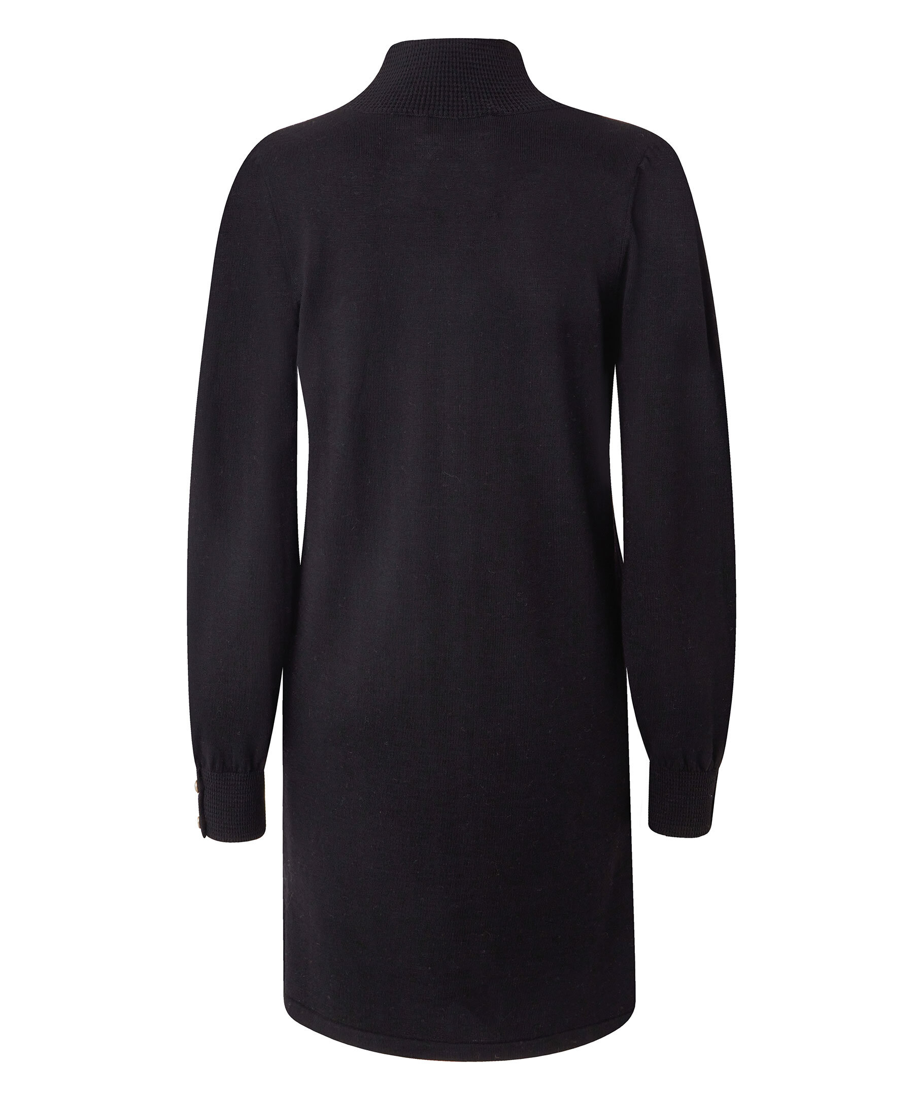 Svart, finstickad klänning som är både bekväm och smickrande från Busnel. Dekorerad med en polokrage med elastisk mudd och puffiga ärmar från axeln och mudd i ärmslutet och två guldfärgade B-knappar på varje manschett. Normal i storlek och slutar på den övre delen av låret.