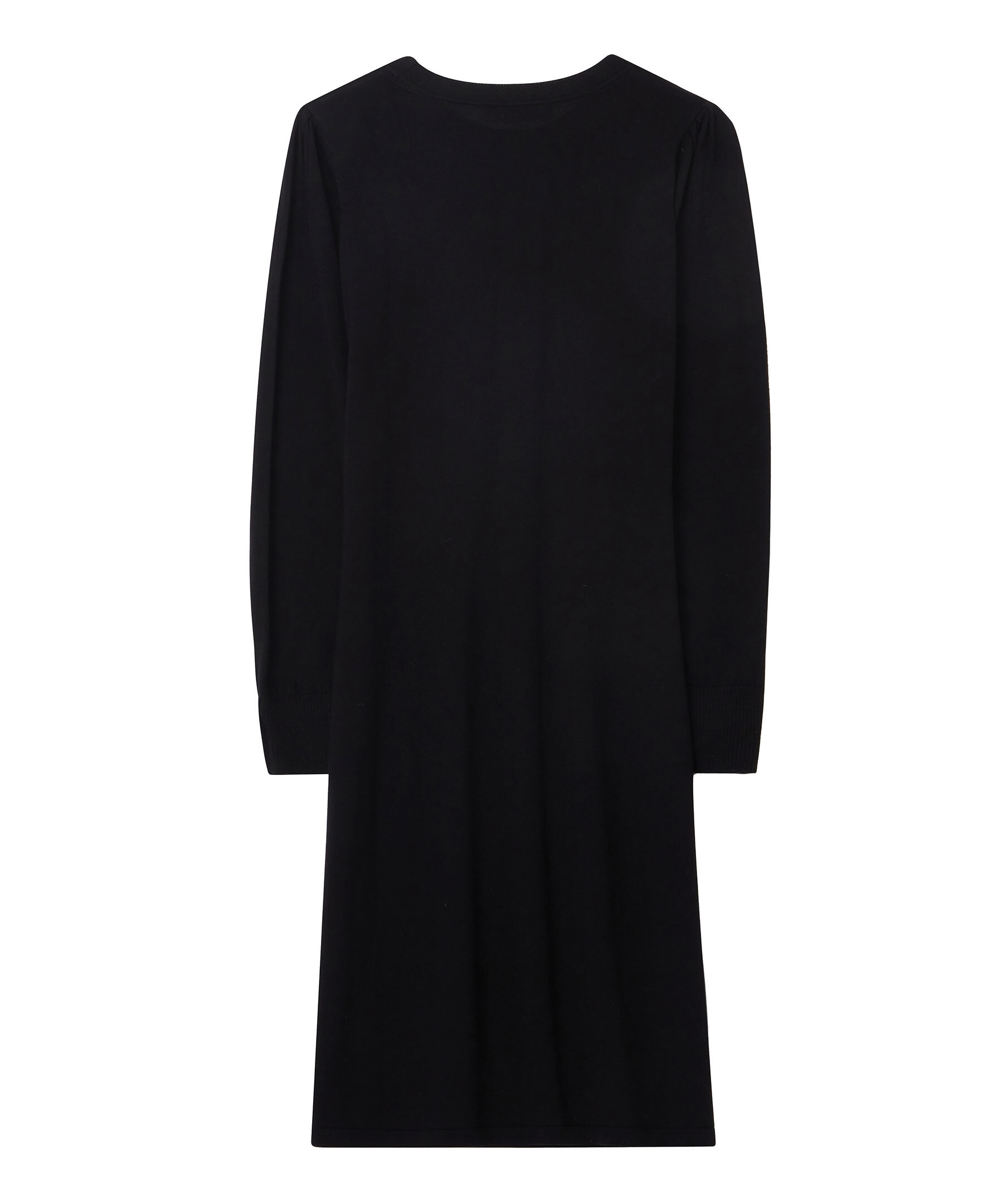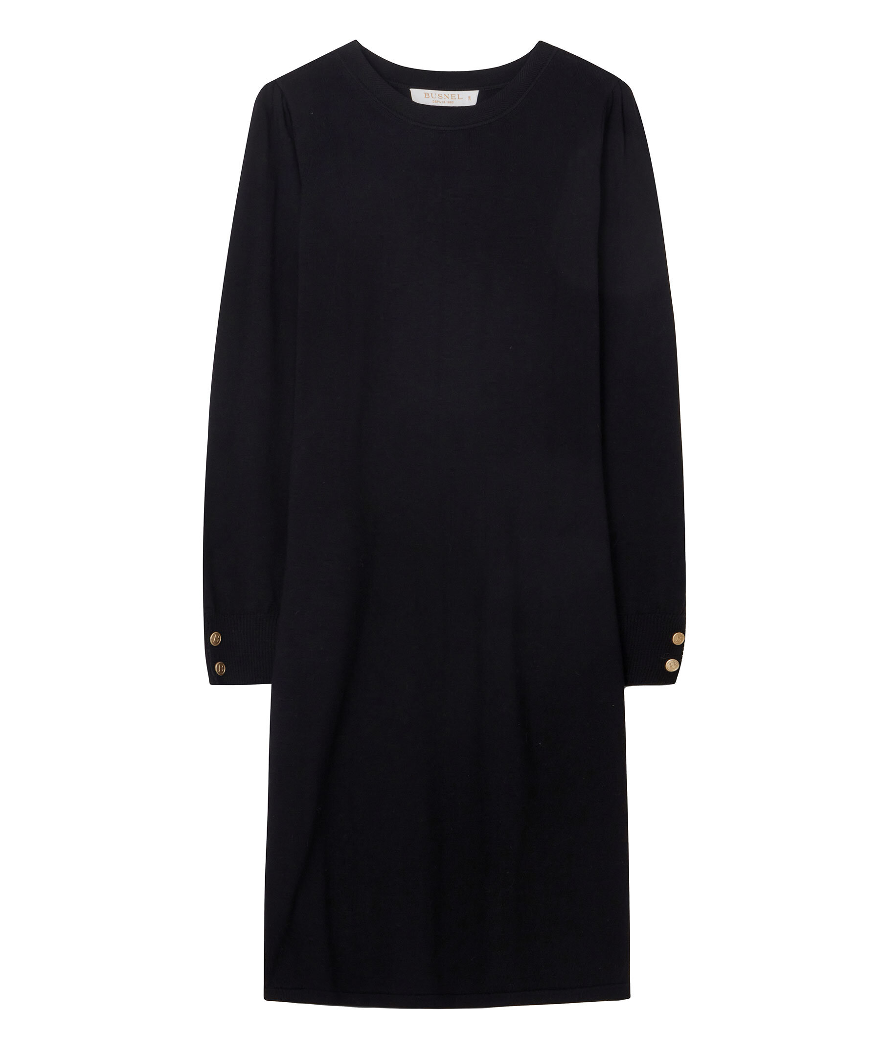 Svart klänning från Busnel. Tillverkad i 100% Merinoull. Rundad halsringning. Guldfärgade knappar vid ärmslut. Klänningen har en diskret puffärm.