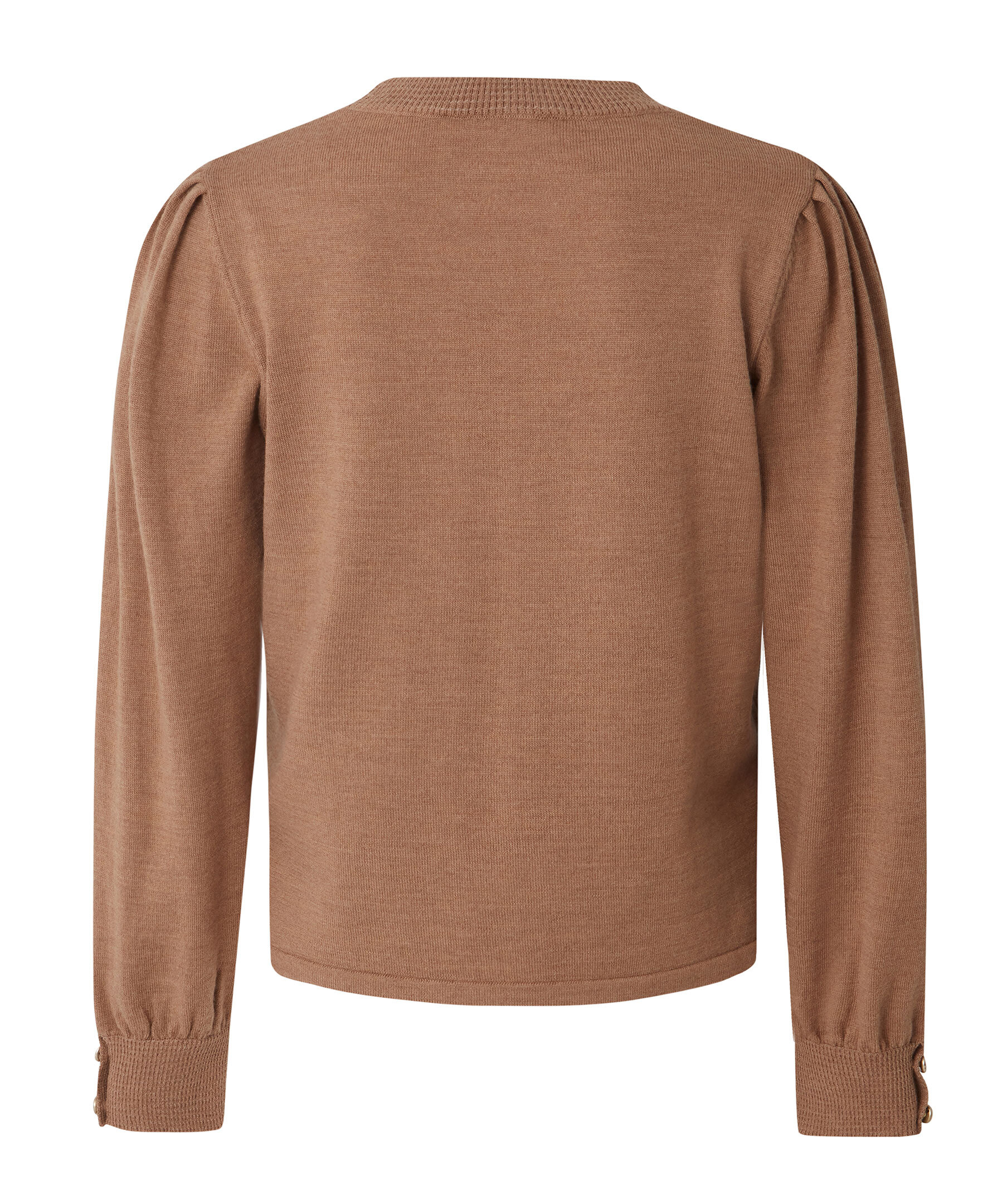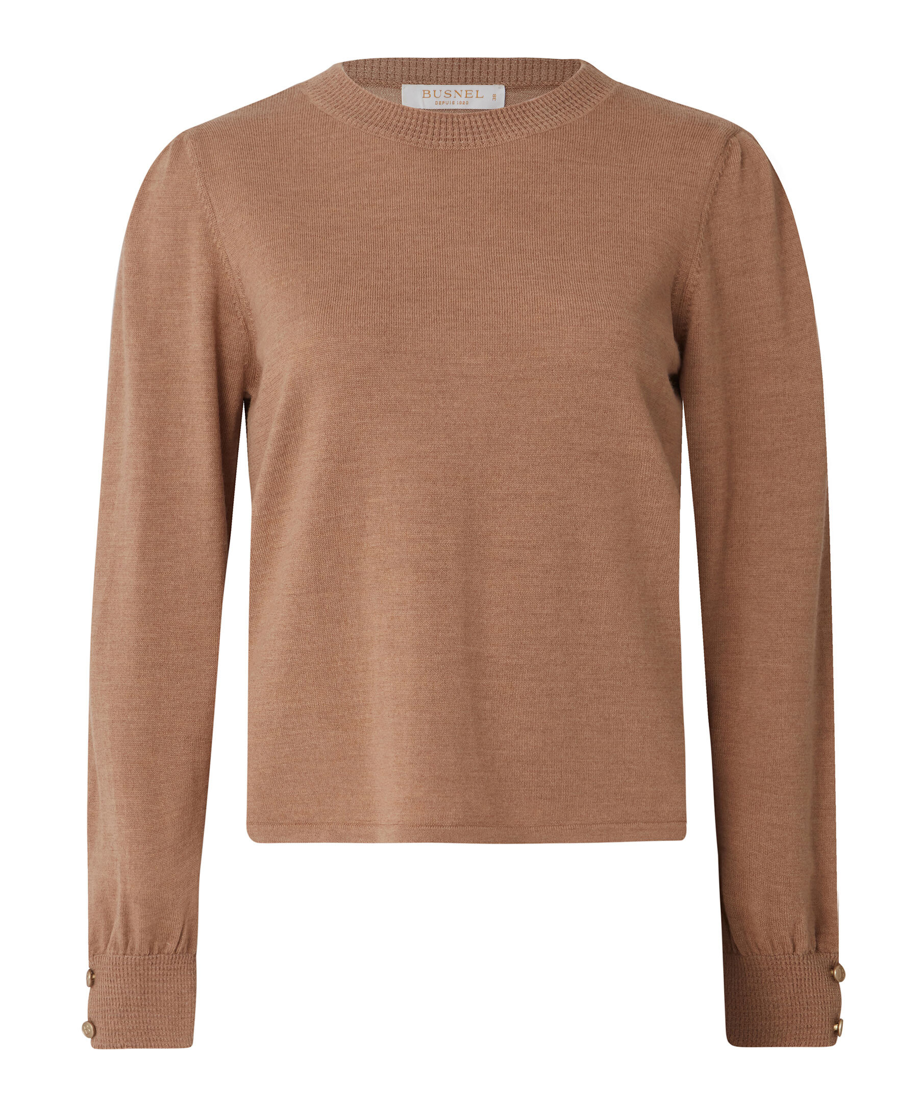 Kamelfärgad, finstickad tröja från Busnel. Denna topp är skuren i en rak siluett med en slits på varje sida. Den har en avslappnad passform med puffiga axlar och är dekorerad med två gyllene B-knappar i ärmsluten. Hög rundad halsringning och broderad logotyp på ena ärmslutet. Passar normal storlek, ta din normala storlek.