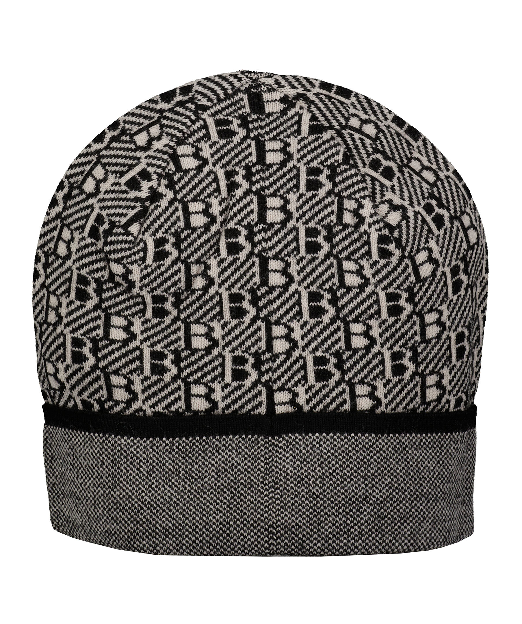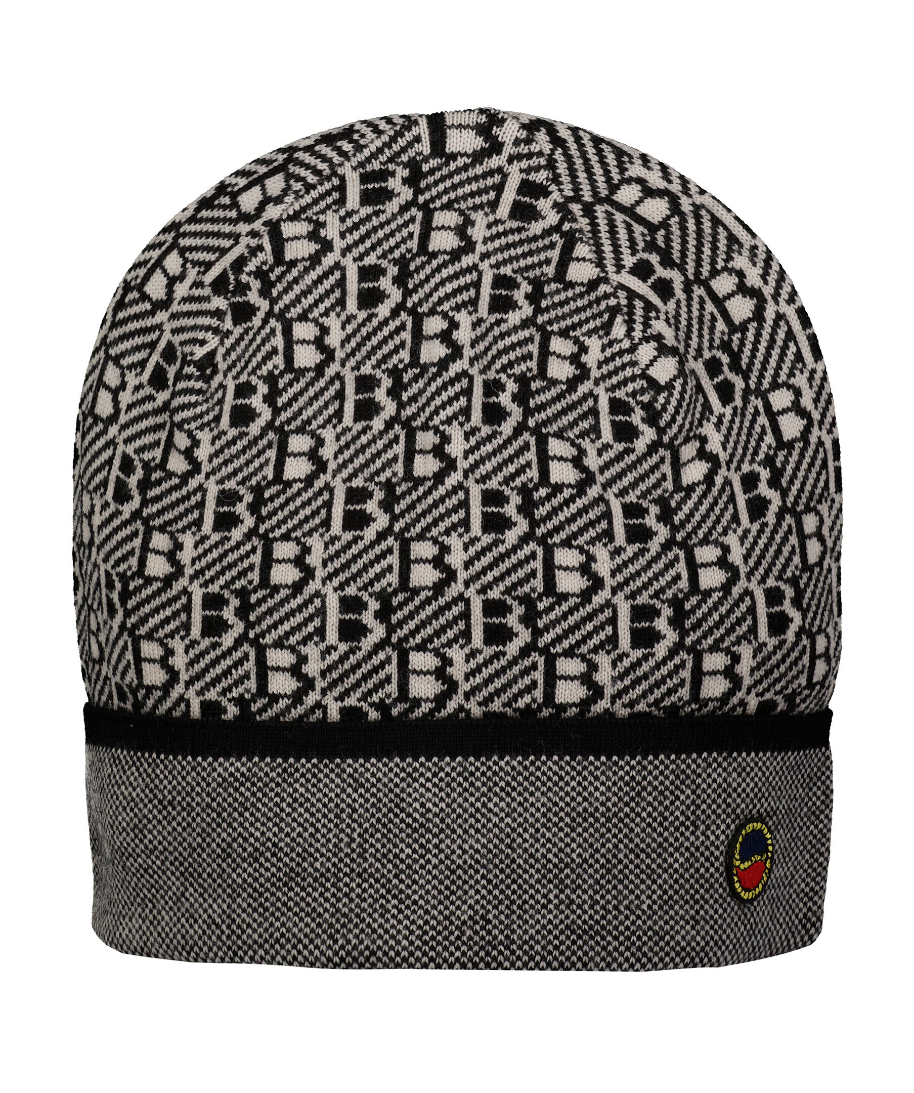 Finstickad mössa från Busnel med logo-mönster och grå uppvikt kant med svart rand. Liten broderad logotyp på sidan. Tillverkad i 100% extra fin merinoull.