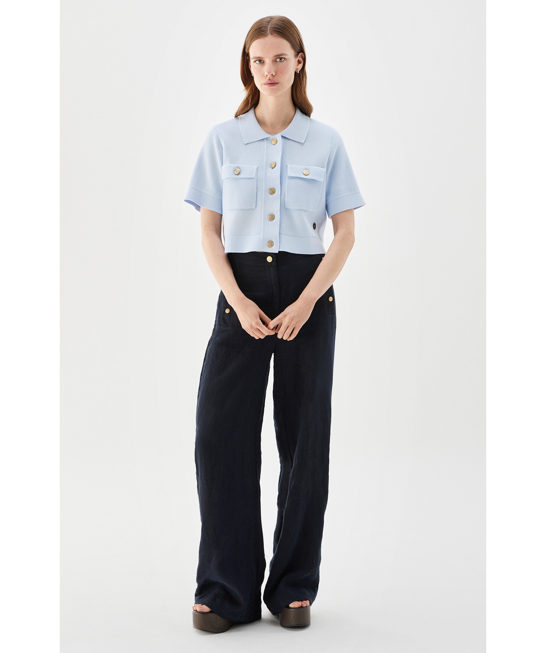 Ljusblå jacka från Busnel – en kort, elegant bomullsjacka med clean design och subtil struktur. Jackan har en tidlös silhuett som passar perfekt tillsammans med skräddade byxor eller kjol för en chic vardags‑ eller kontorslook.