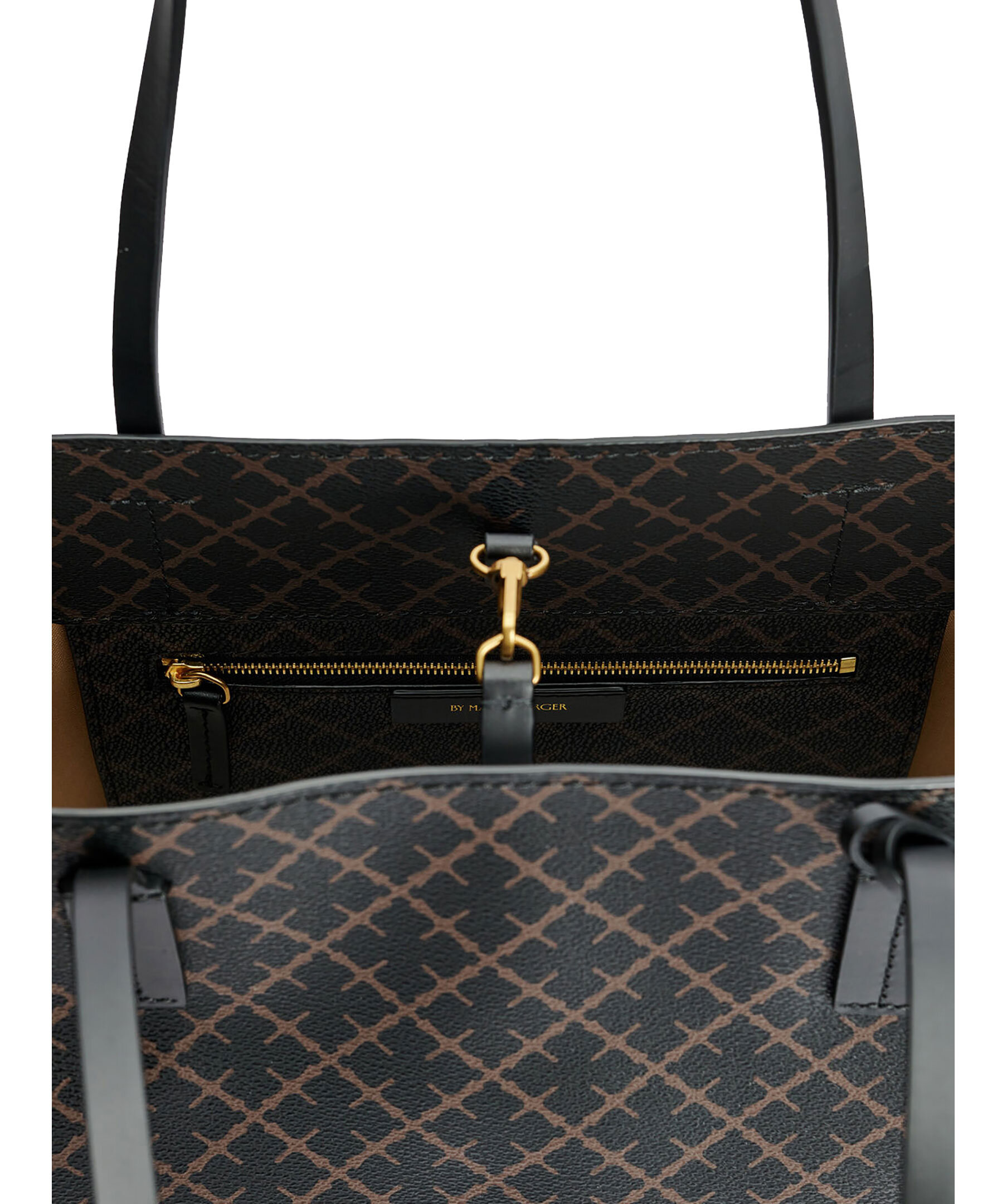 Stor svart och brun mönstrad tote väska från By Malene Birger. Signatur Flower-tryck, stängs med karbinhake och har en innerficka med dragkedja. Läderkant. Tillverkad i PVC. Mått: B: 48cm x H: 28cm x D: 12,5 cm