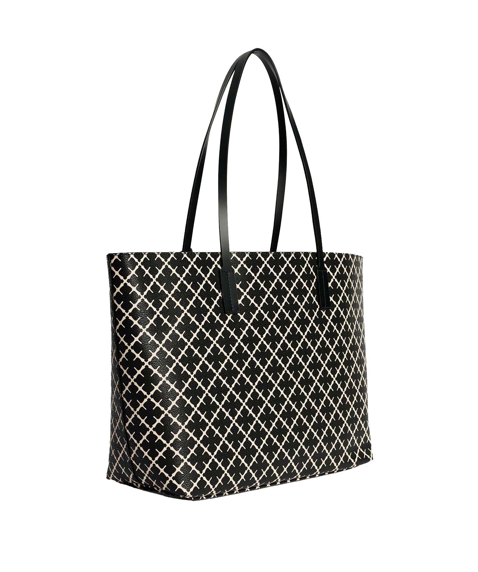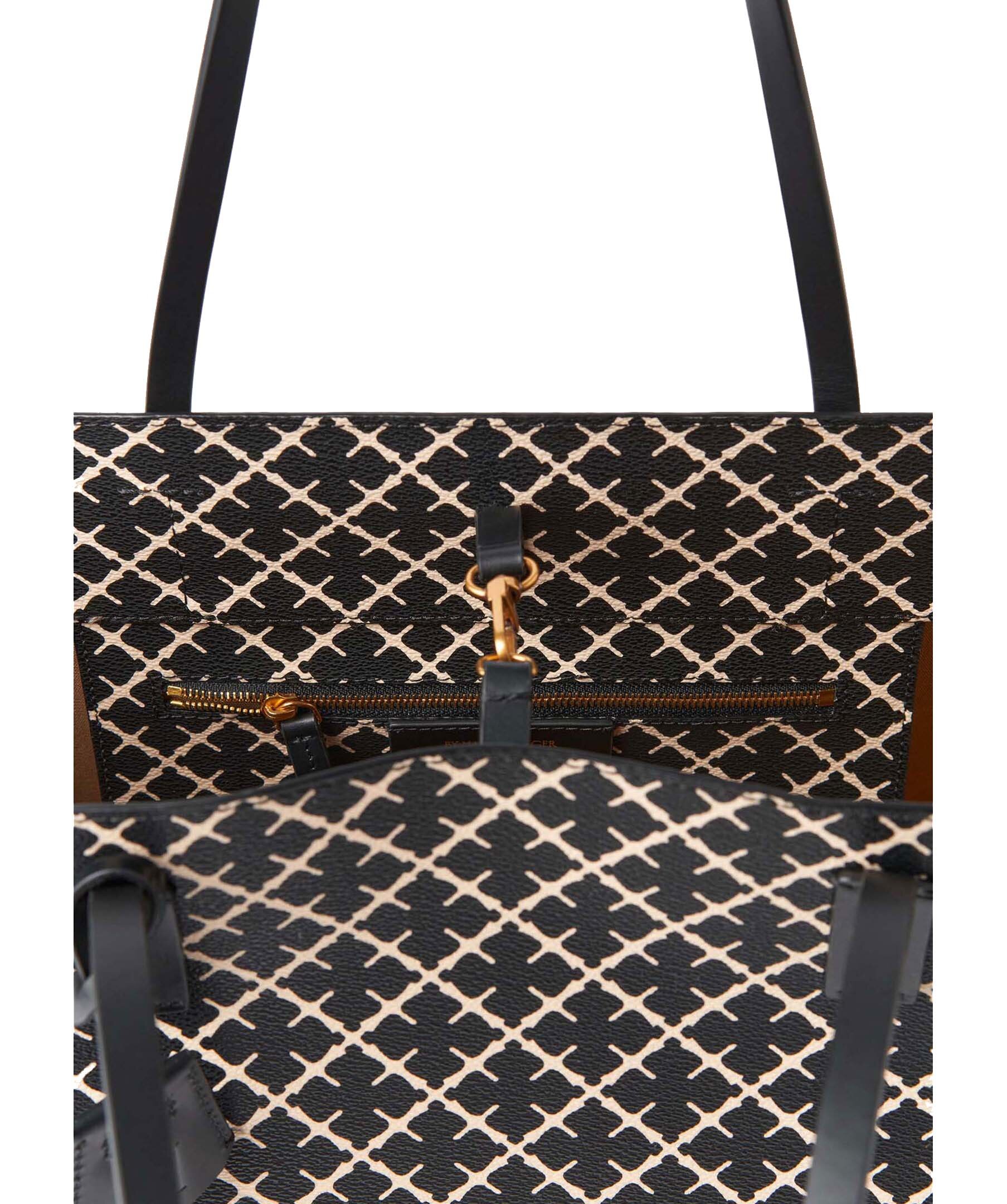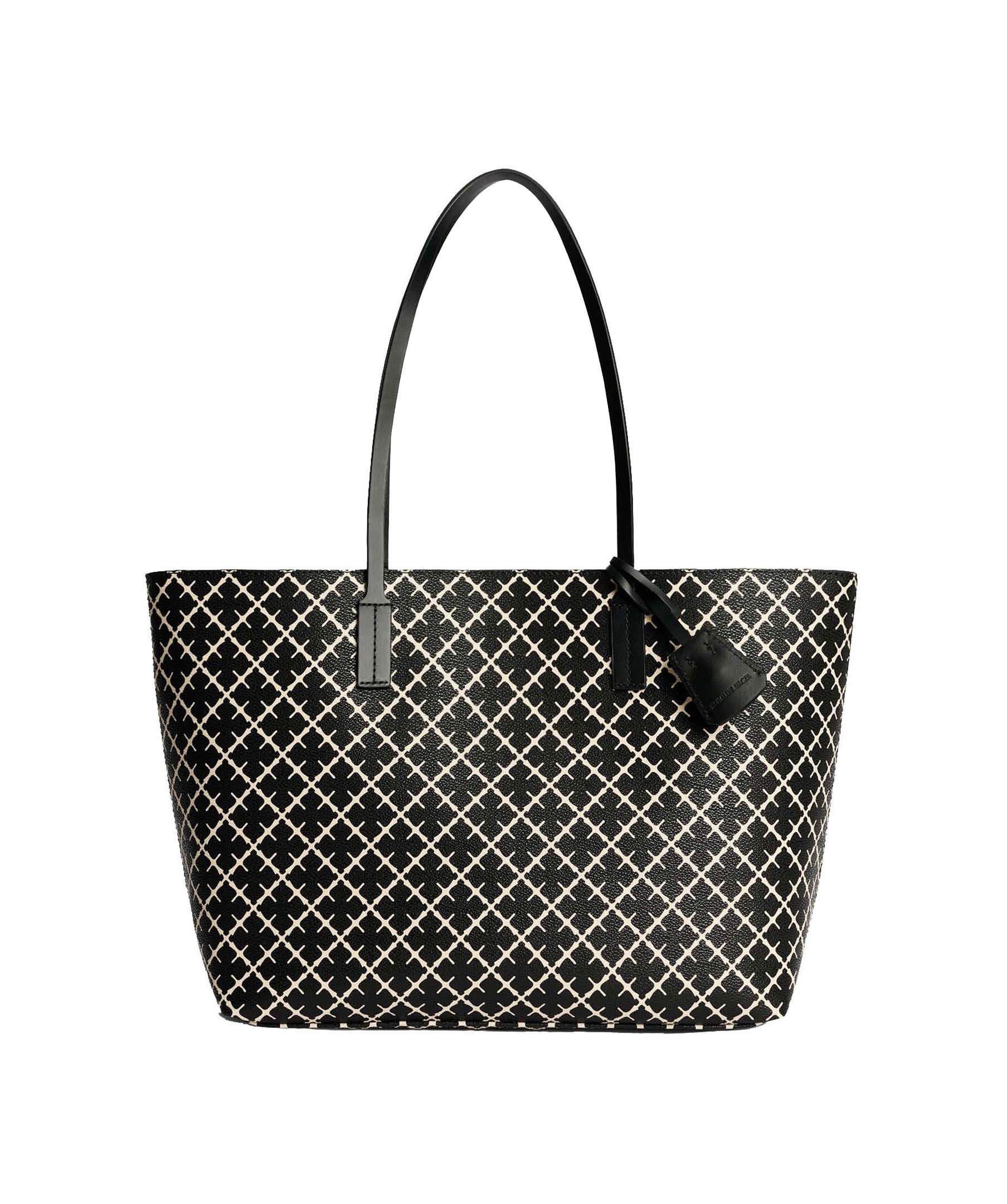 Stor svart och beige mönstrad tote väska från By Malene Birger. Signatur Flower-tryck, stängs med karbinhake och har en innerficka med dragkedja. Läderkant. Tillverkad i PVC. Mått: B: 48cm x H: 28cm x D: 12,5 cm