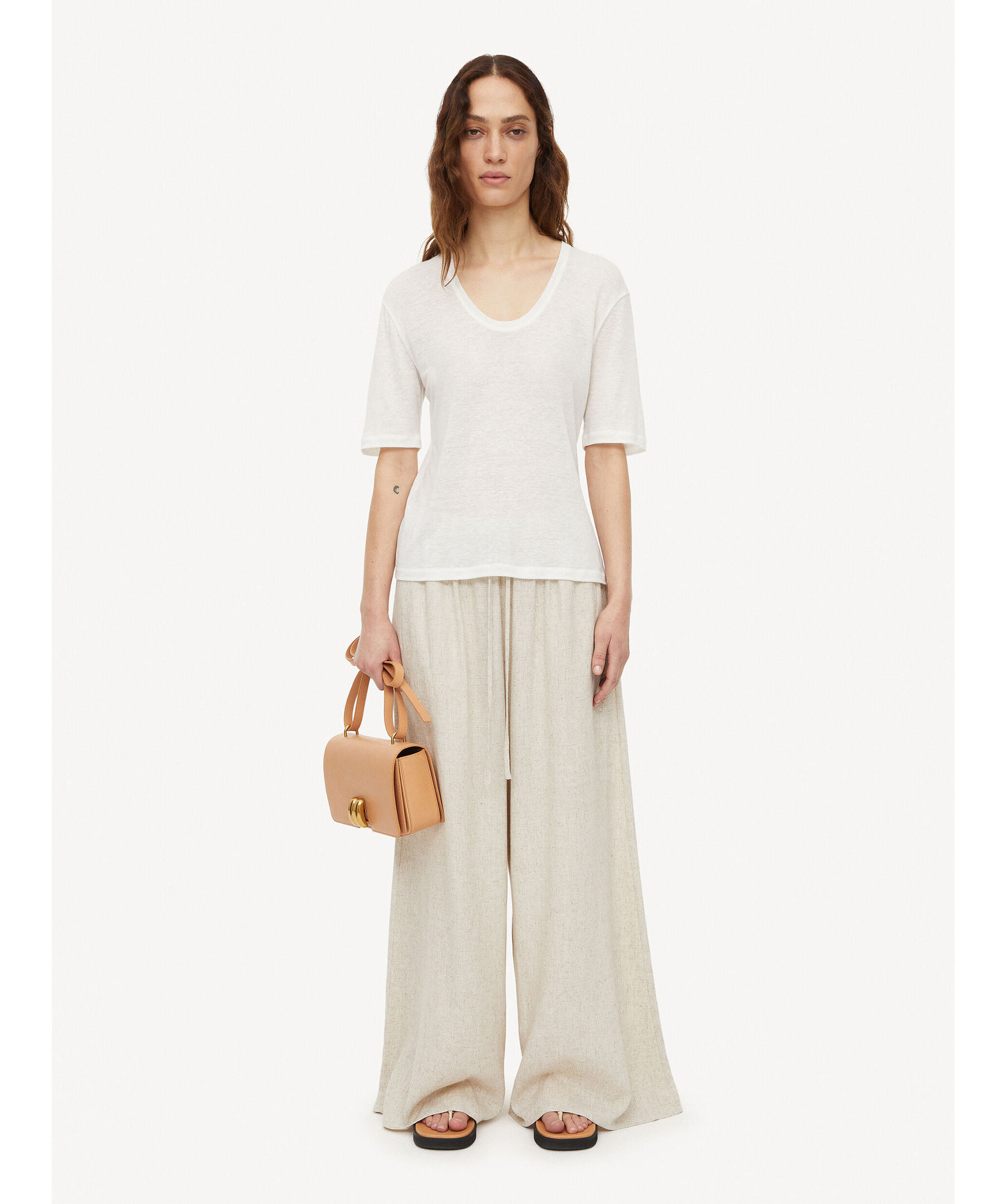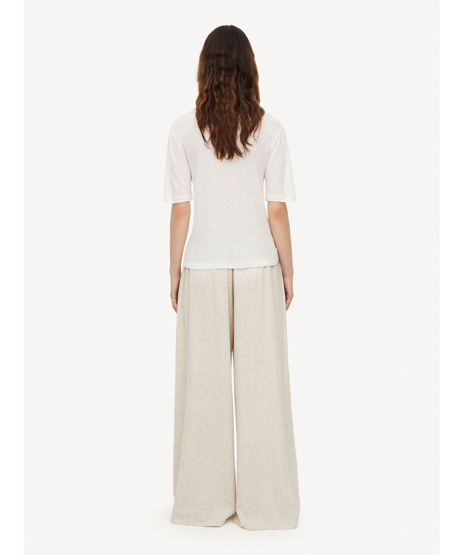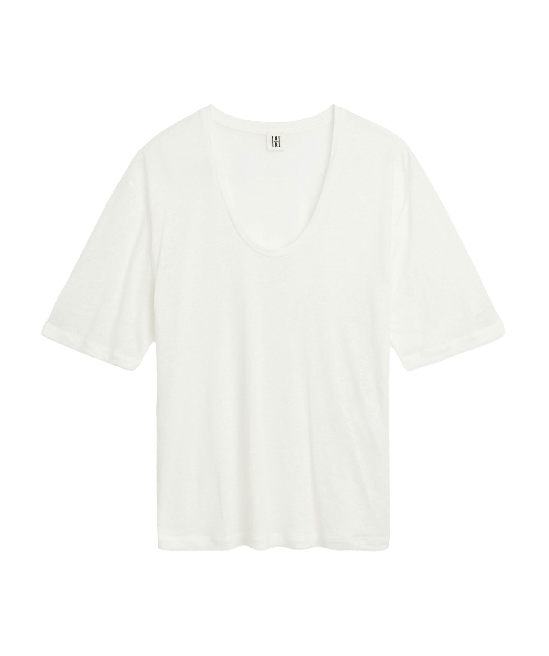 Vit t-shirt från By Malene Birger. T-shirten har en djup urringning och är gjord i en mjuk blandning av lyocell och lin. Modellen är 175cm lång och har på sig strl S. Modellen är 175cm lång och har på sig strl S.