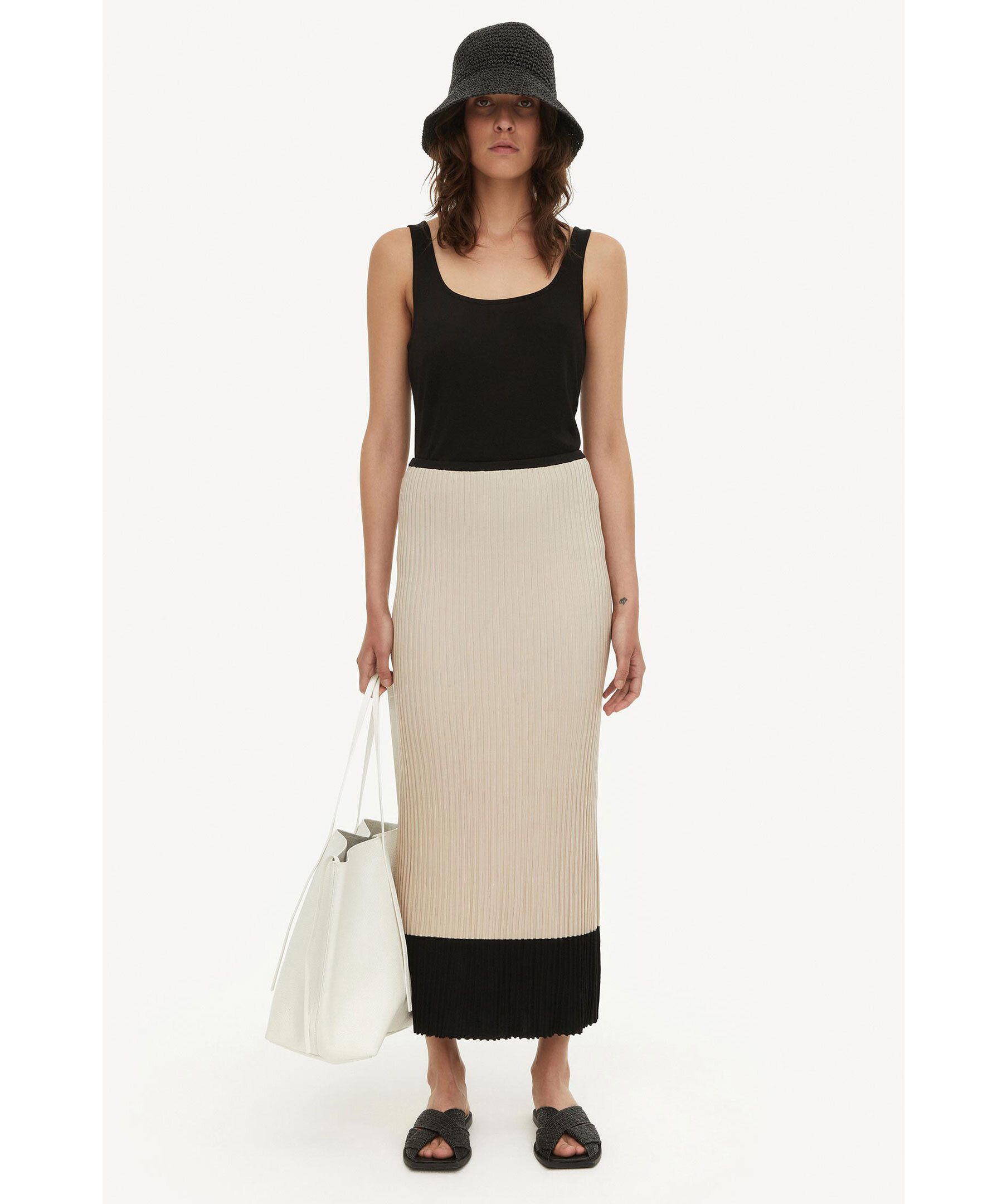 Sandfärgad, ribbstickad långkjol från By Malene Birger. Tillverkad i viskosblandning. Rak passform som slutar vid vristen samt har en svart, bred kant nedtill.