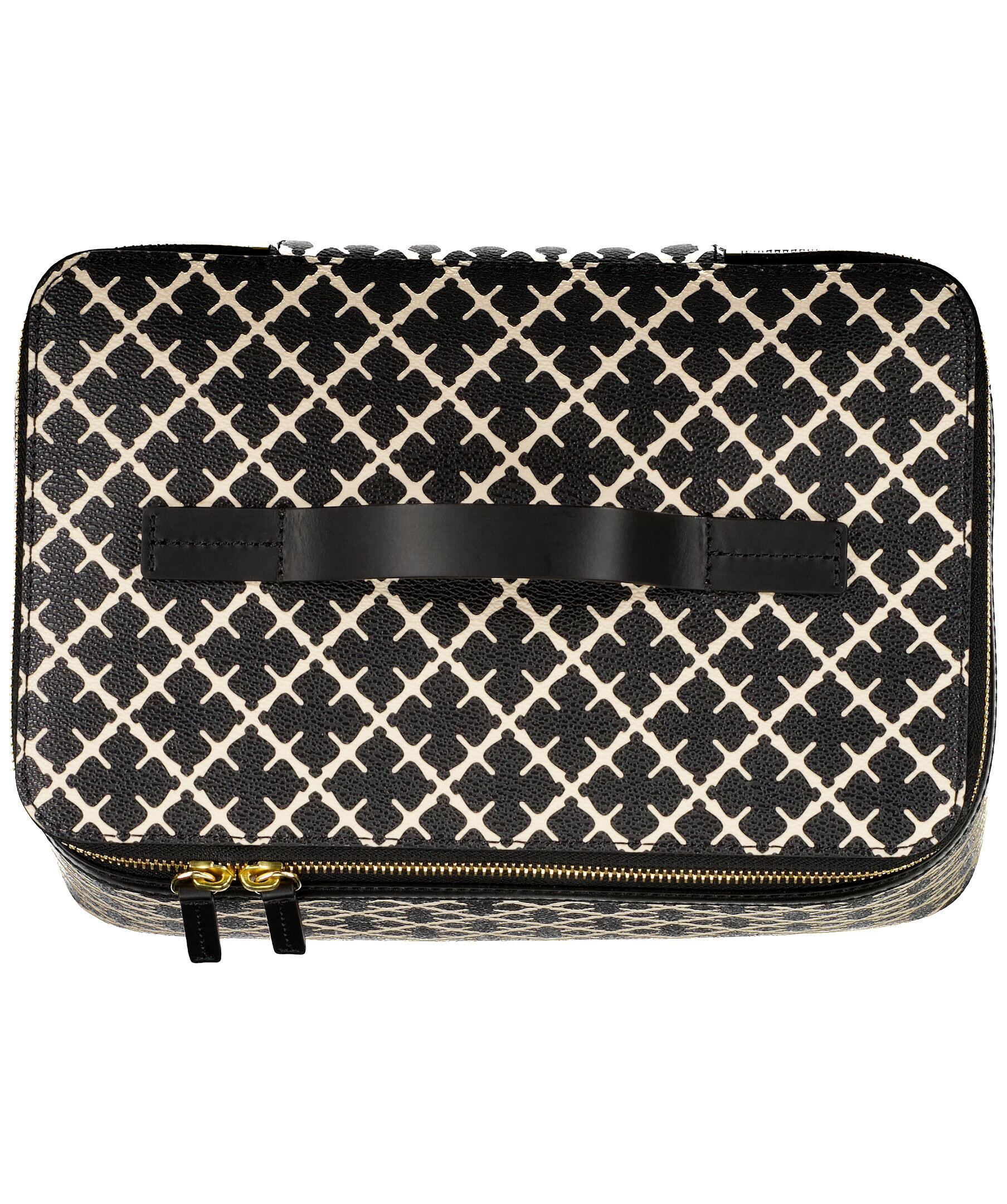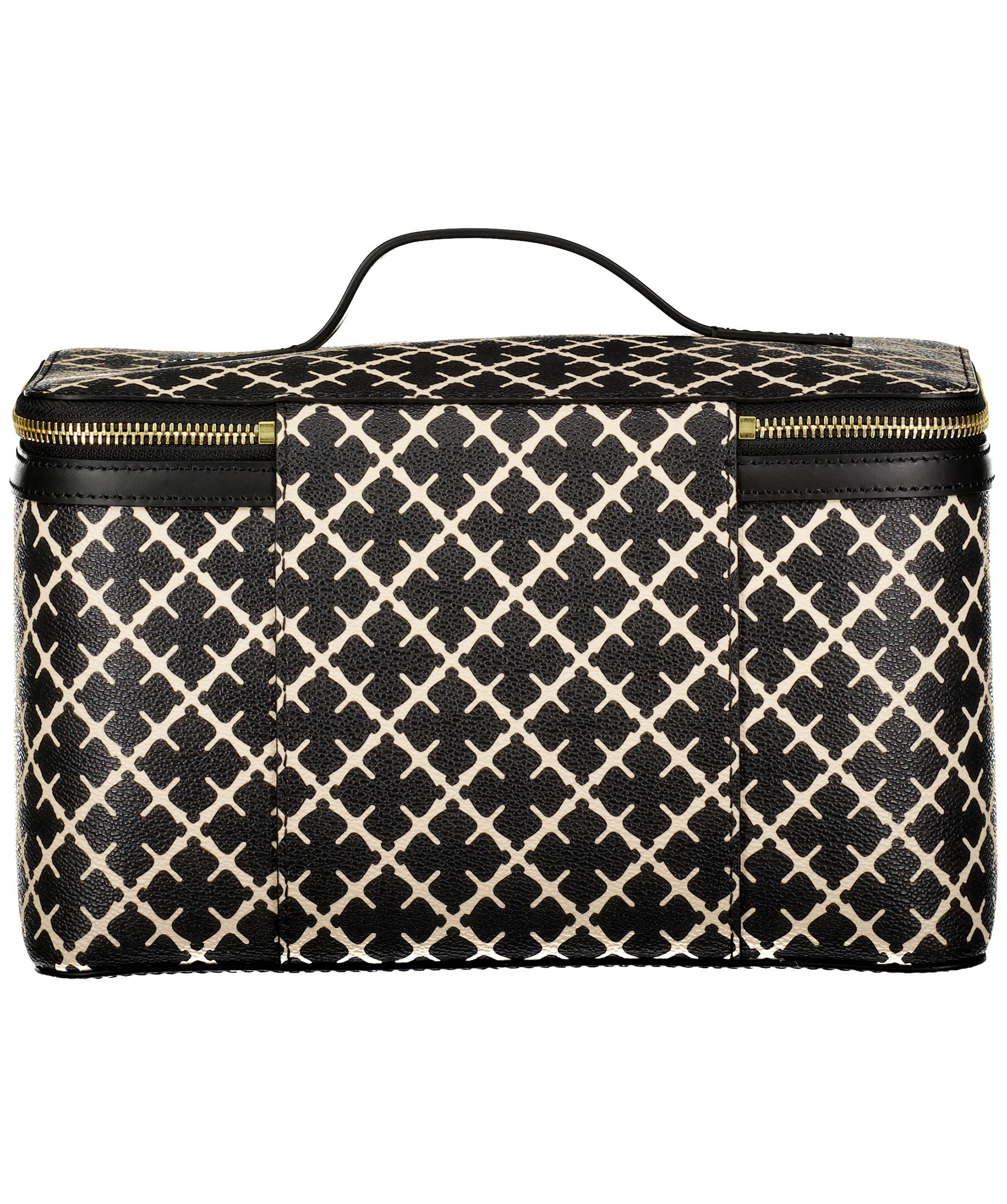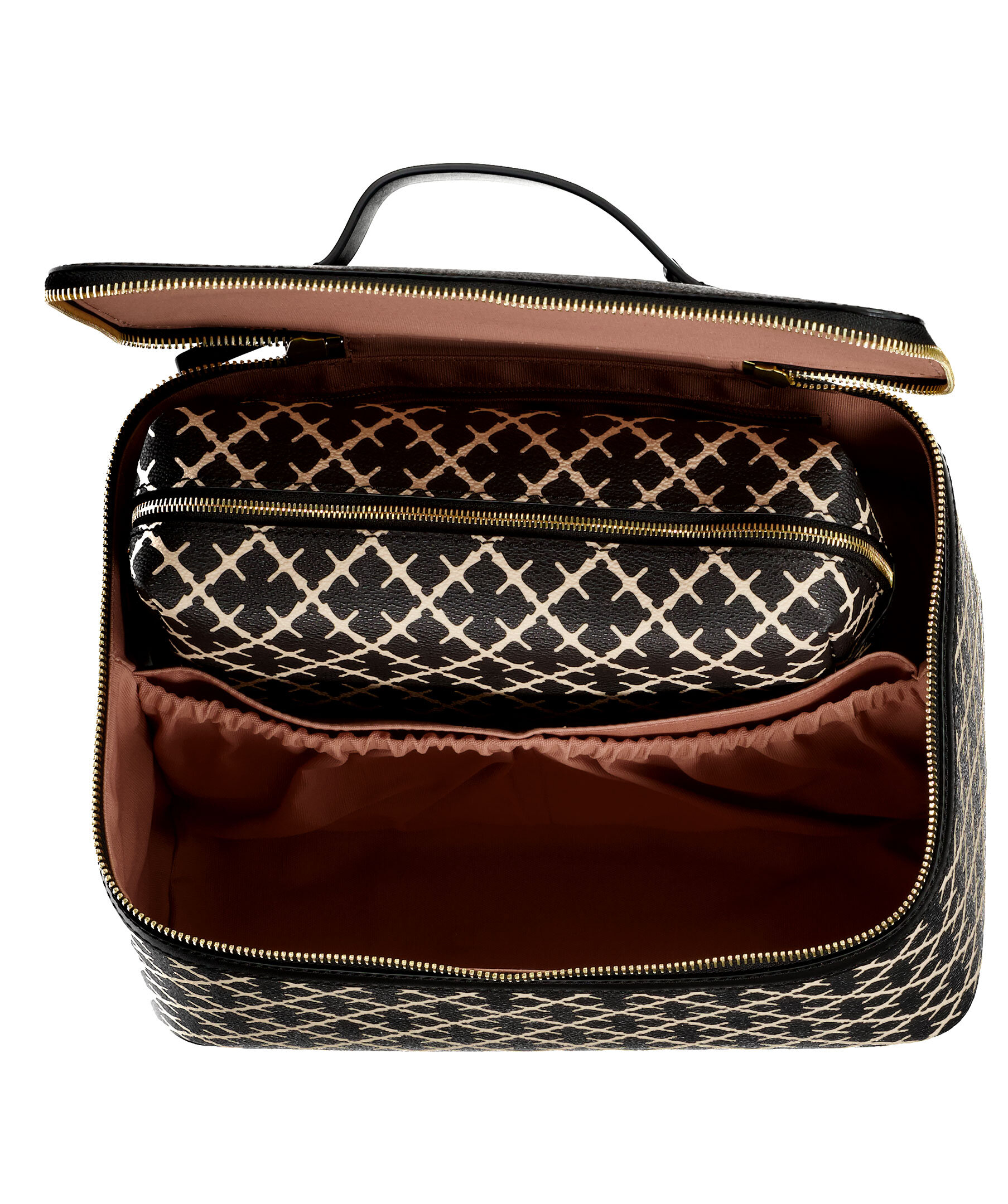 Stor necessär från By Malene Birger i deras klassiska mönster i svart och vitt. Stängs med guldfärgat blixtlås, har två stora inre fack, två elastiska fickor och en blixtlåsficka. Inuti finns en mindre necessär som går att ta ut, den stänga med dragkedja. Slitstarkt innetyg i bomull i färgen gammelrosa samt handtag på ovansidan. Tillverkad i PVC och har detaljer i läder. Mått: 27 x 16 x 17 cm.