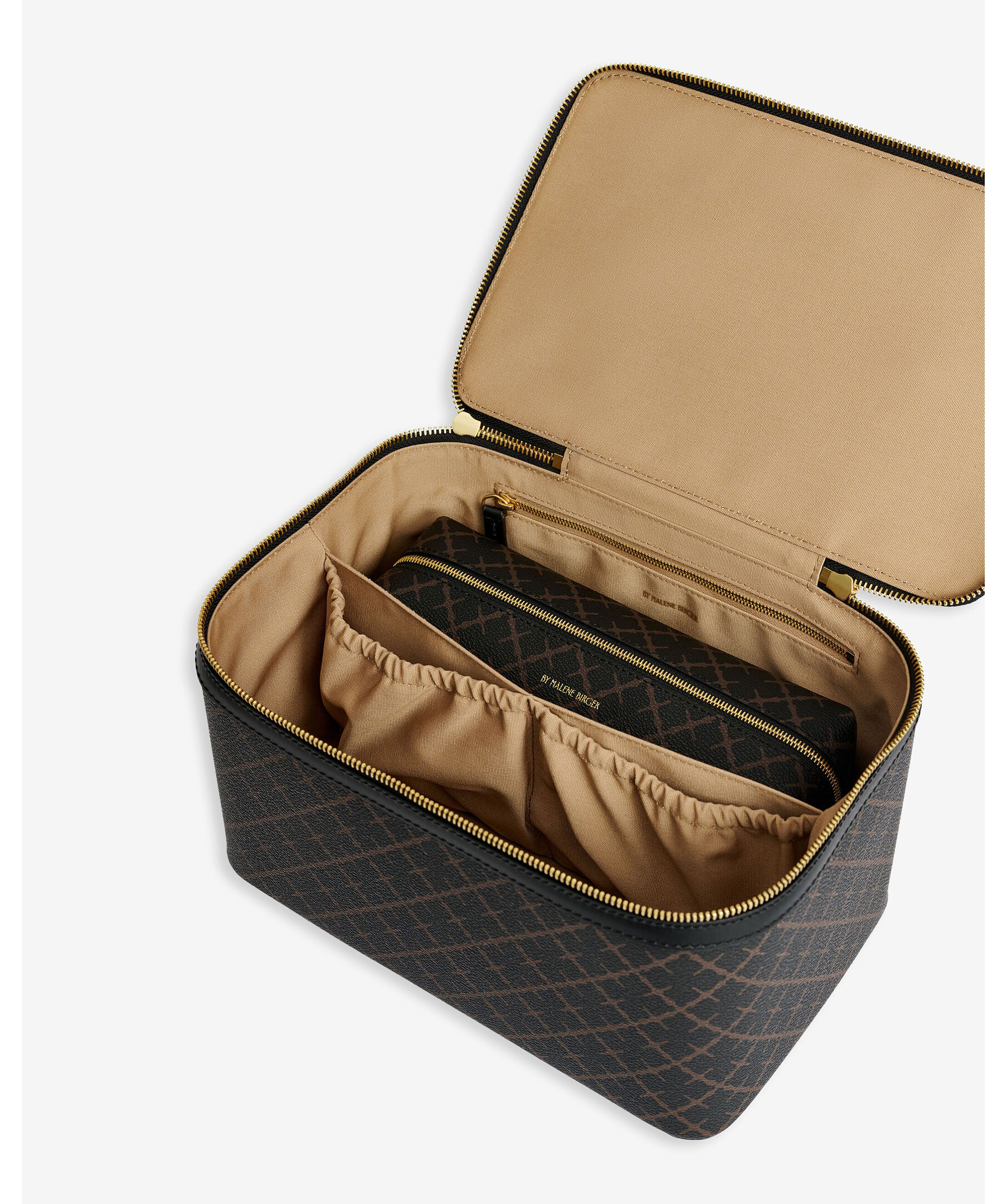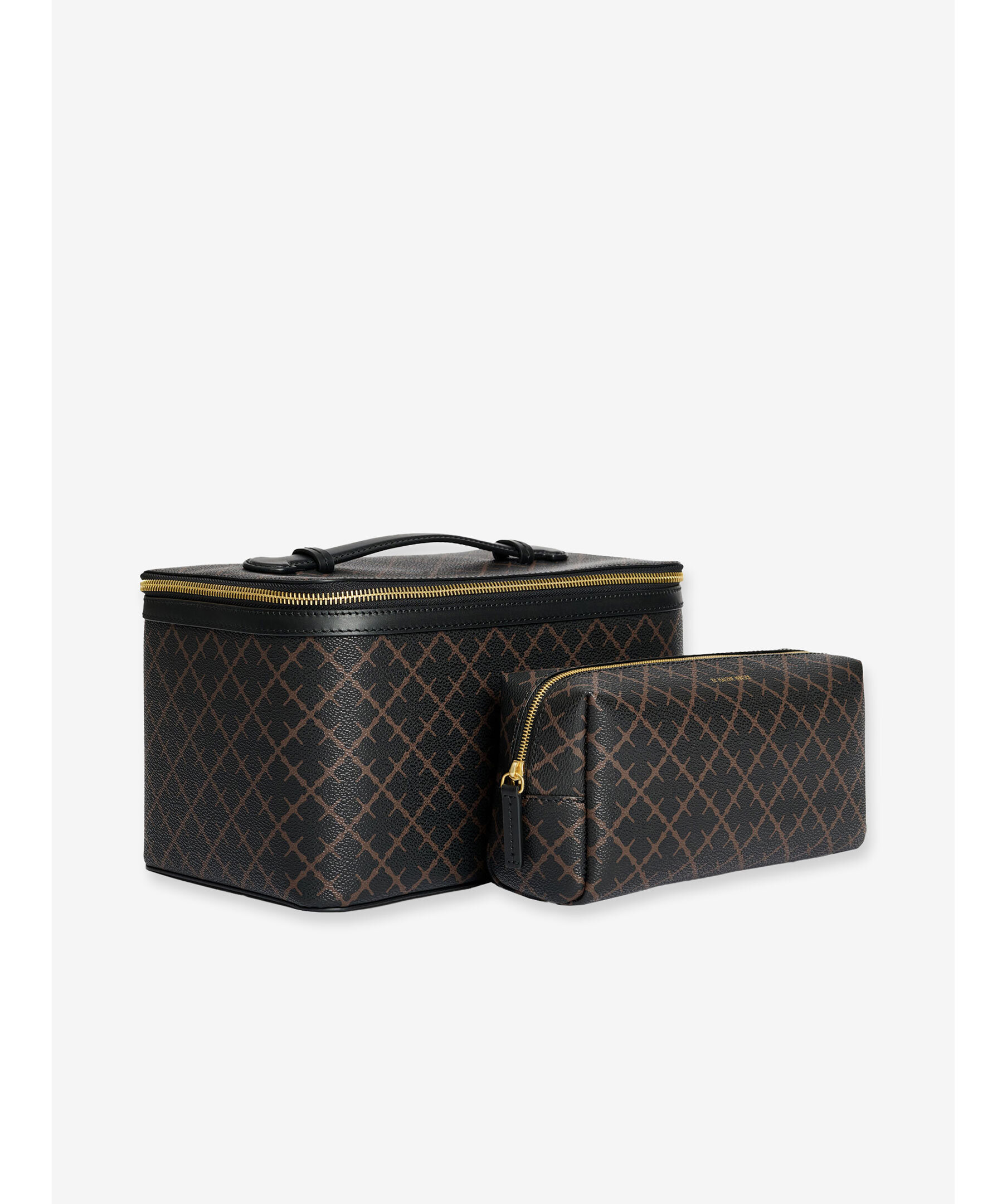 Stor necessär från By Malene Birger i deras klassiska mönster i brunt och svart. Stängs med guldfärgat blixtlås, har två stora inre fack, två elastiska fickor och en blixtlåsficka. Inuti finns en mindre necessär som går att ta ut, den stängs med dragkedja. Slitstarkt innetyg i bomull i beiget samt handtag på ovansidan. Tillverkad i PVC och har detaljer i läder. Mått: 27 x 16 x 17 cm.