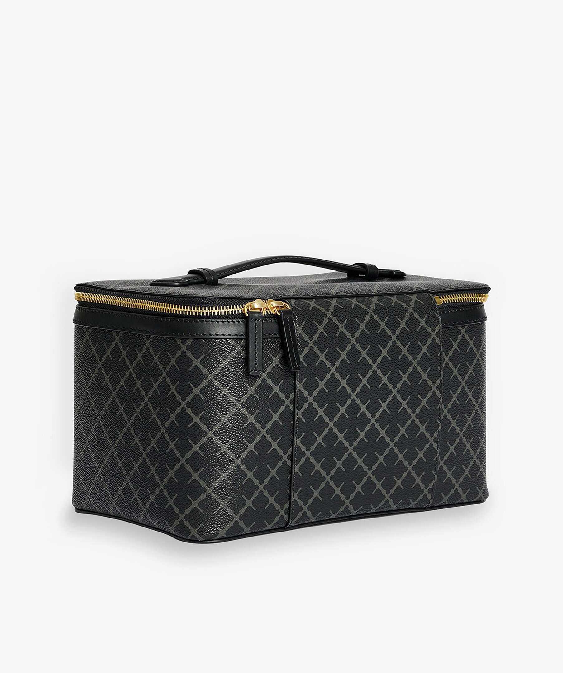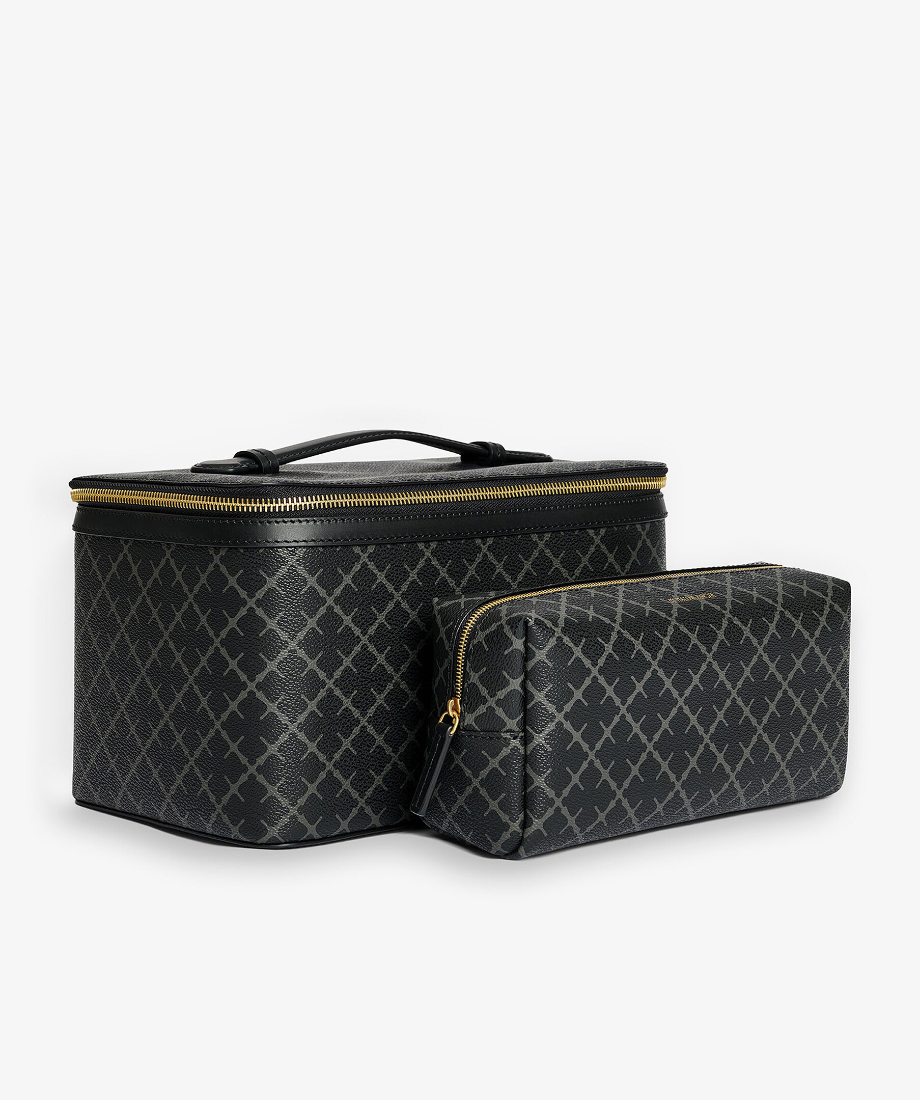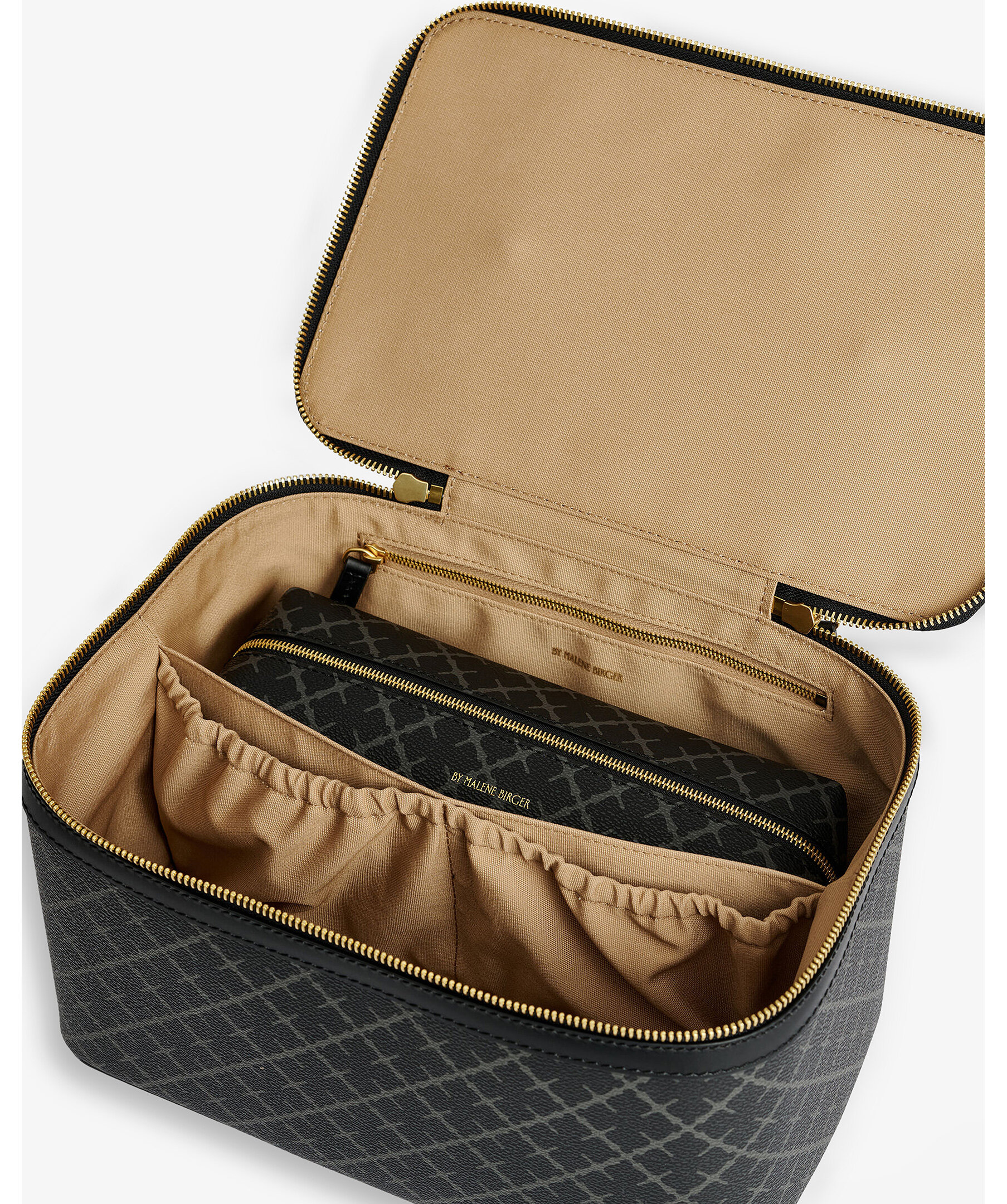 Stor necessär från By Malene Birger i deras klassiska mönster i grått och svart. Stängs med guldfärgat blixtlås, har två stora inre fack, två elastiska fickor och en blixtlåsficka. Inuti finns en mindre necessär som går att ta ut, den stängs med dragkedja. Slitstarkt innetyg i bomull i beiget samt handtag på ovansidan. Tillverkad i PVC och har detaljer i läder. Mått: 27 x 16 x 17 cm.