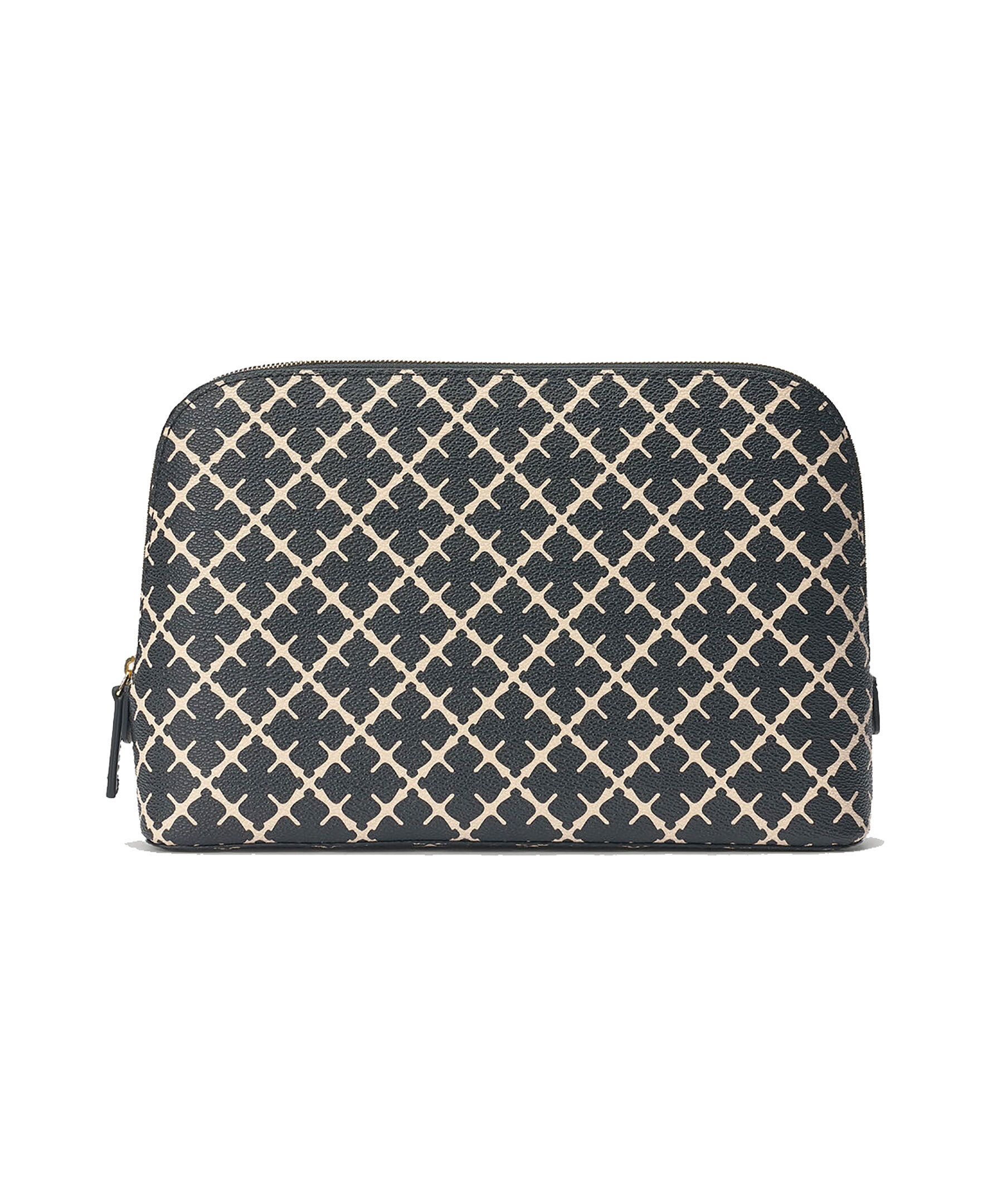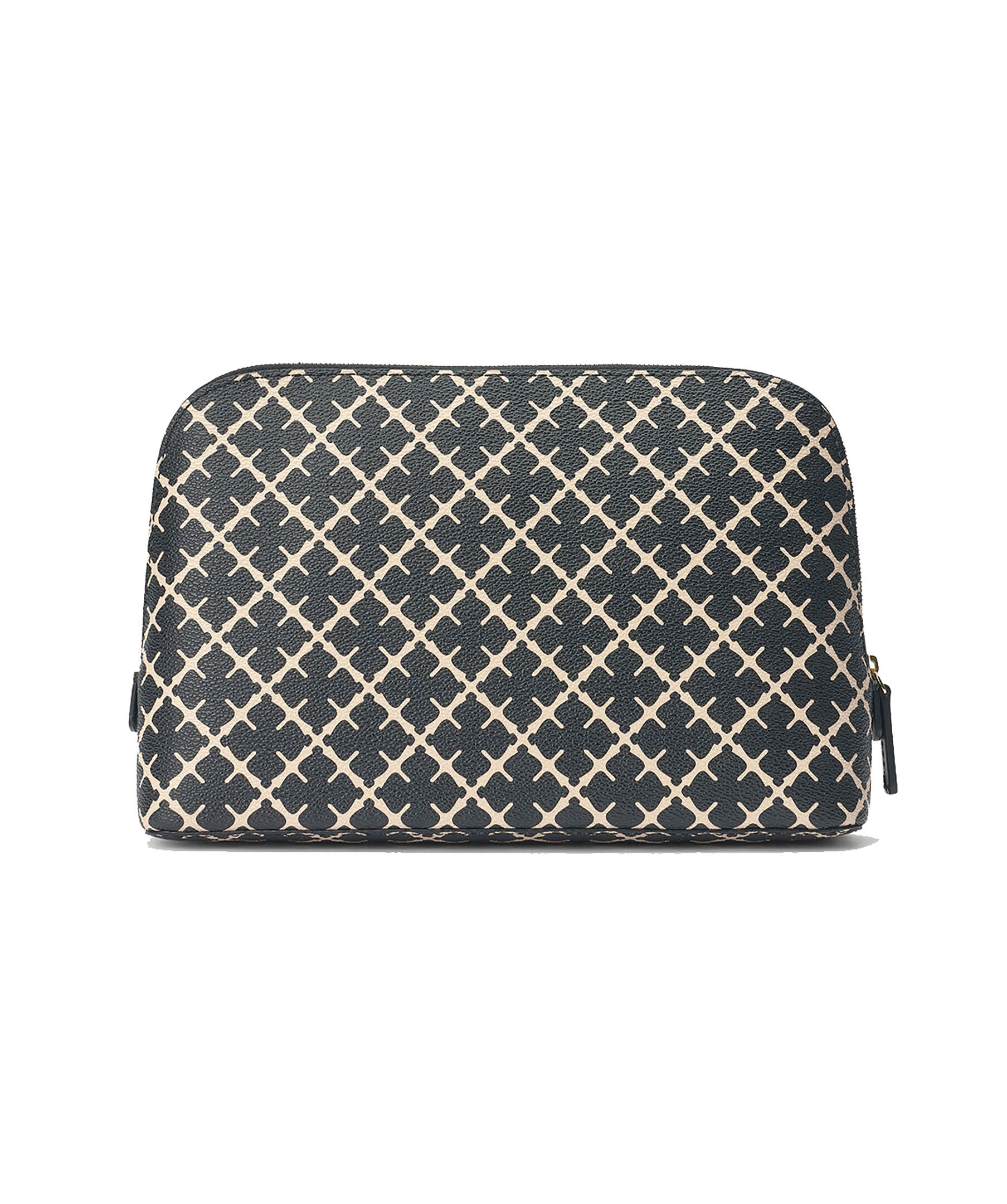 Svart necessär från By Malene Birger med deras klassiska blommönster. Stängs med guldfärgat blixtlås, har två elastiska innerfickor. Tillverkad av PVC.