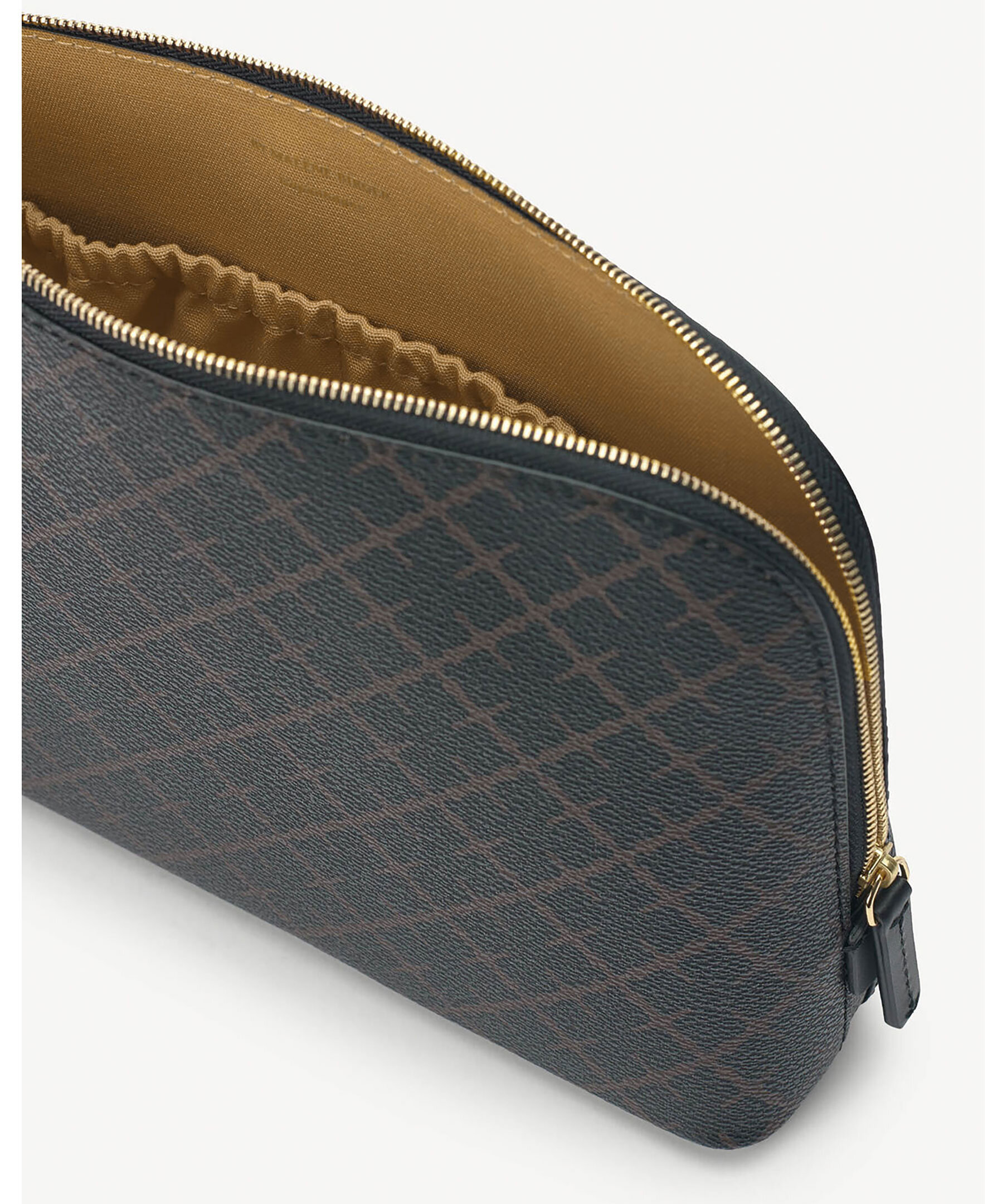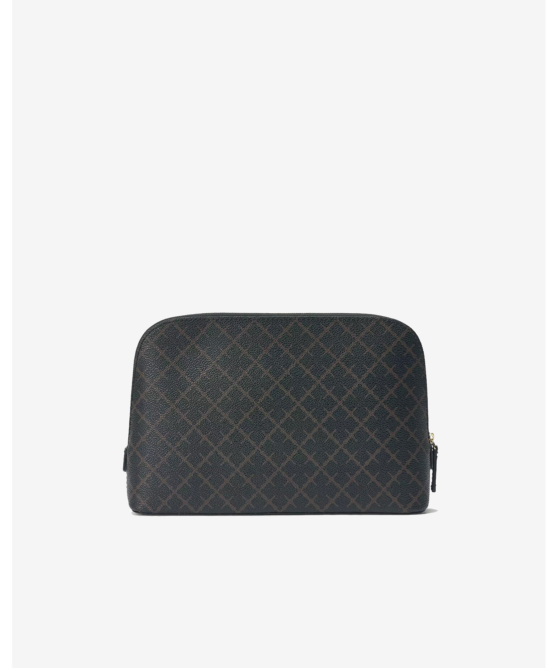 Mörkbrun necessär från By Malene Birger med deras klassiska blommönster. Stängs med guldfärgat blixtlås, har två elastiska innerfickor. Tillverkad av PVC.