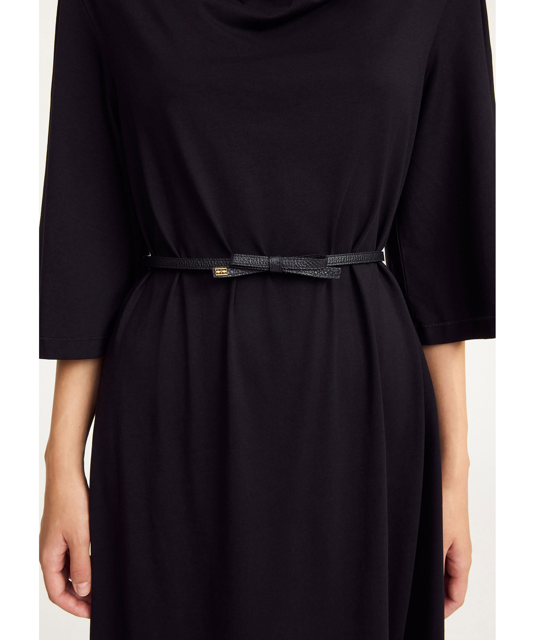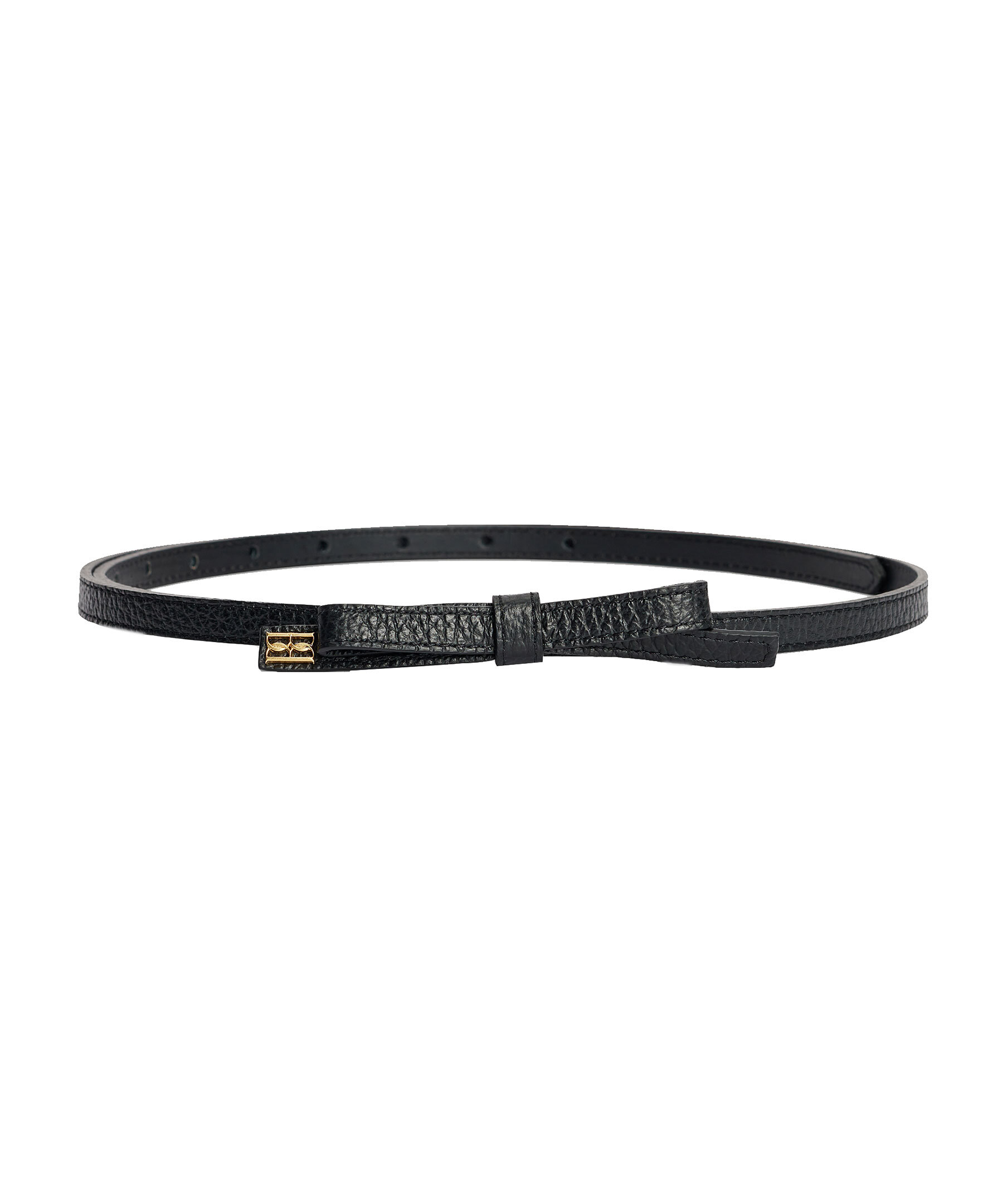 Svart läderbälte från By Malene Birger. Bältet har en feminin rosett framtill och guldig logotyp.