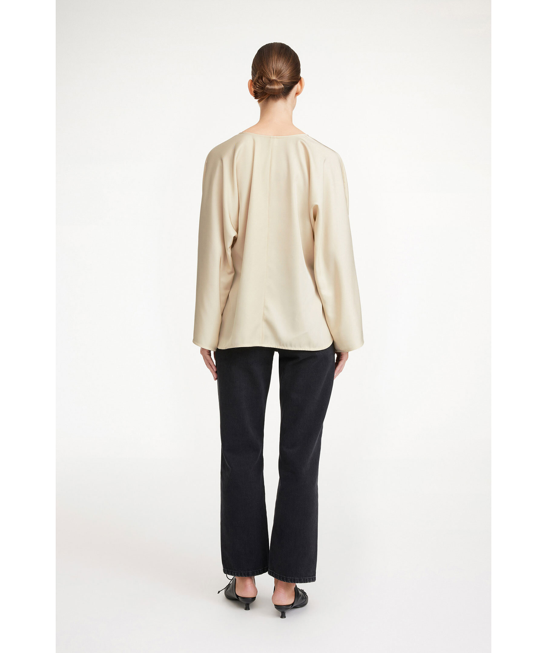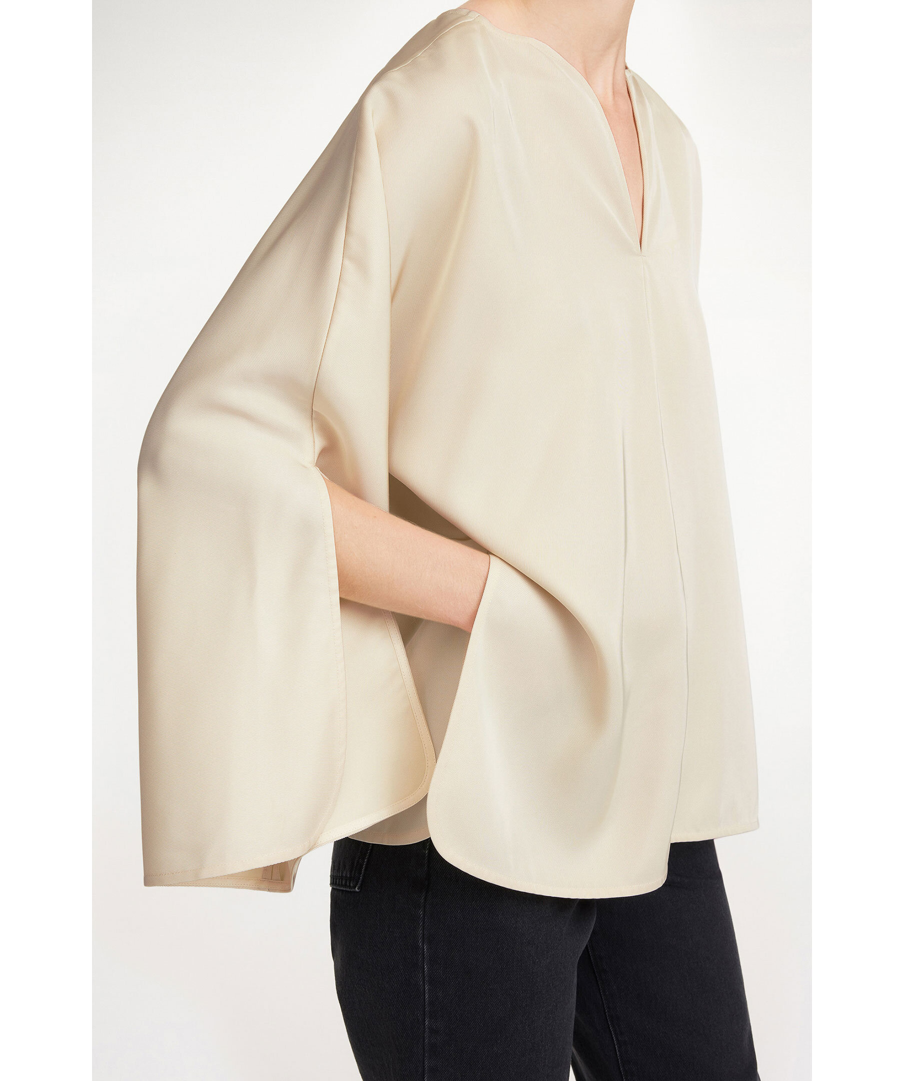 Den beigea Calias blusen utgör en perfekt och mångsidig grund för din vardagsgarderob och utmärker sig i sin enkelhet. Denna skräddarsydda blus är inte bara snygg utan också bekväm att bära med sin smickrande V-formade halsringning, Dolman-ärmar och definierande rundade fållar. Den är varsamt designad för att ge en elegant touch till din outfit.