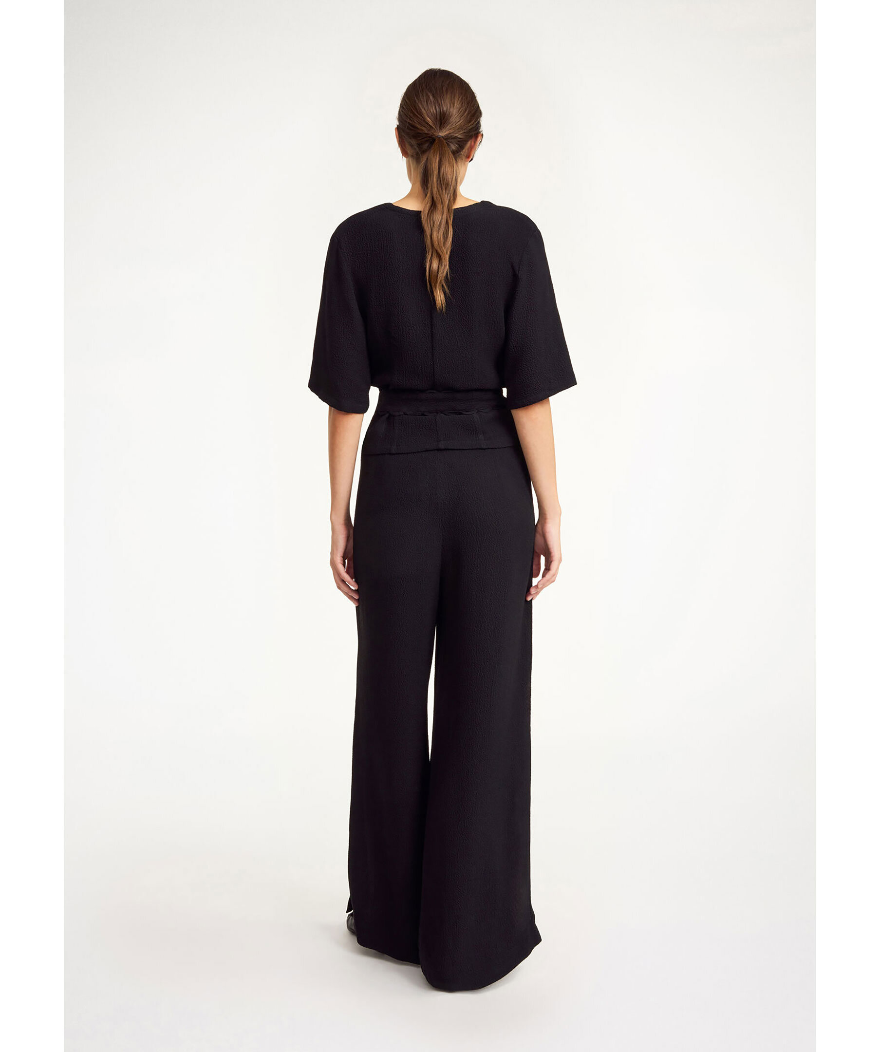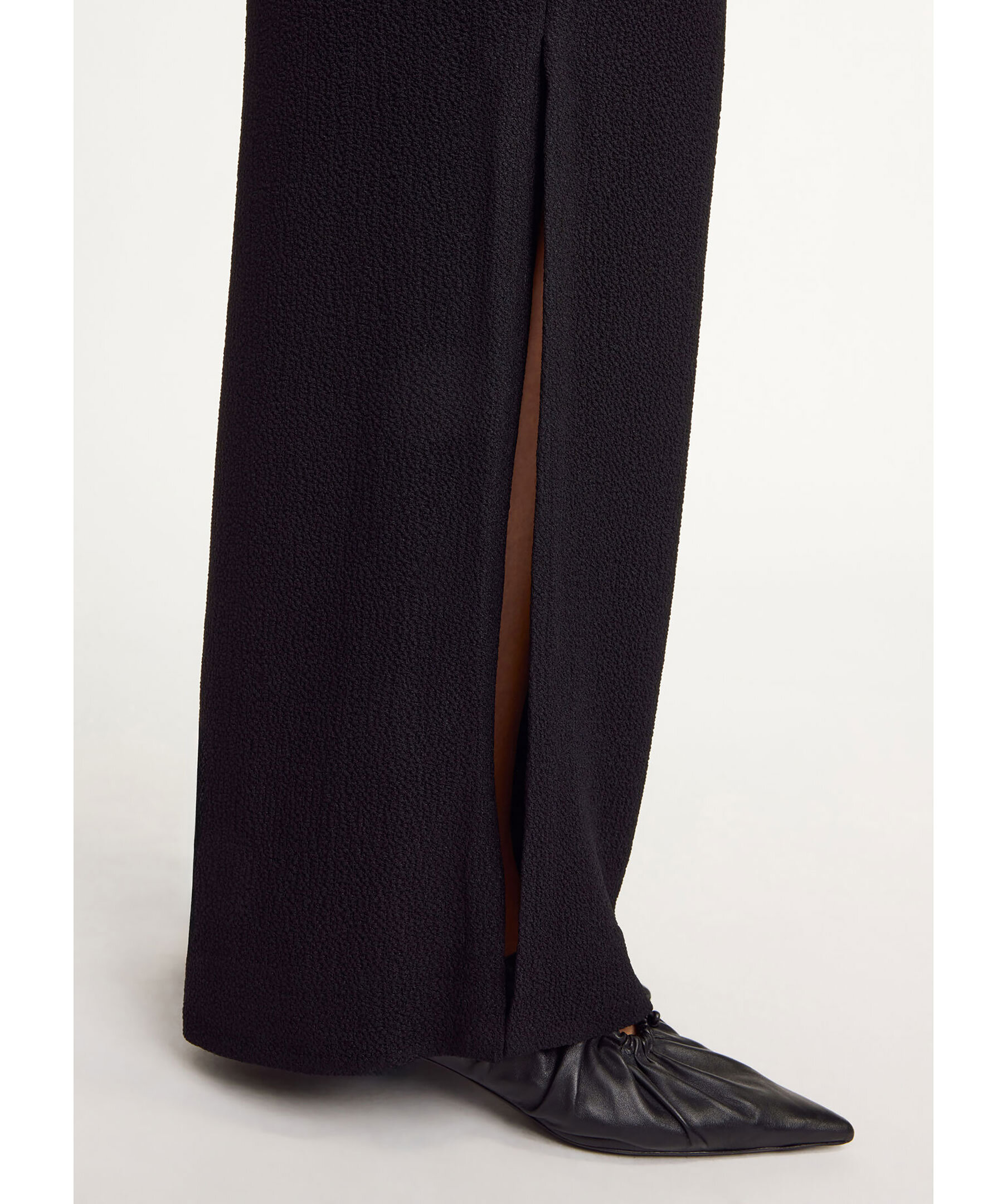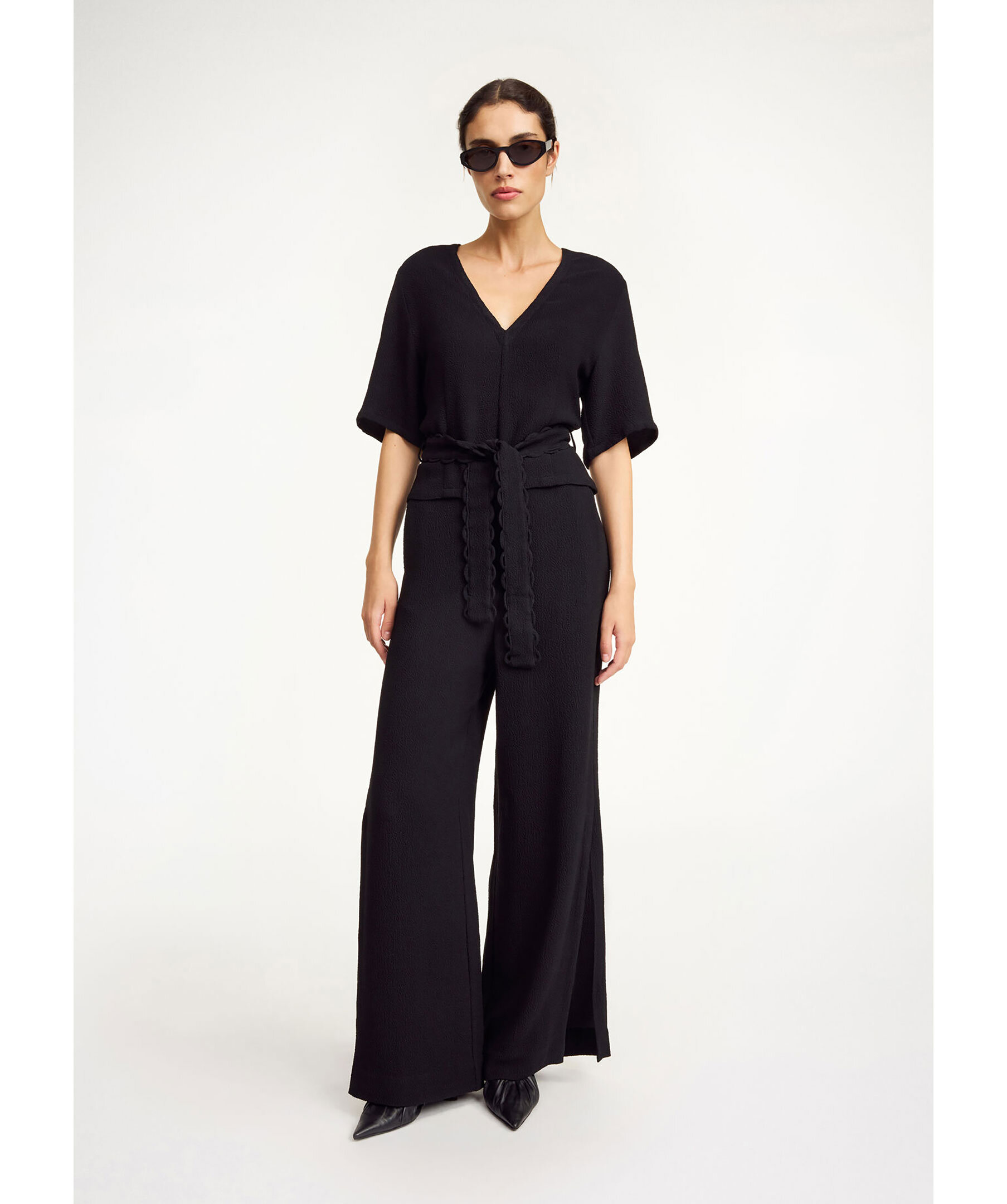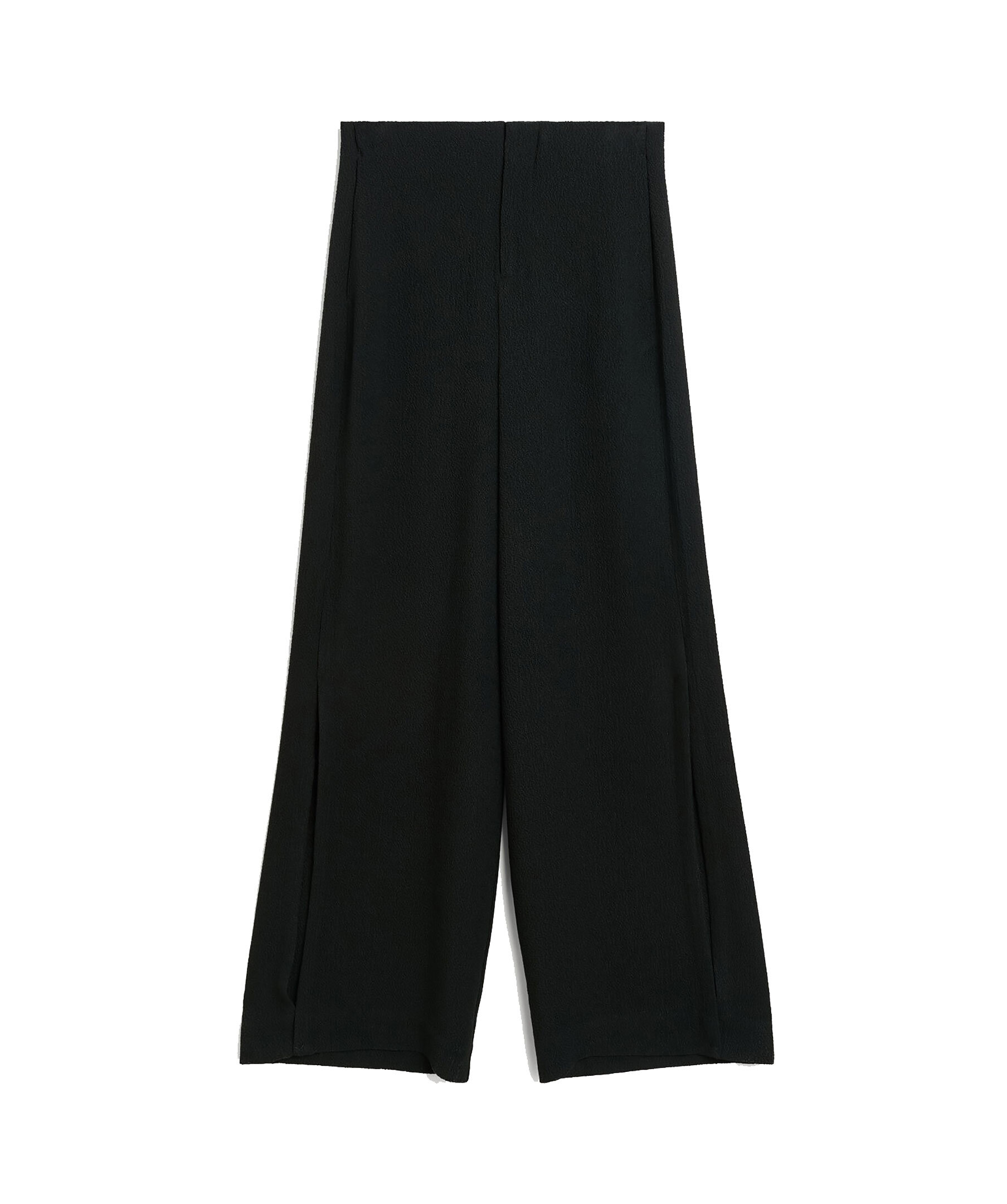 Svarta byxor från By Malene Birger. Byxorna är vida, har blixtlås, hake och knapp. sidofickor och hög slits vid benen. Tillverkade av en acetat blandning.