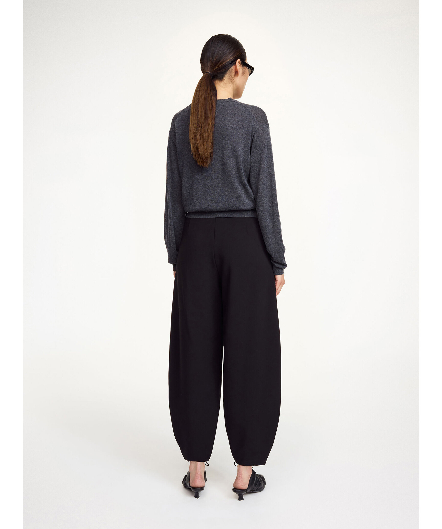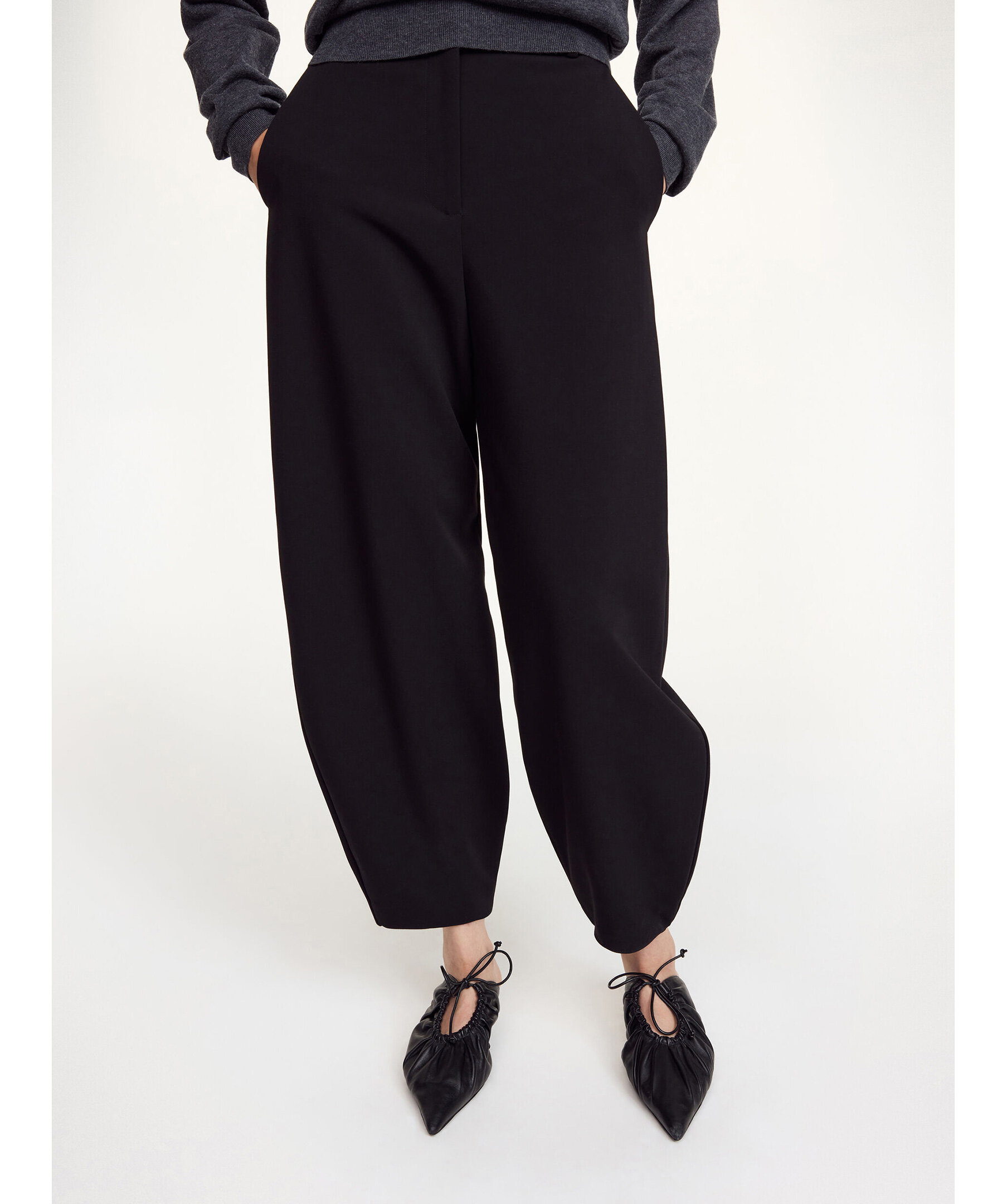Svarta Carlien Trousers från By Malene Birger. Byxorna har en högt skuren midja med pressveck och taperad benform som skapar en elegant och modern silhuett perfekt för kontors‑ och vardagsstil. De har praktiska sidofickor, bältesöglor och en diskret hake‑ och blixtlåsförslutning framtill för en stilren finish.