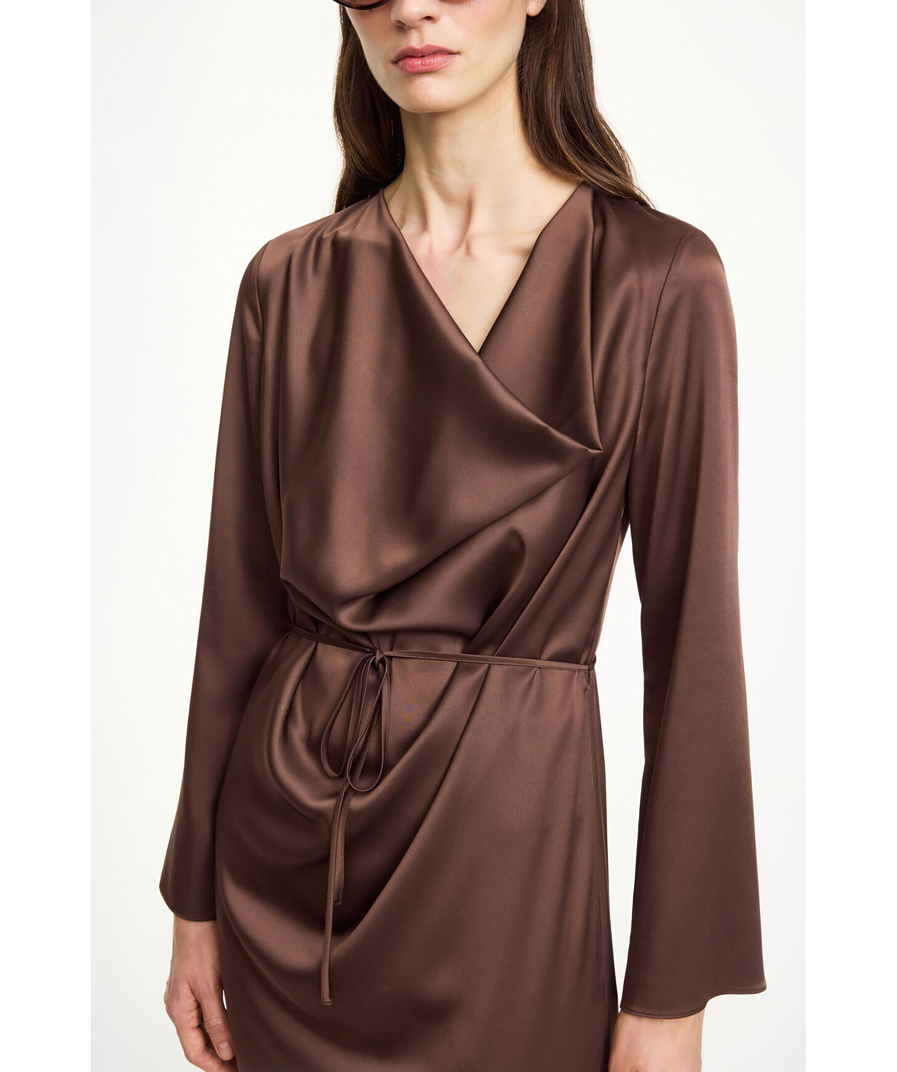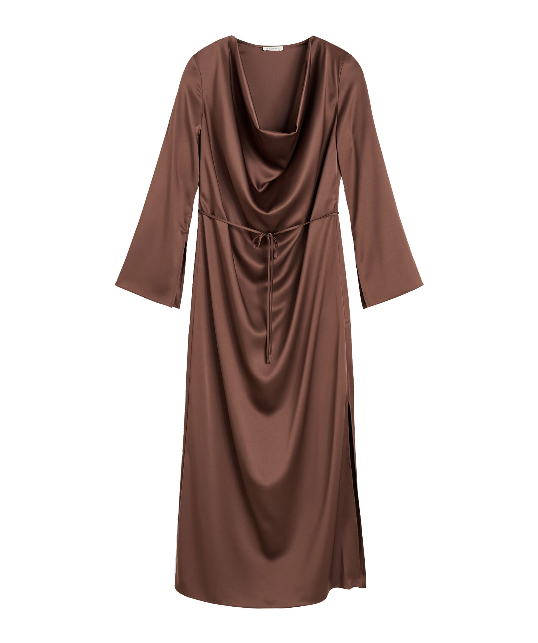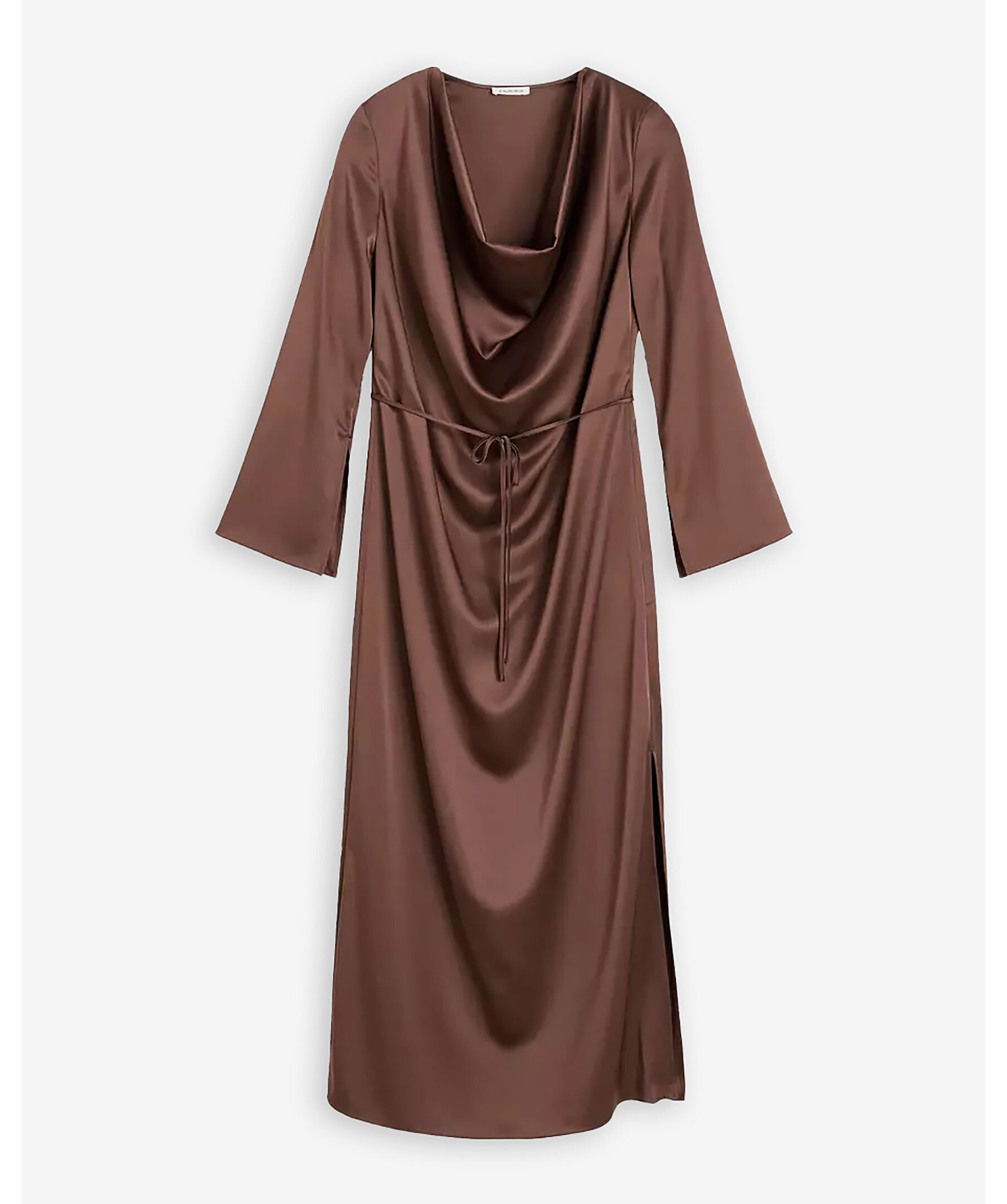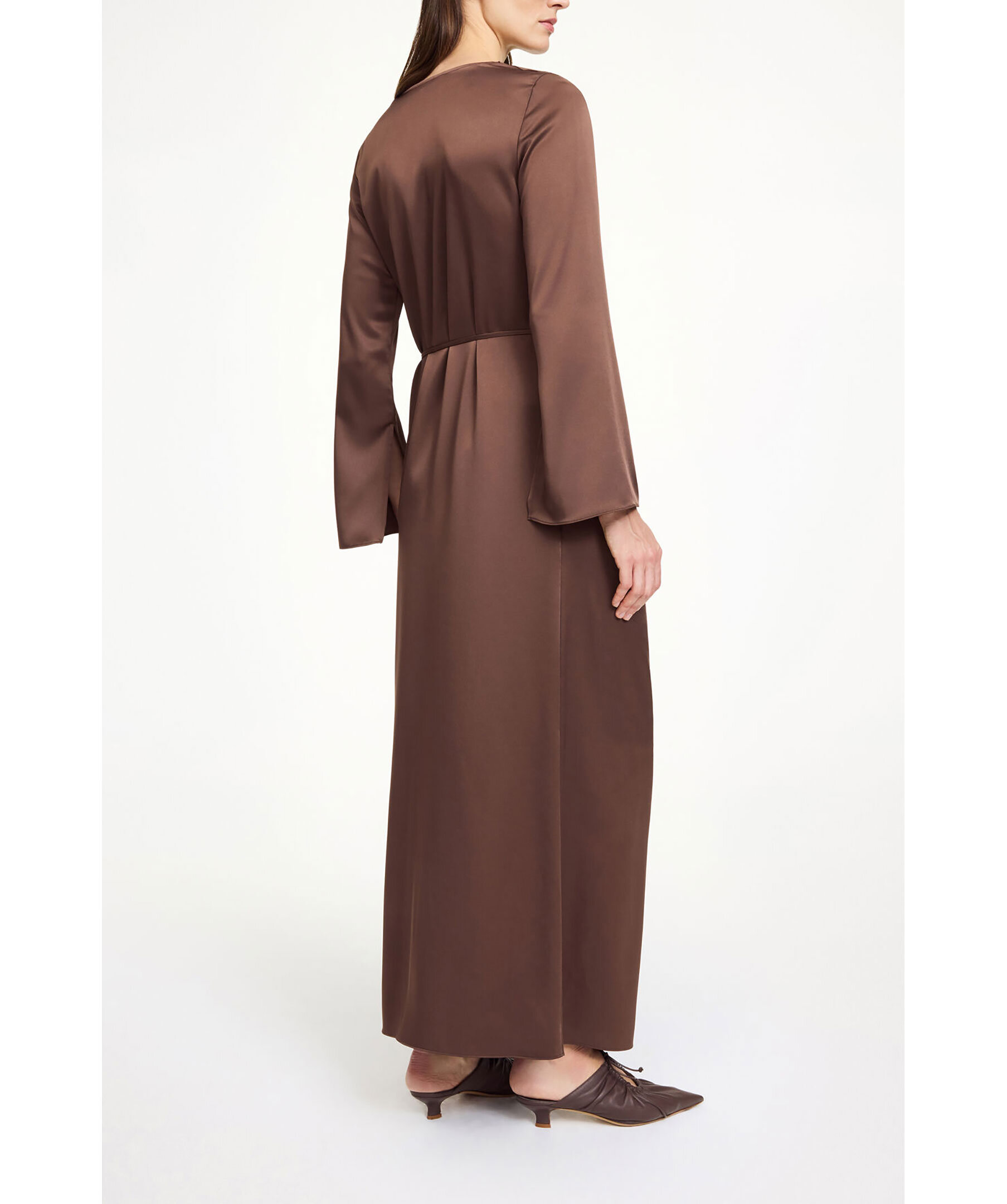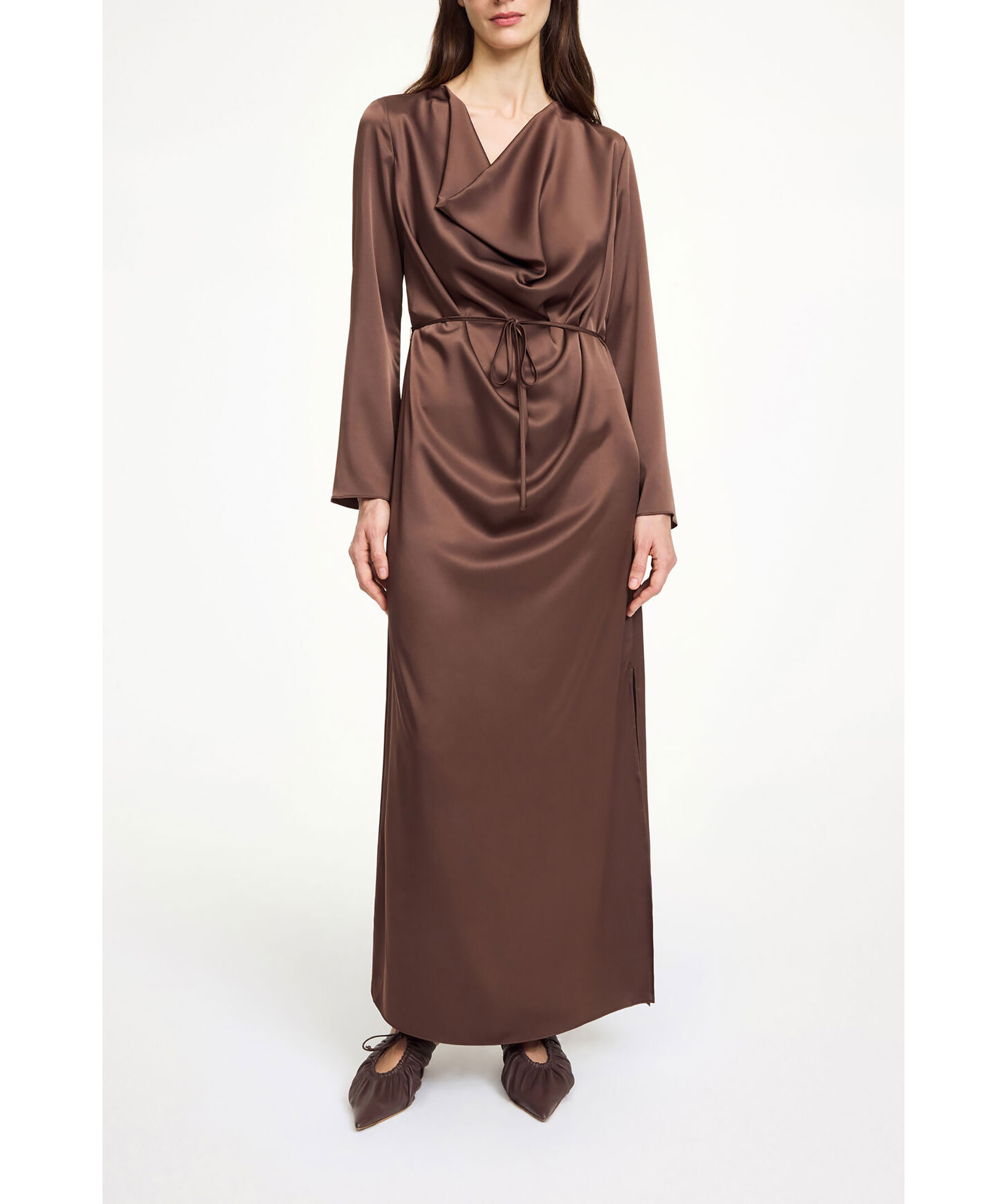 Brun, långärmad långklänning i silkmaterial från By Malene Birger. Klänningen kännetecknas av en lågt draperad halsringning, snygga slitsar på båda ärmarna och ett tunt midjebälte som är helt avtagbart. Tillverkad i en acetatblandning.