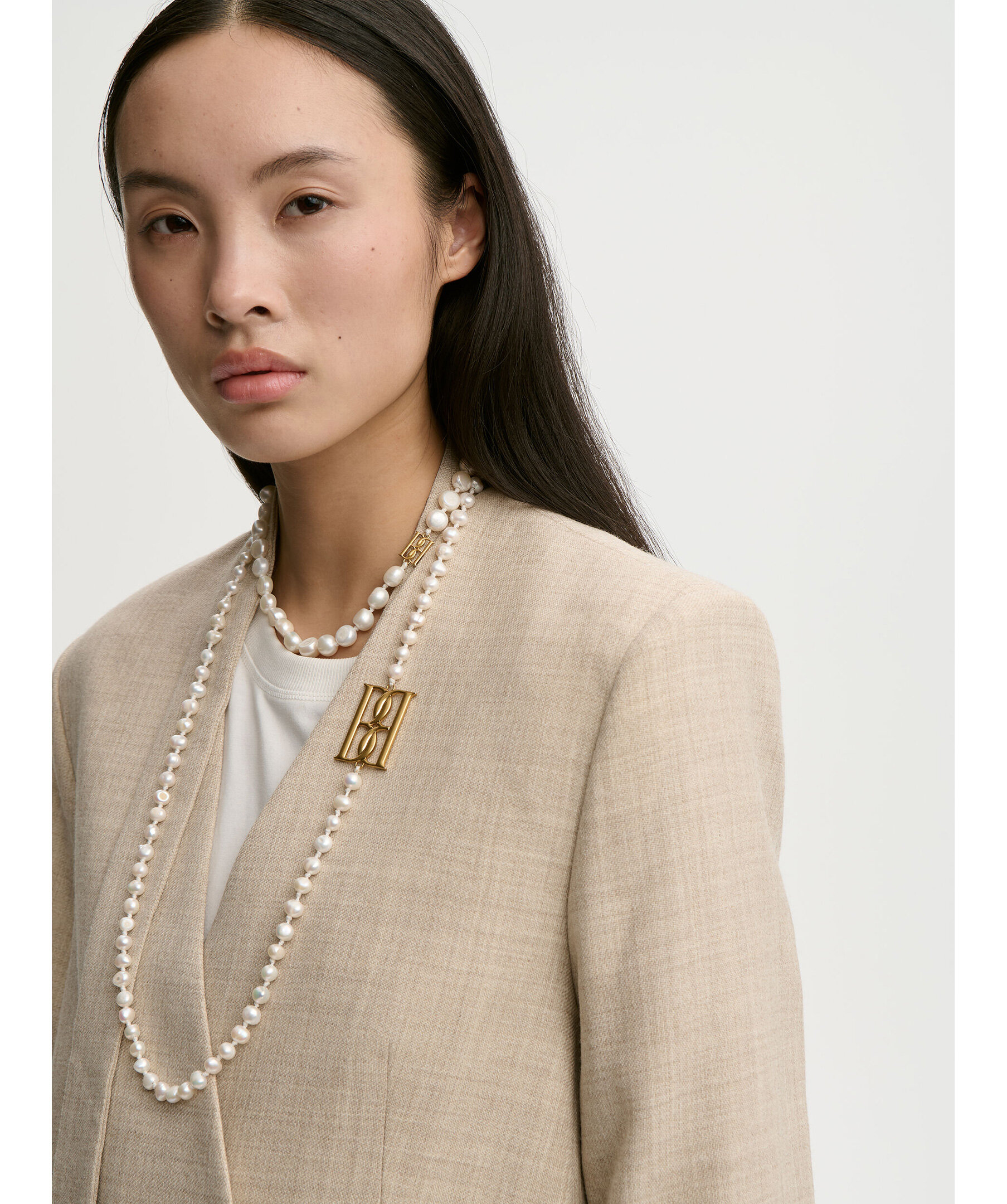 Elegant och bohemiskt inspirerat pärlhalsband från By Malene Birger med namn Chakallo Monogram Necklace. Halsbandet är tillverkat av naturliga sötvattenspärlor som ger en tidlös lyster och är dekorerat med ett stort guldfärgat monogram, vilket skapar ett sofistikerat statement‑accessoar som lyfter både vardags‑ och festoutfits.