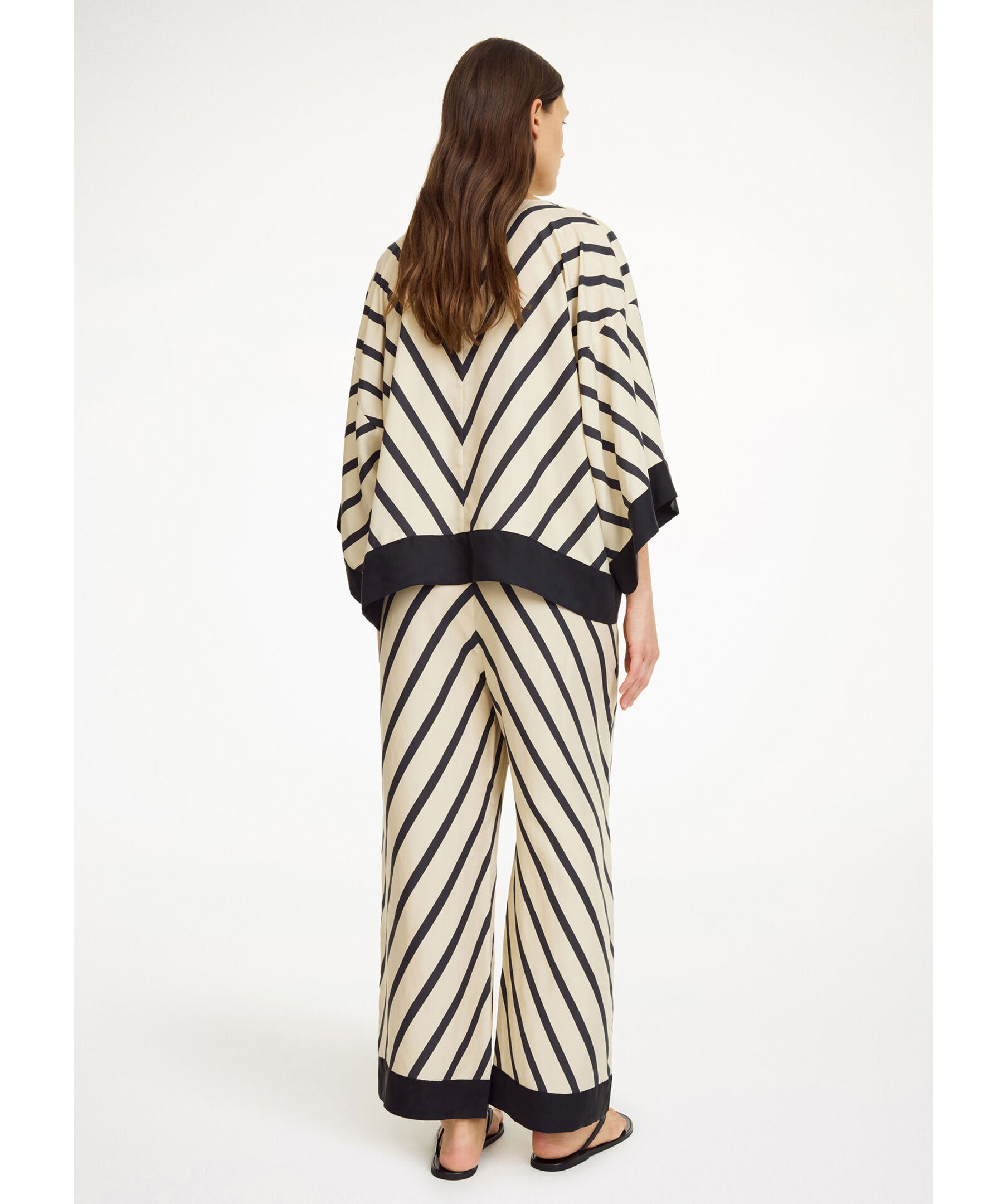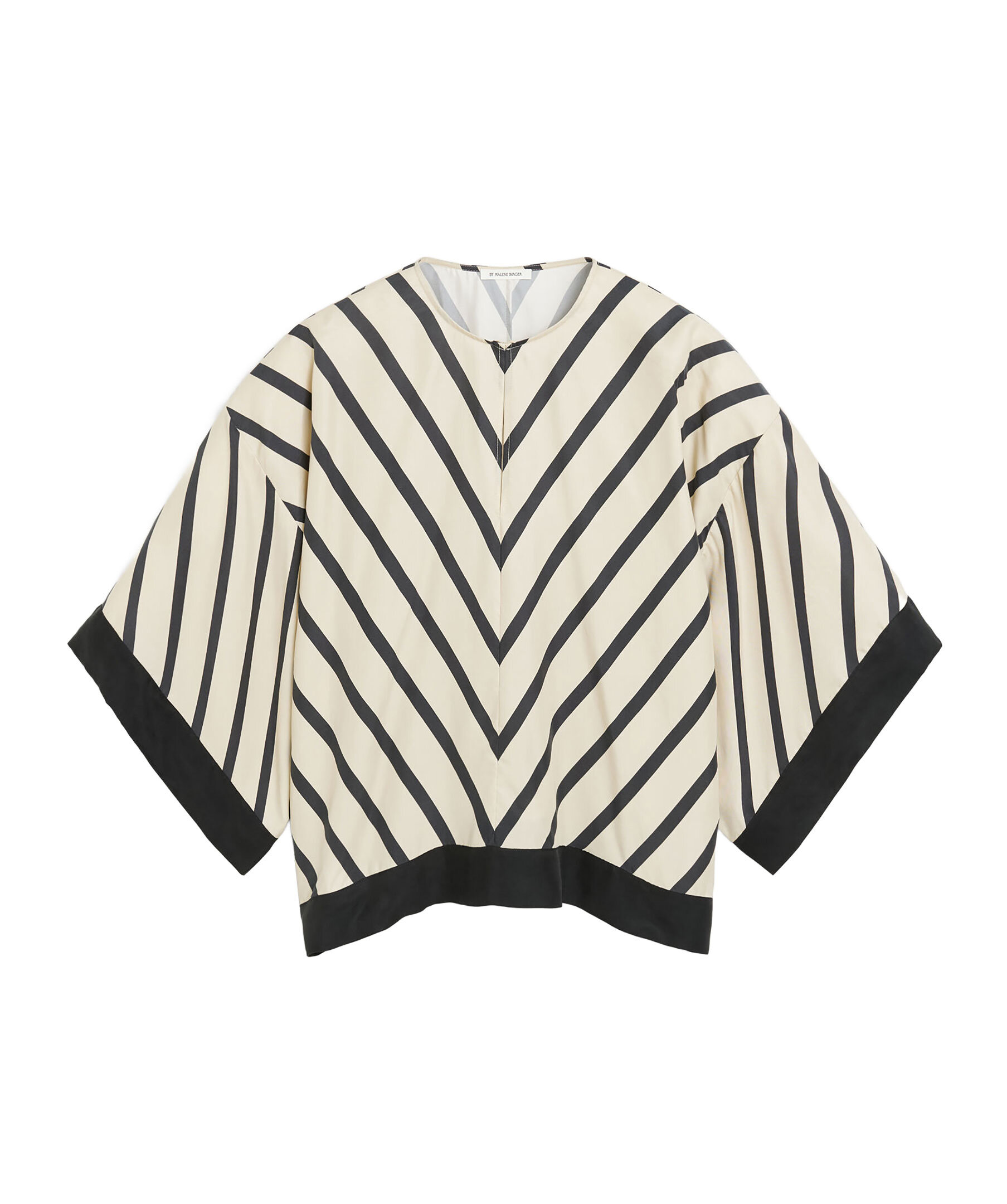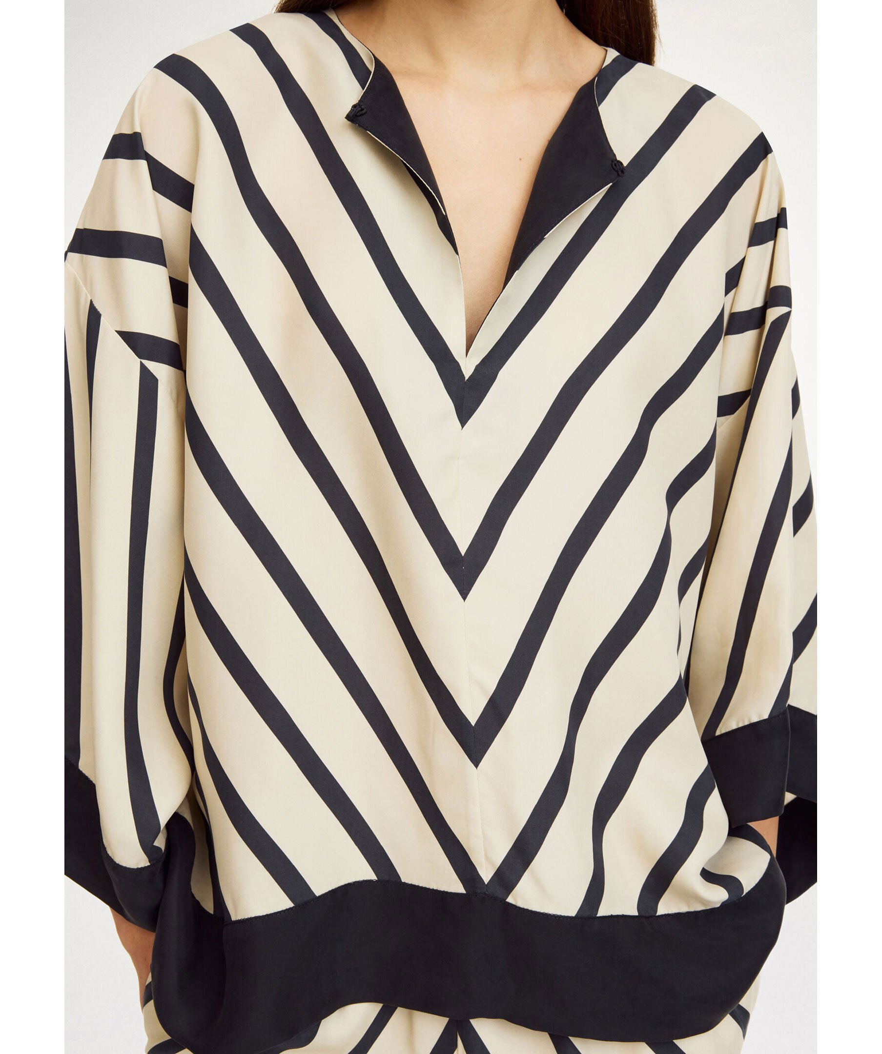 Beige blus med svarta ränder från By Malene Birger. Blusen har en lös passform och vida trekvartsärmar med svarta avslut. Stilfull öppning framtill. Tillverkad av en cuprobladning.