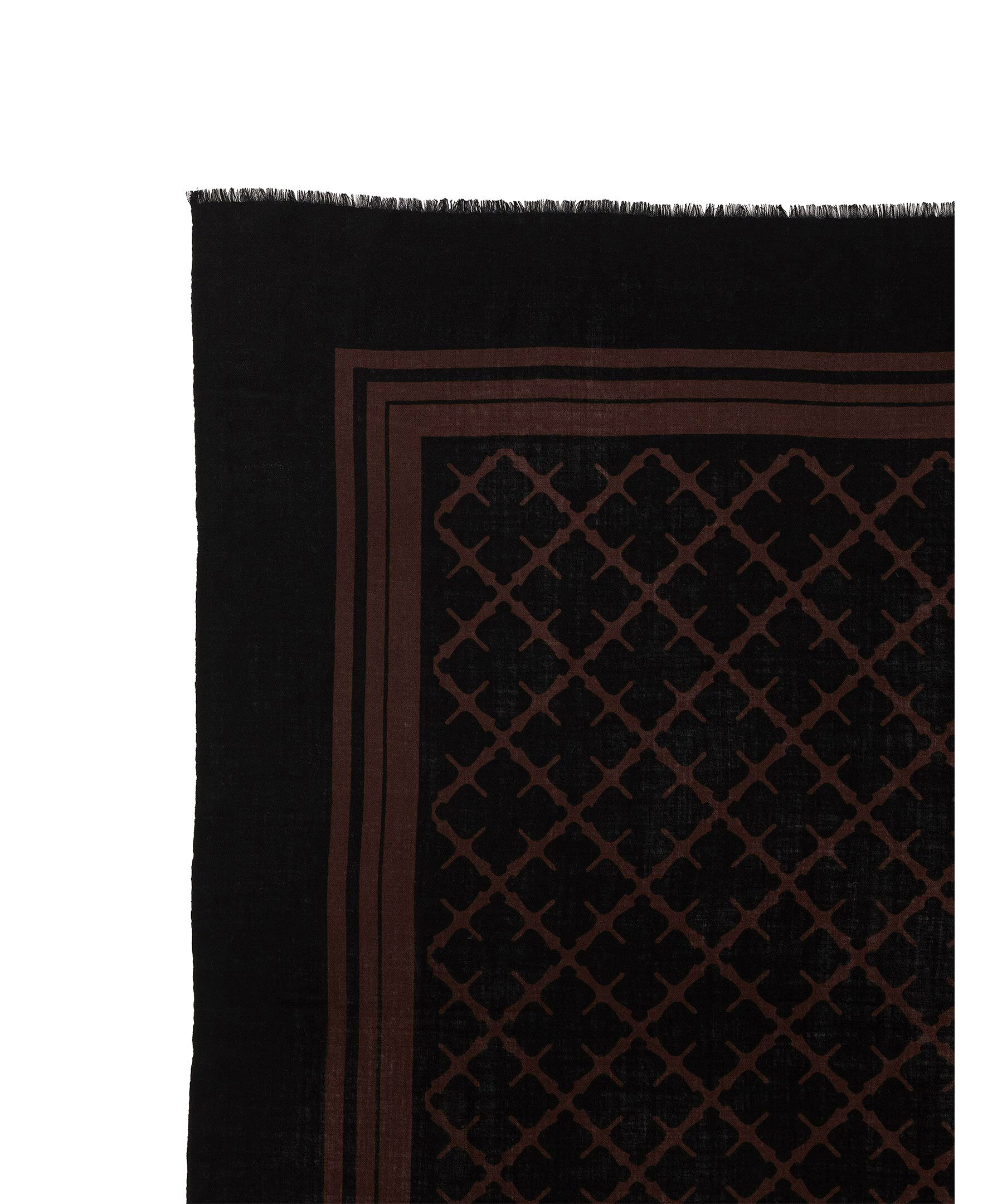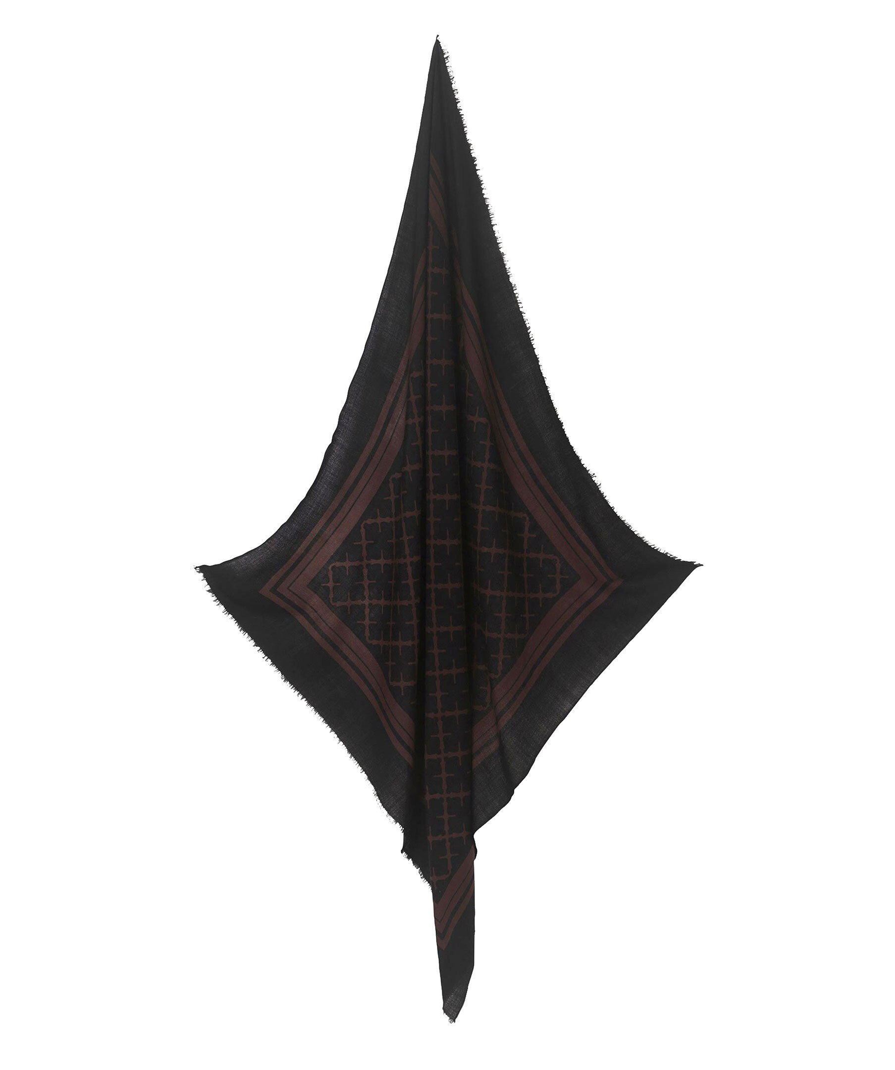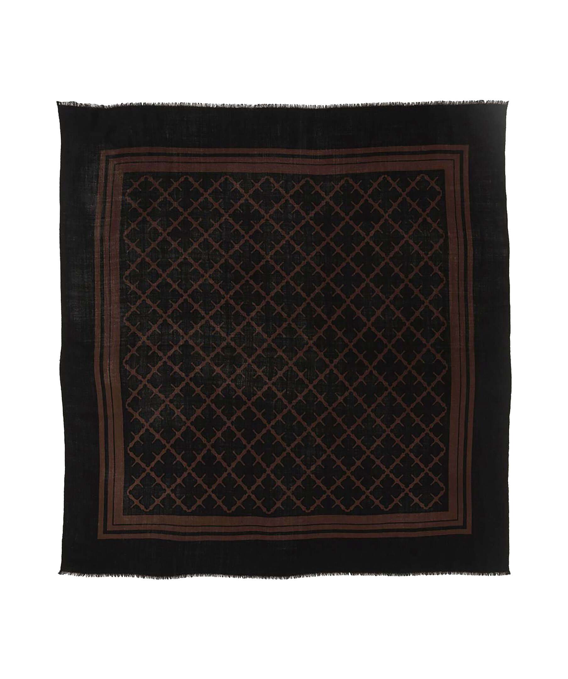 Brun och svart, fyrkantig ullscarf från by Malene Birger. Den är detaljerad med fransade fållar och by Malene Birgers signatur blom-motiv. Vira den runt halsen eller bär den över axlarna. Mått: 100 x 100 cm.