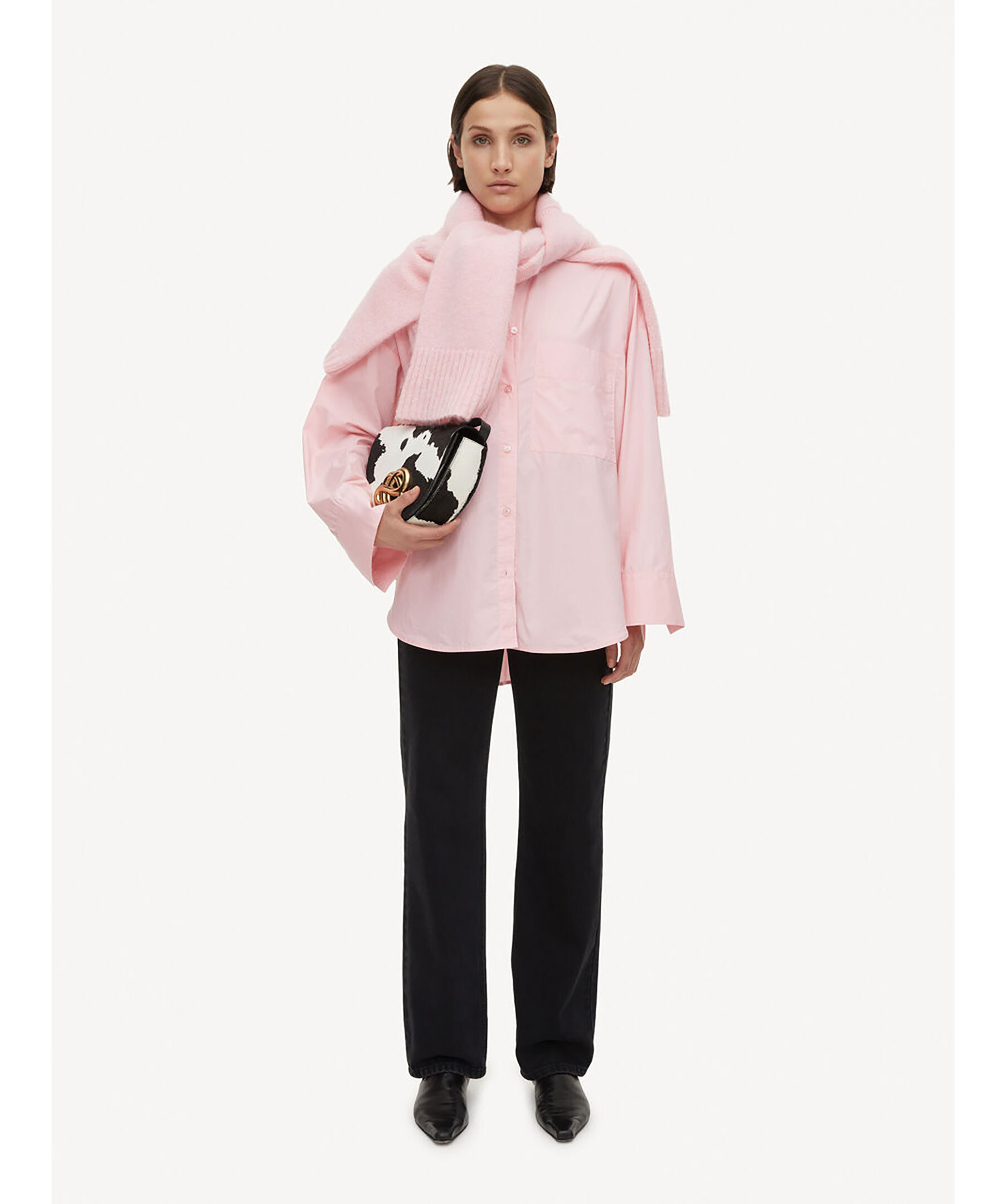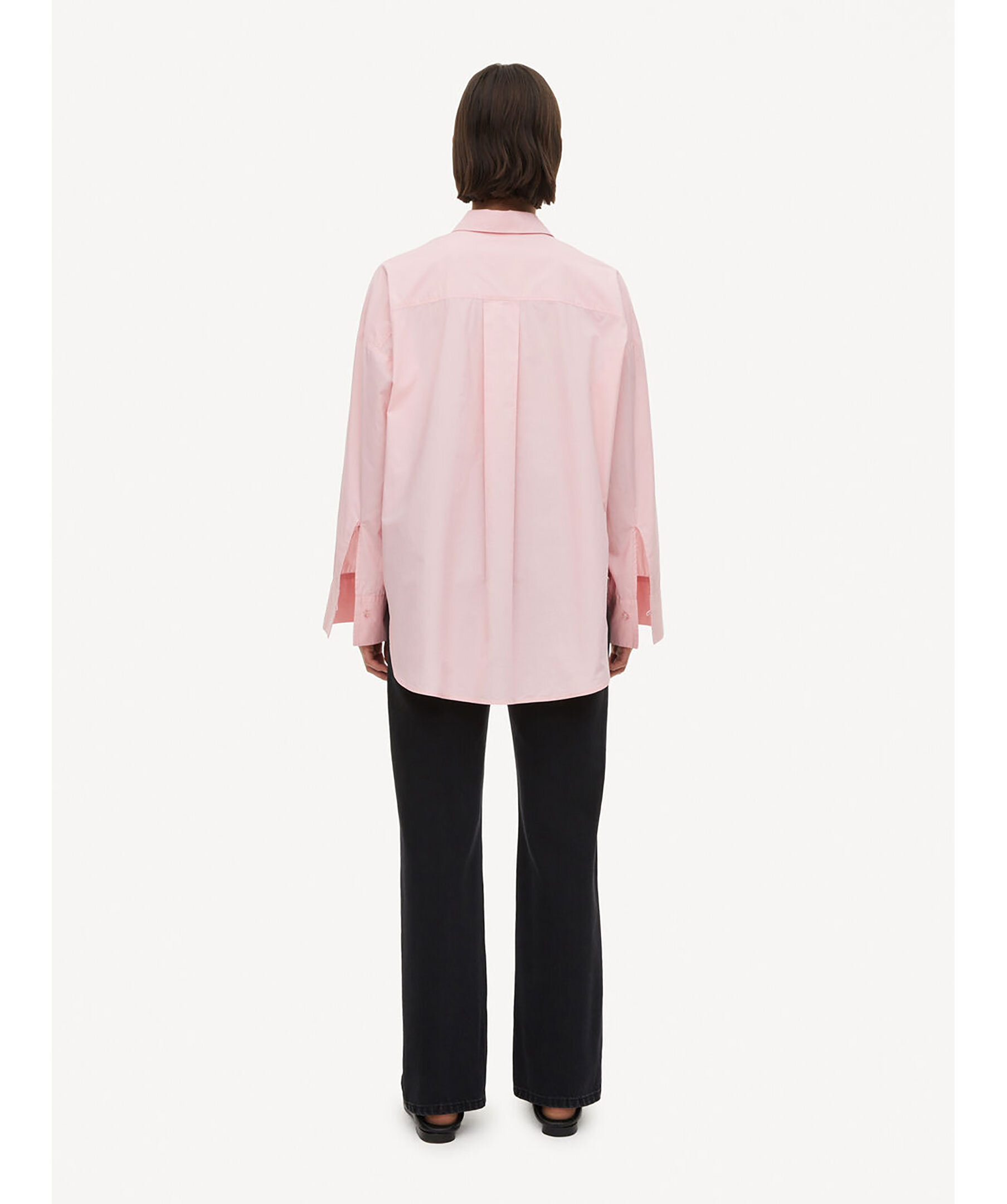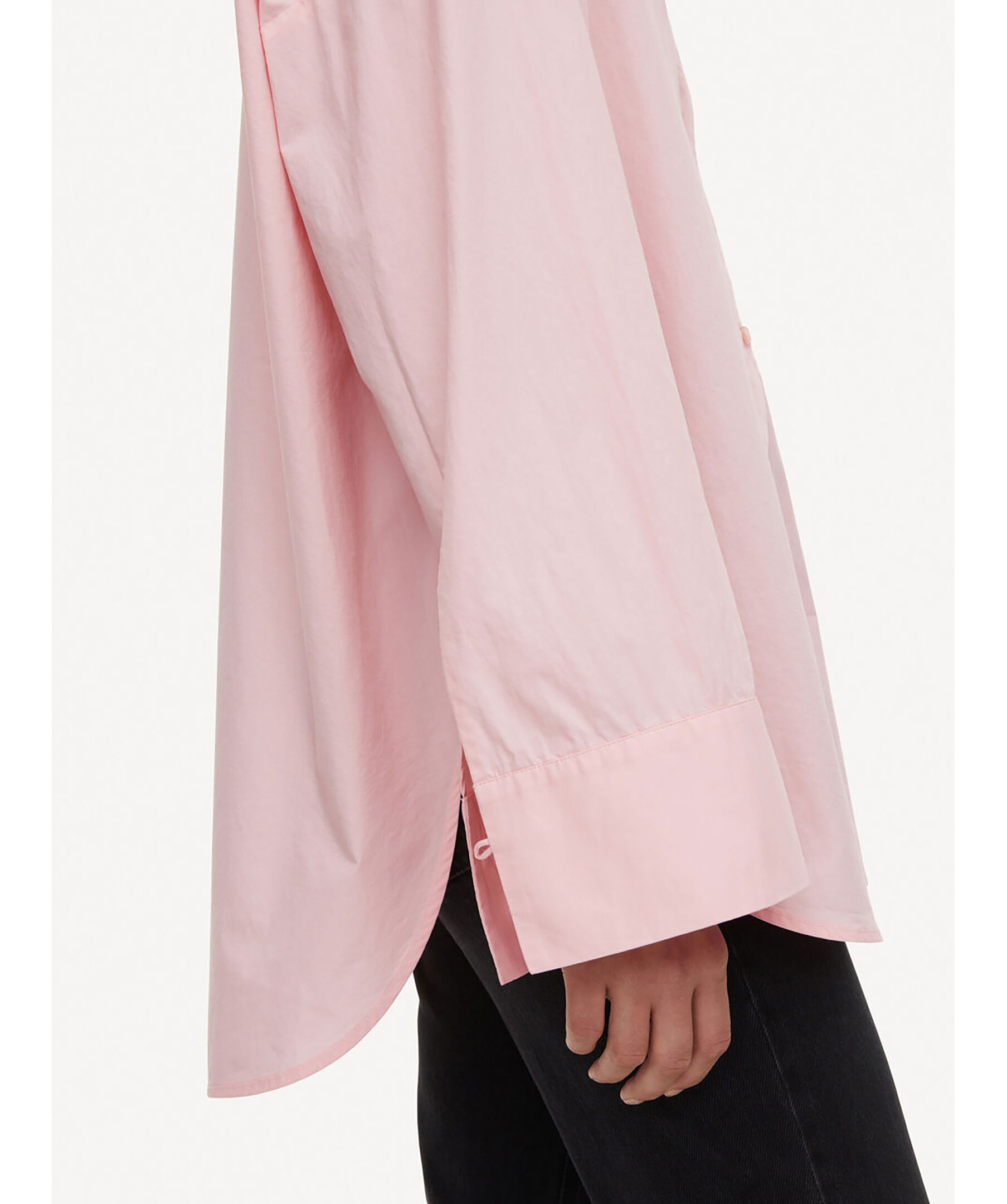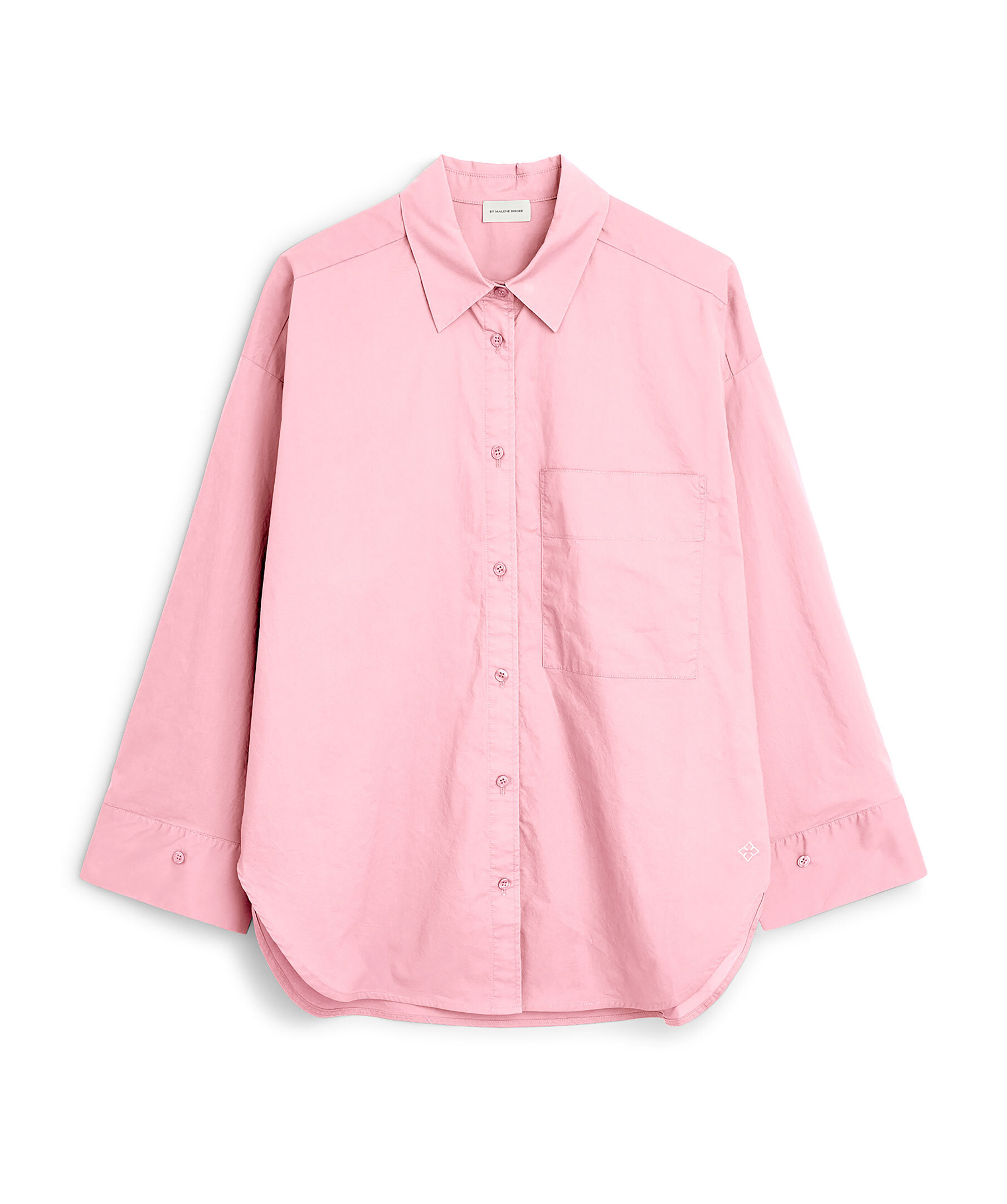 Rosa, klassisk skjorta från by Malene Birger. Tillverkat i ekologisk bomull. Den har knappar hela vägen fram och en spetsig skjortkrage. Knappslå, rundade fållar och främre patchficka. Lös passform, vi rekommenderar att du går ner en storlek.