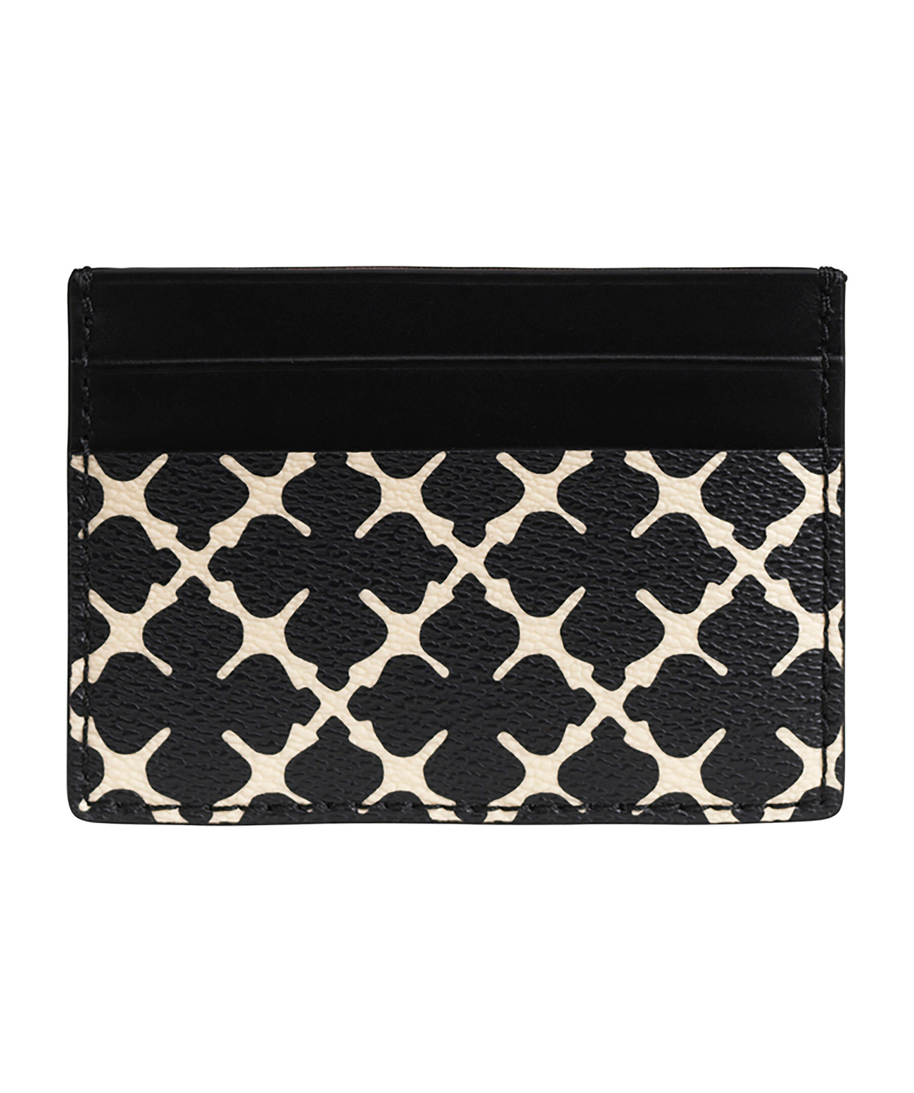 Korthållare från by Malene Birger med deras klassiska mönster i svart och krämvitt. Plats för två kontokort samt mittenfack. Tillverkad i syntet.