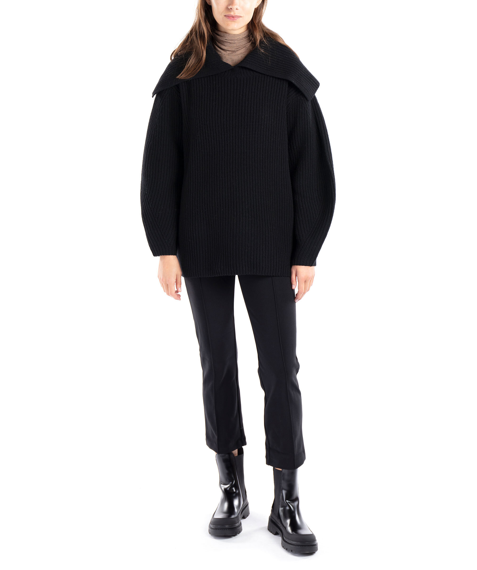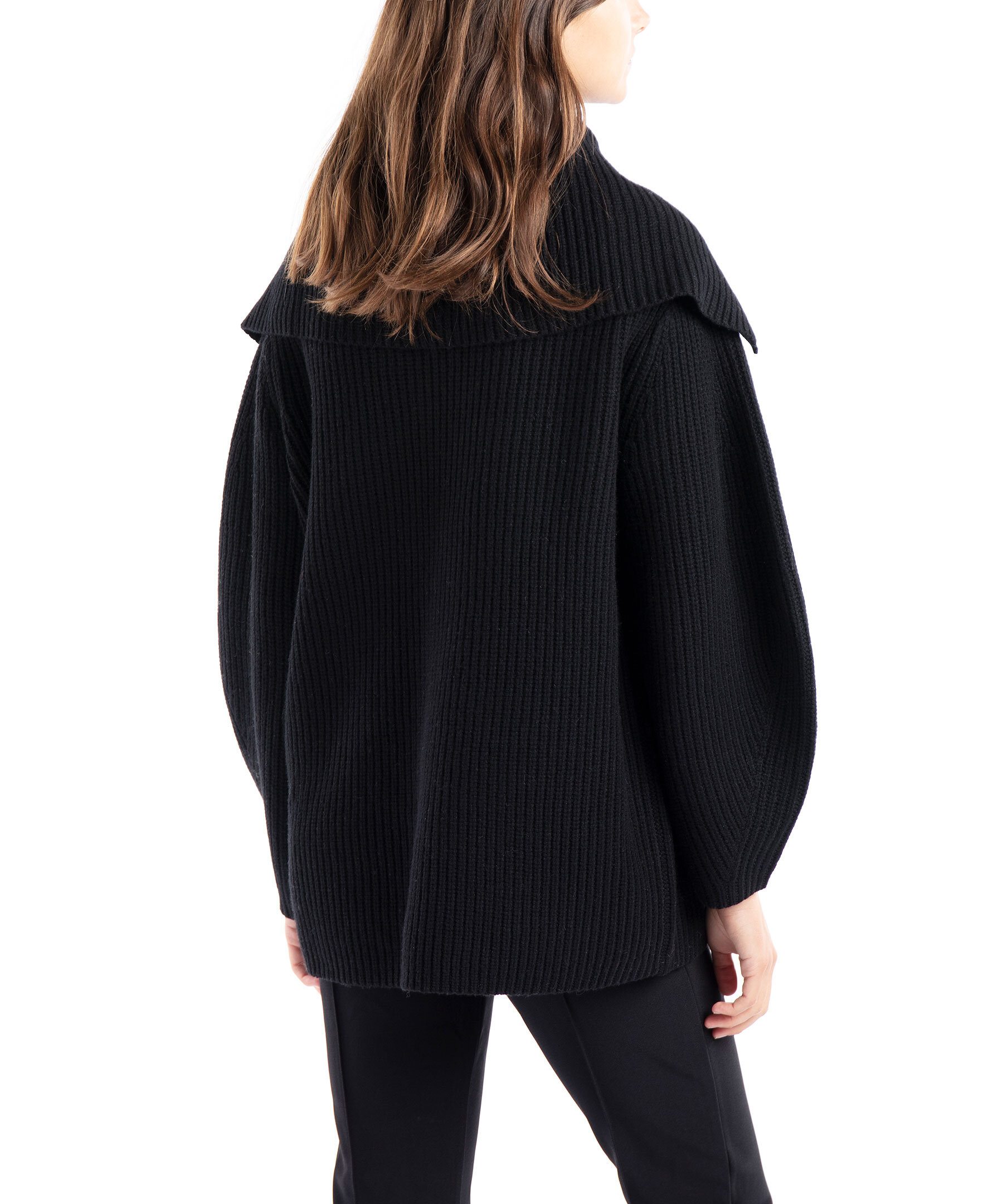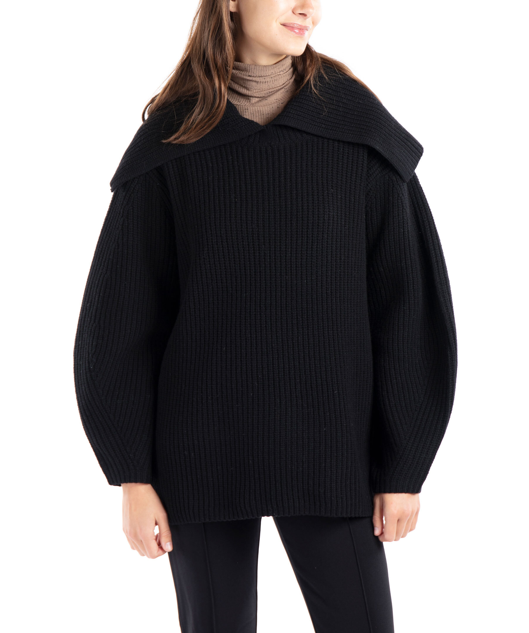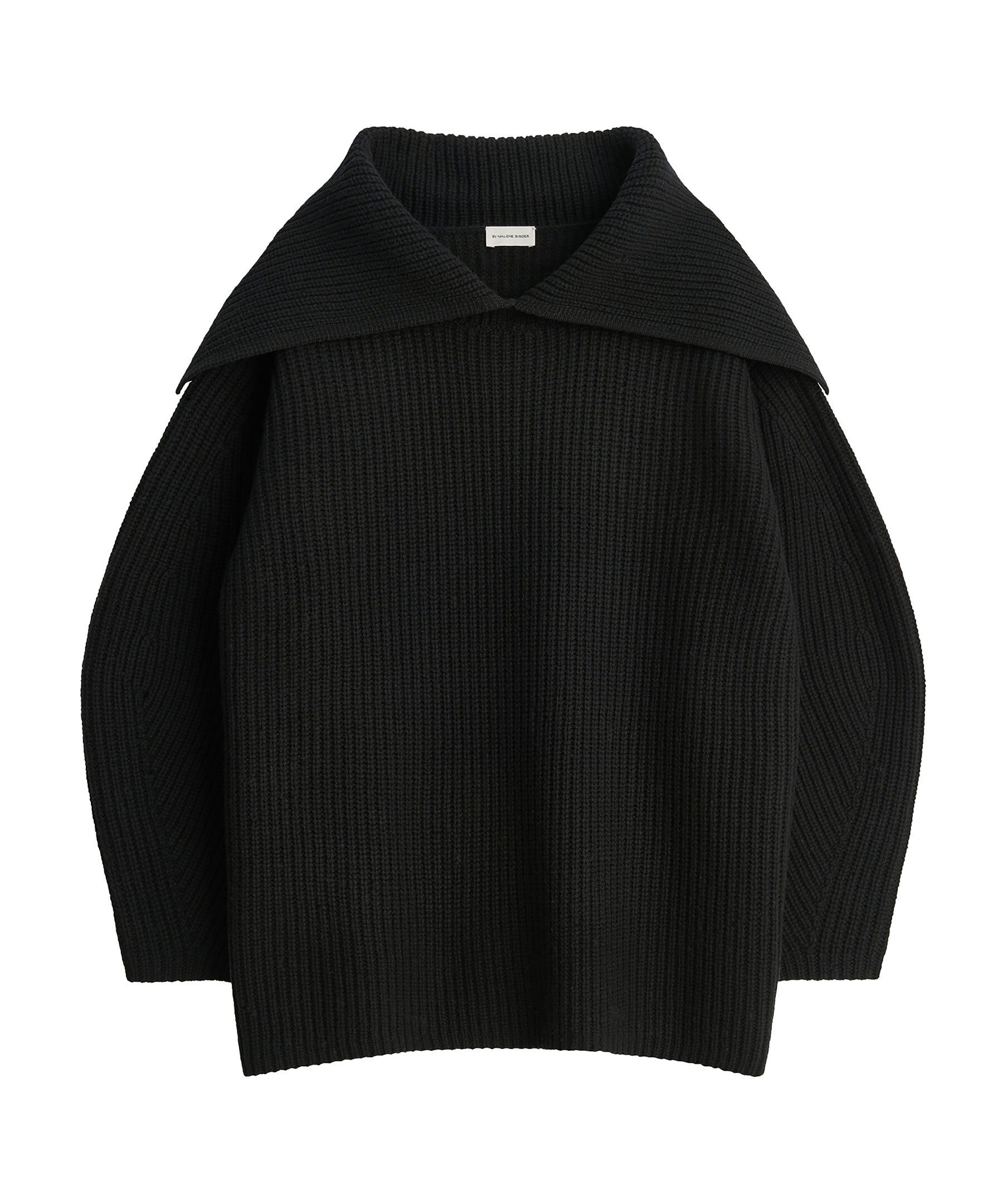 Svart ribbstickad tröja i en oversized passform från By Malene Birger. Tröjan är gjord helt i ull och har en stor stickad krage som går bak mot axlarna. Modellen är 178cm lång och har på sig storlek S.