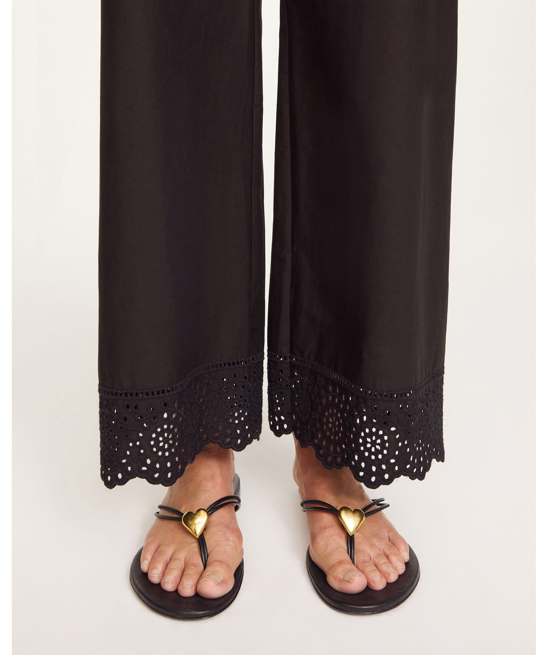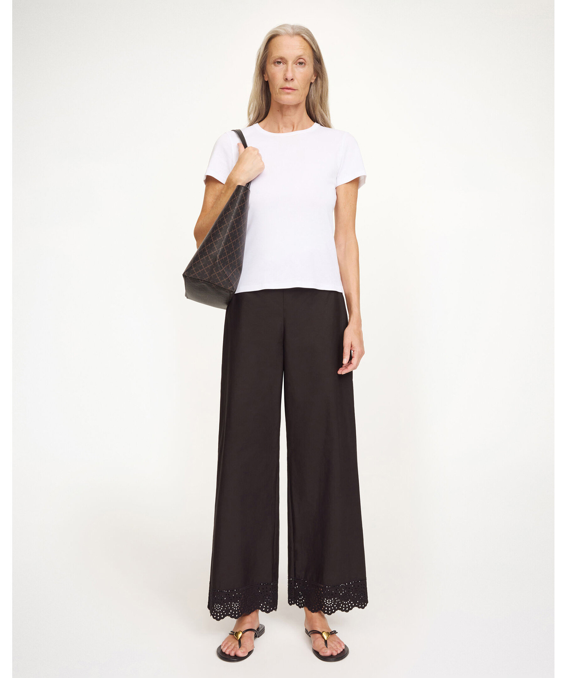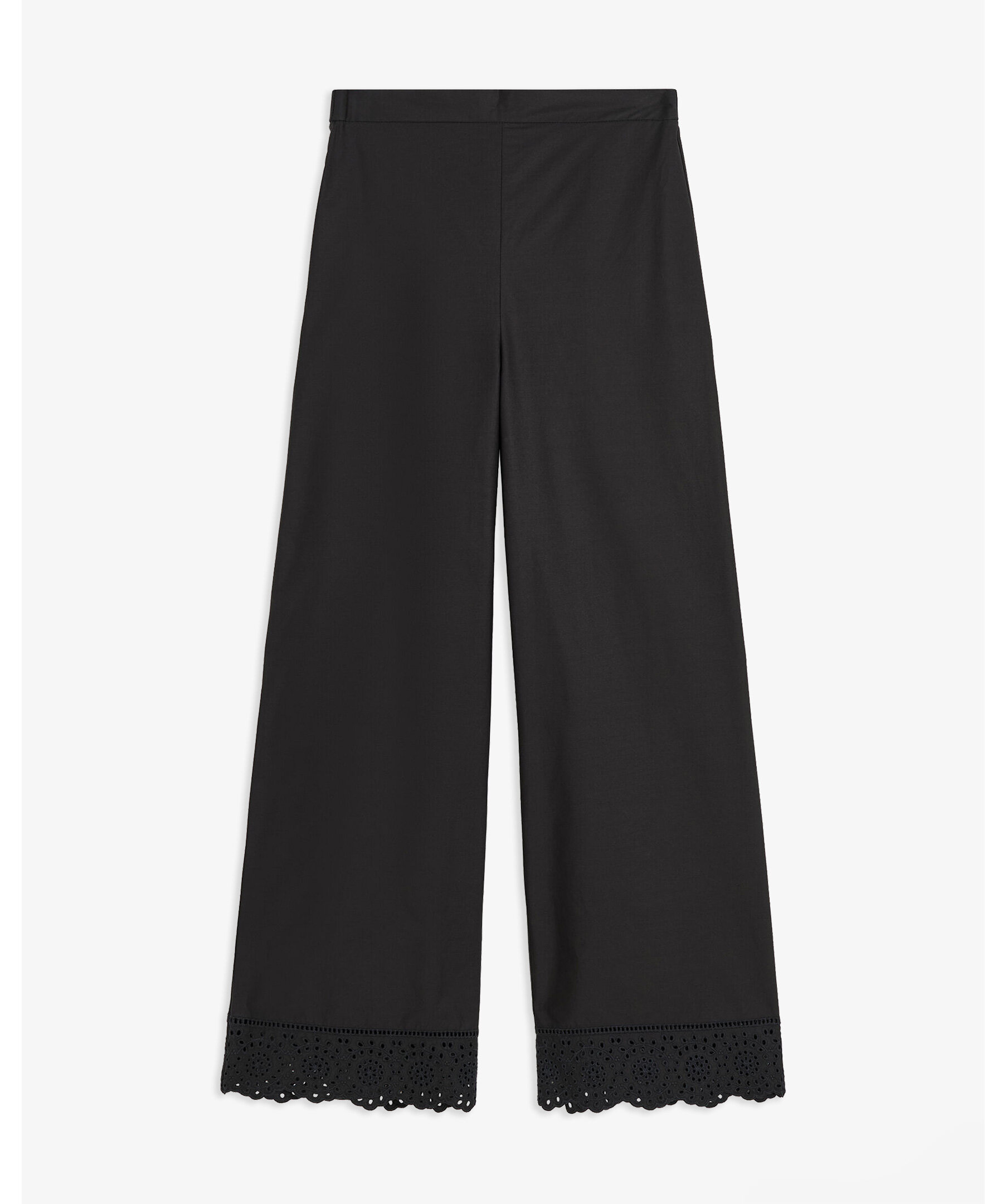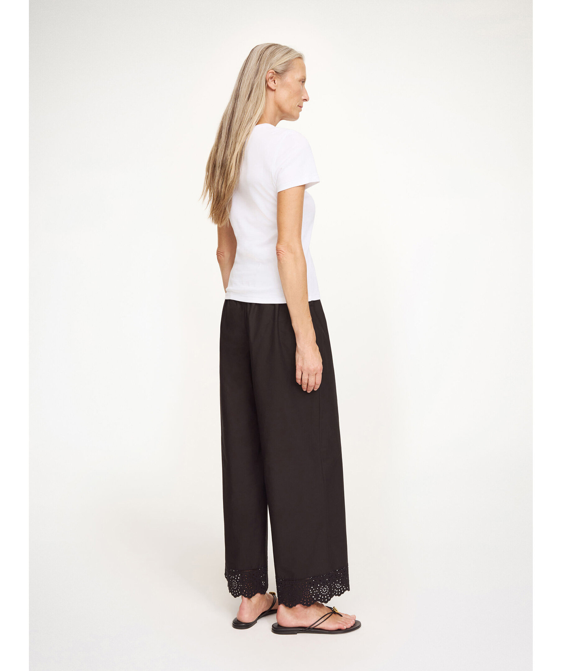 Svarta Gretana Organic Cotton Trousers från By Malene Birger. Byxorna har en vid benform och en bekväm, elastisk midja med broderie anglaise‑detaljer som ger en subtil feminin touch och ett elegant fall – perfekta att bära med en matchande topp eller en stilren blus för både vardag och mer dressade tillfällen.