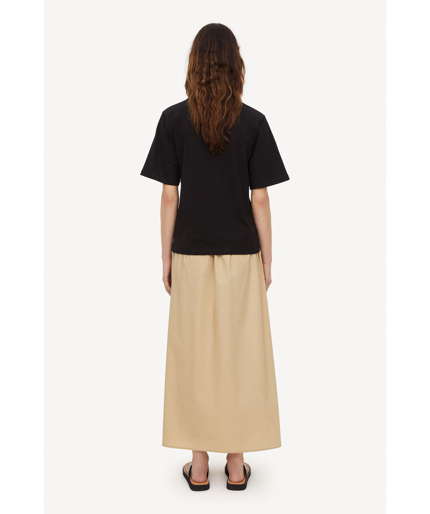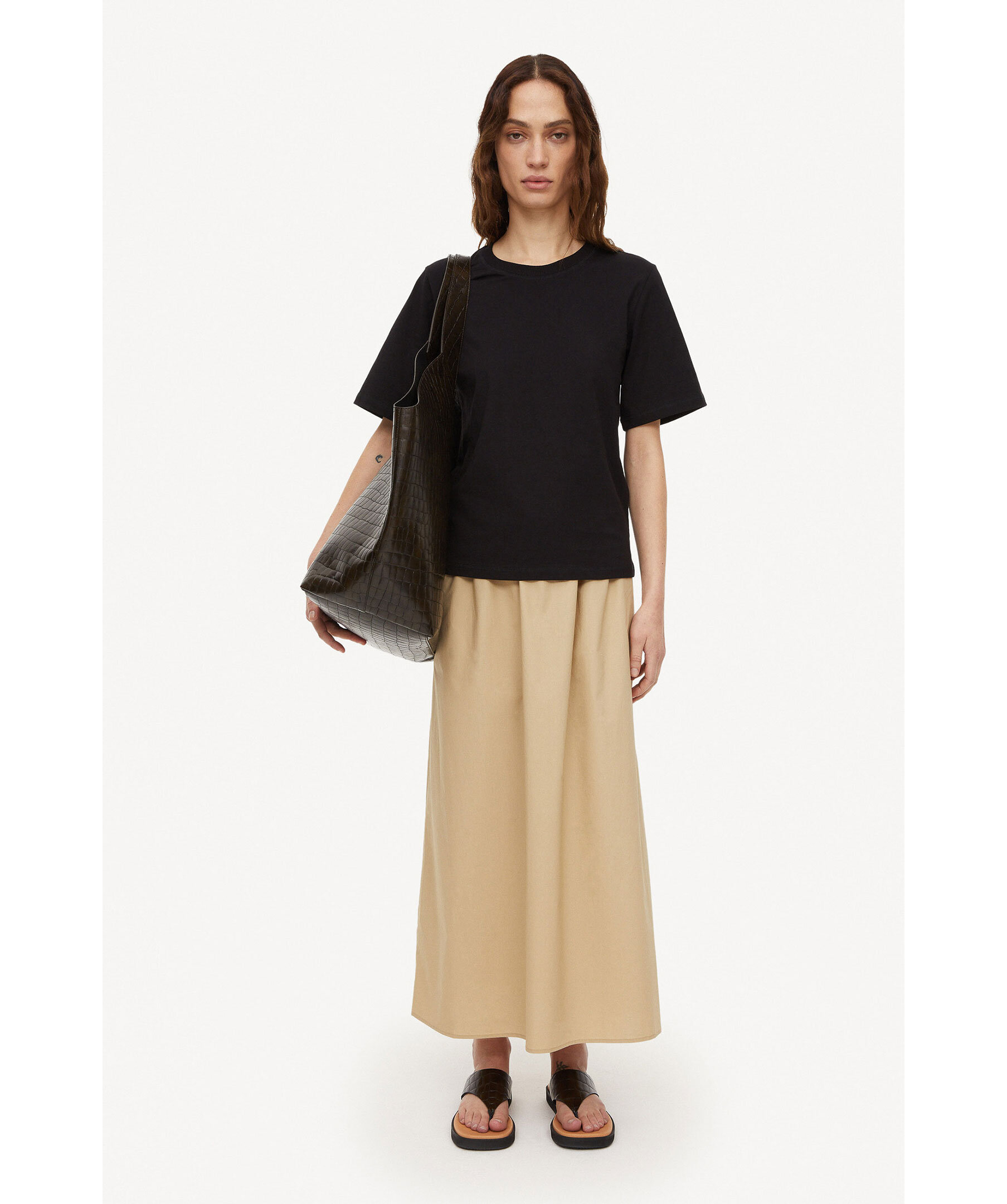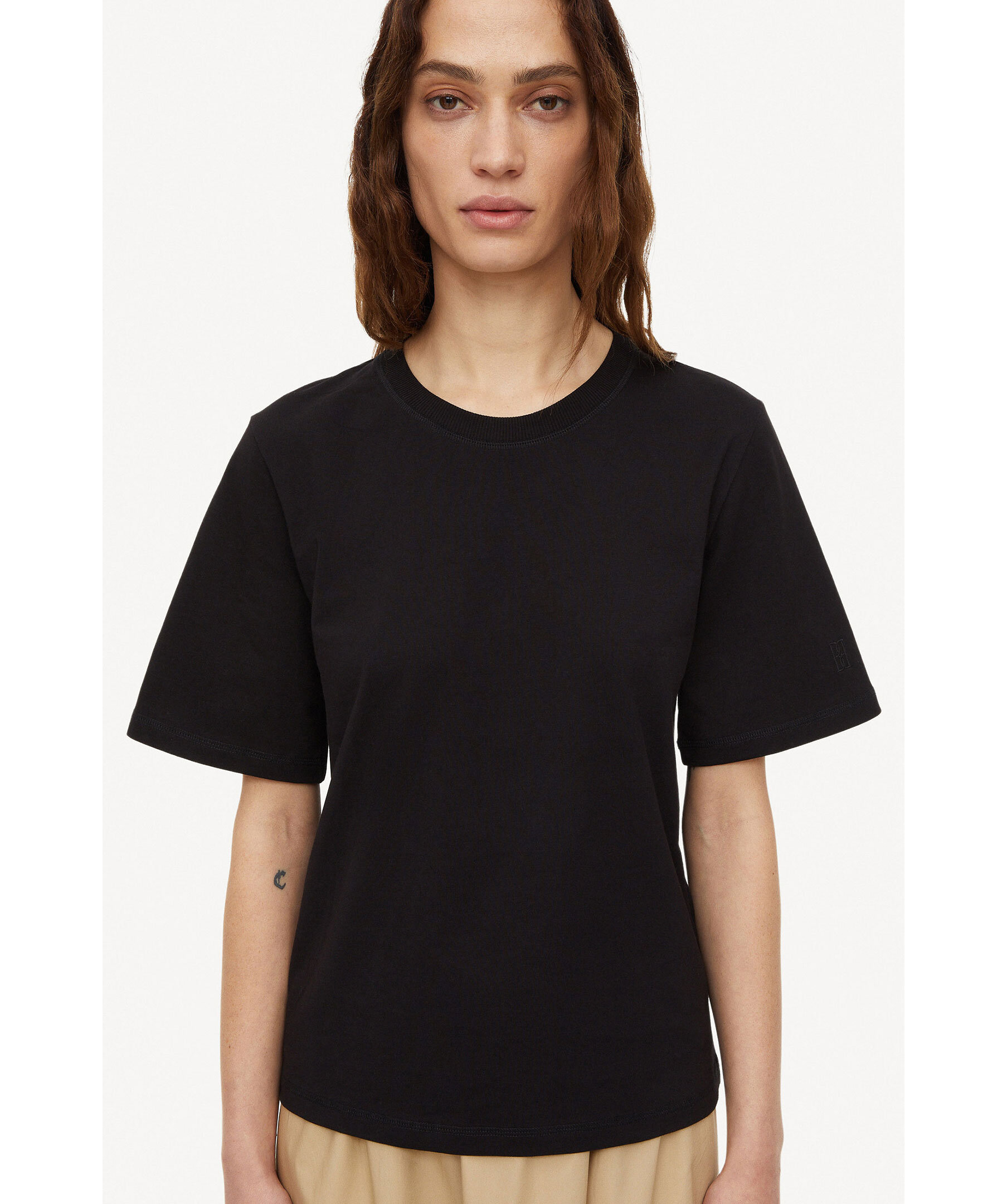 Svart T-shirt från By Malene Birger. Rundad halsringning med ribbstickad kant. Broderad logotyp på vänster ärm. Dekorativa overlocksömmar. Tillverkad i 100% Ekologisk Bomull.