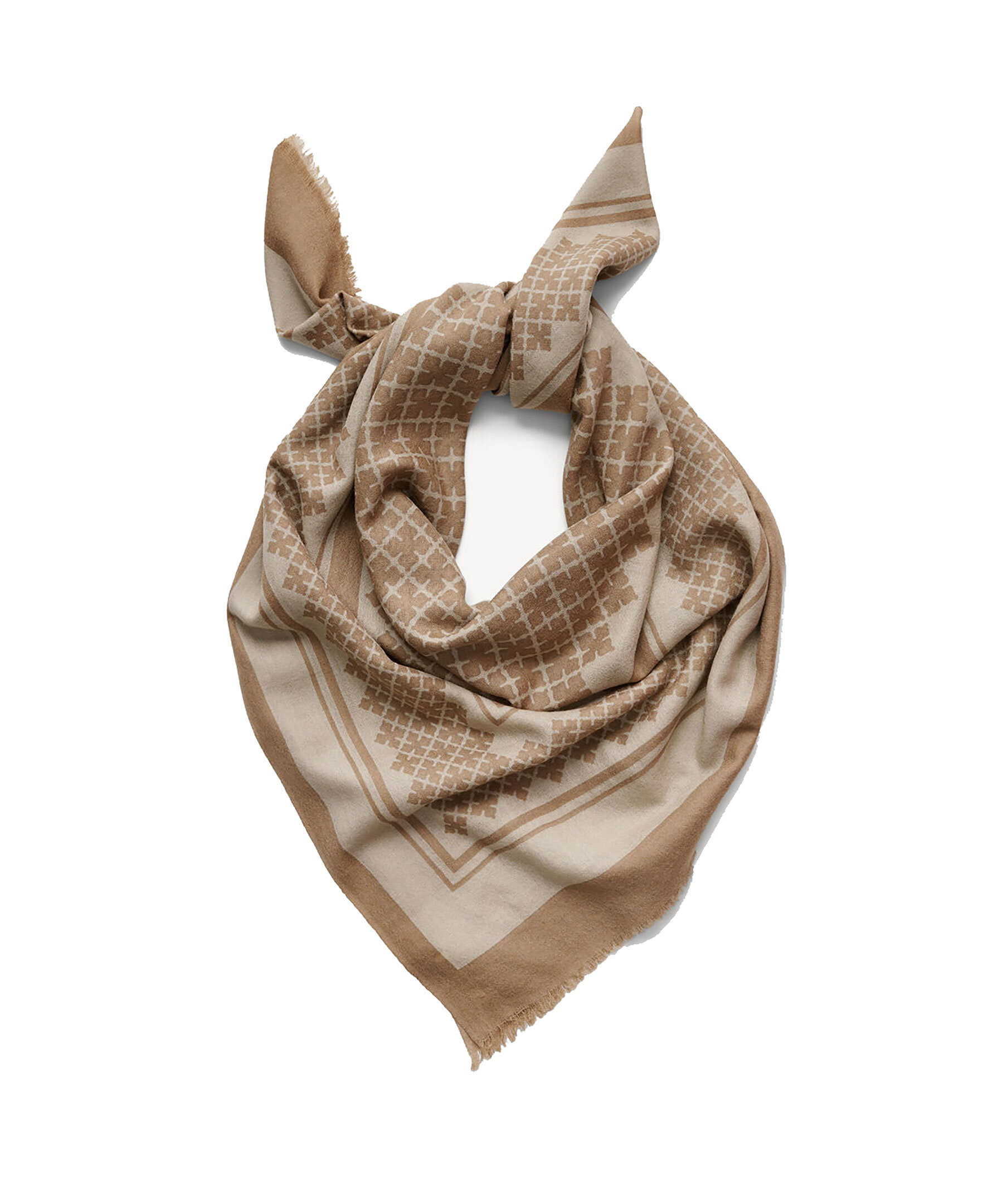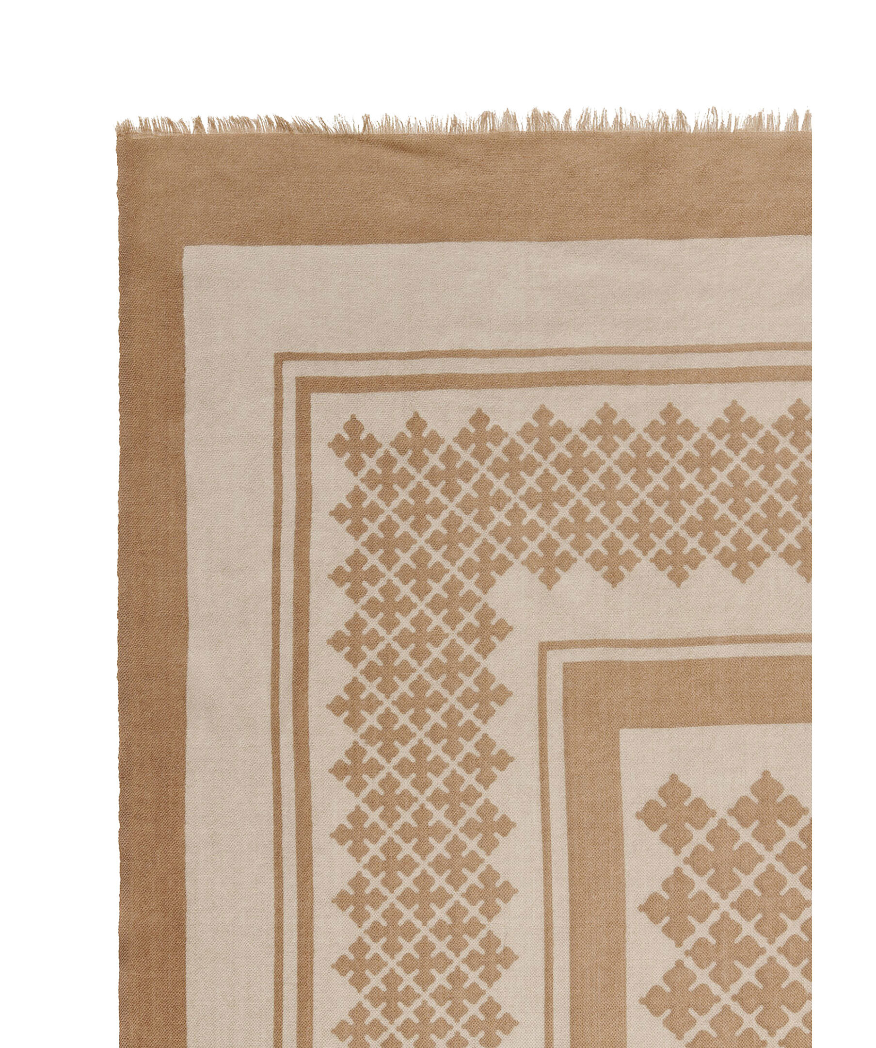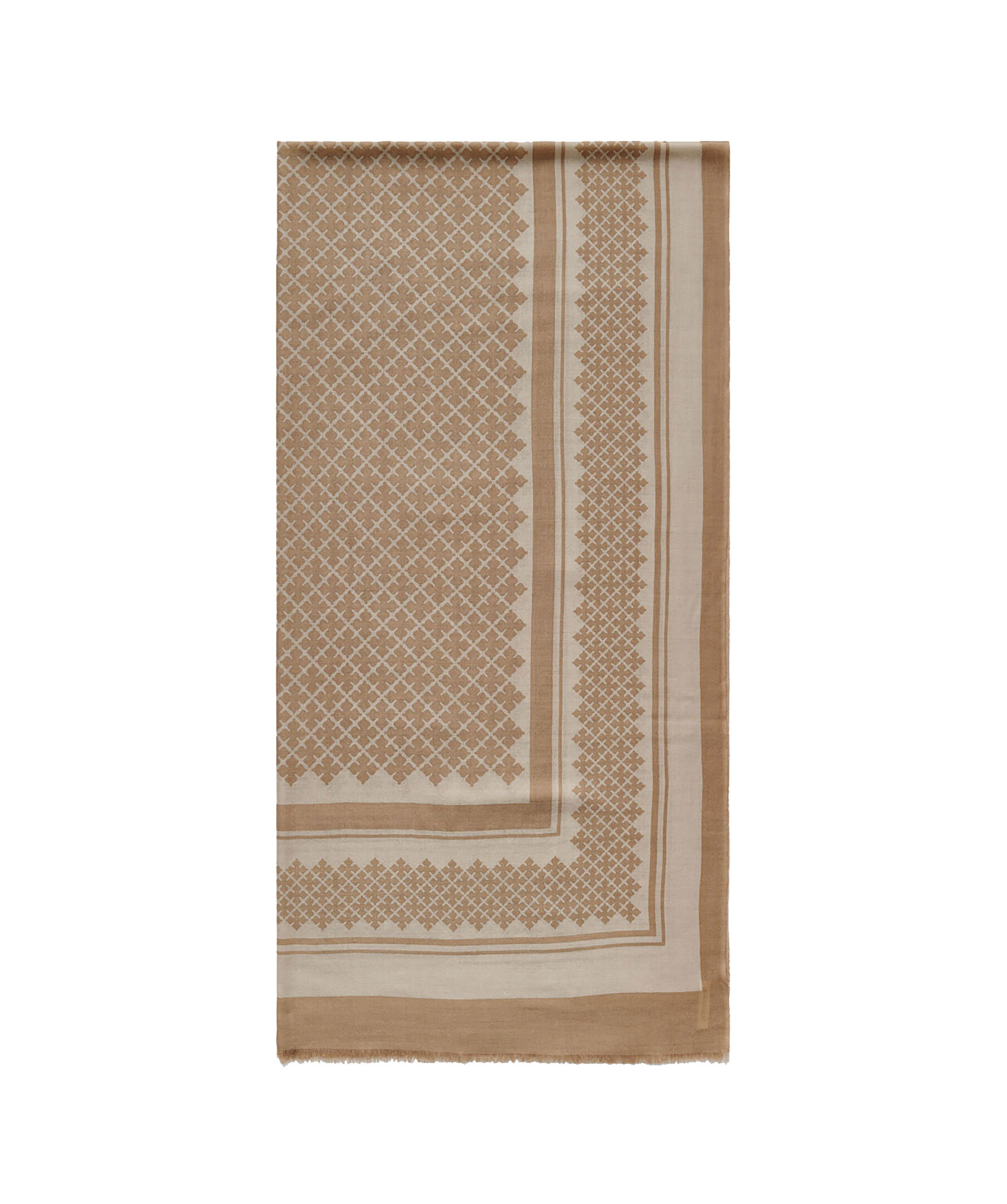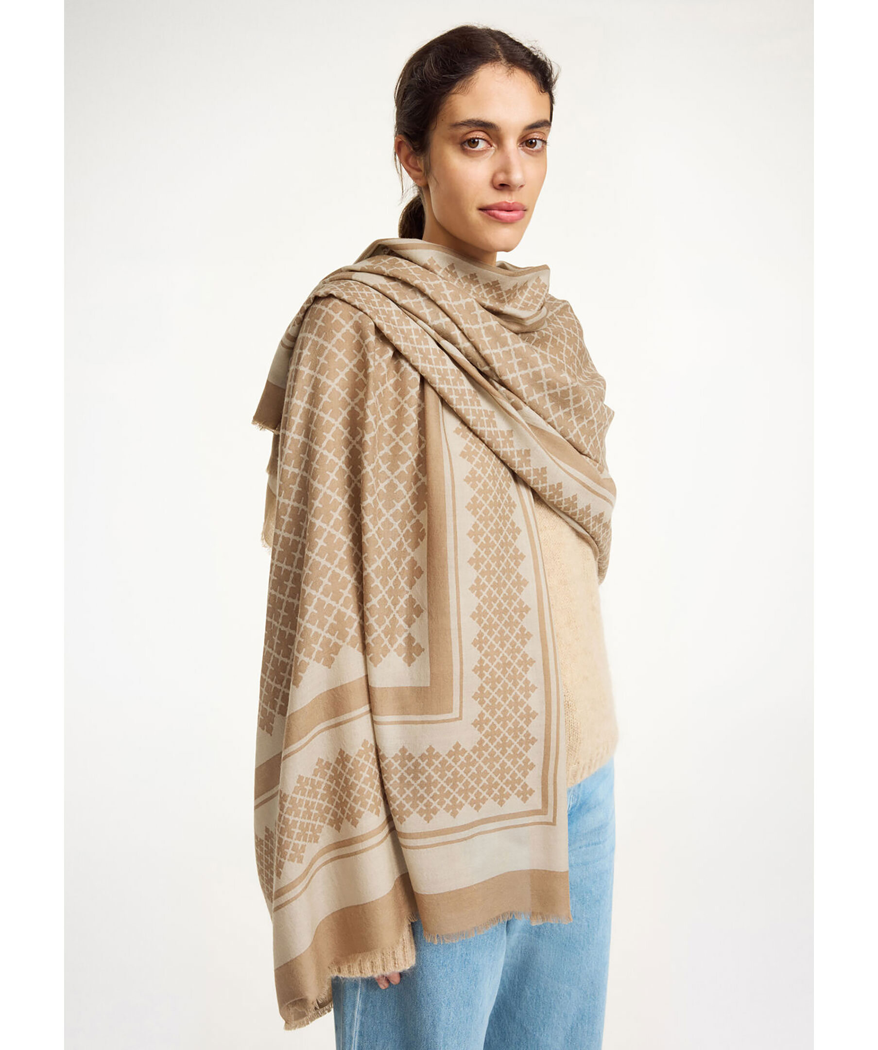 Beige scarf från By Malene Birger. Scarfens rektangulära siluett är utsmyckad med Malene Birgers signatur blommönster och fransar. Tillverkad i 100% ull.