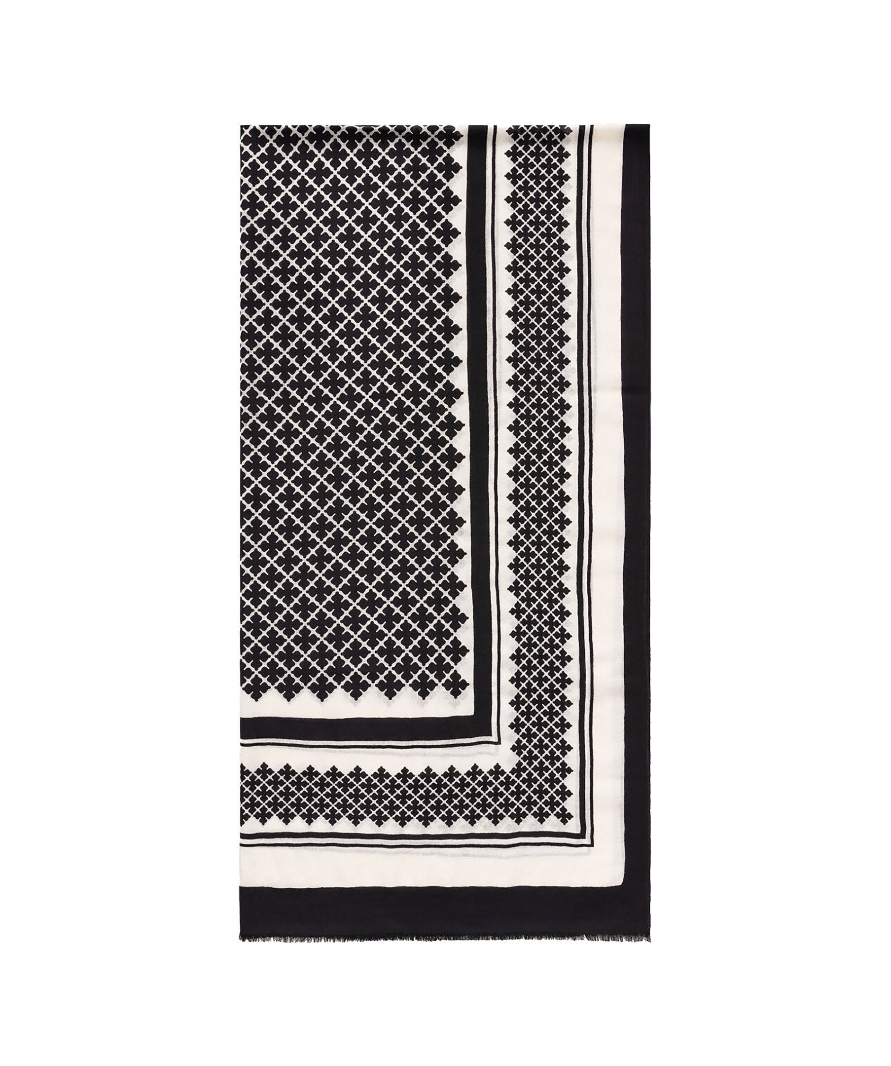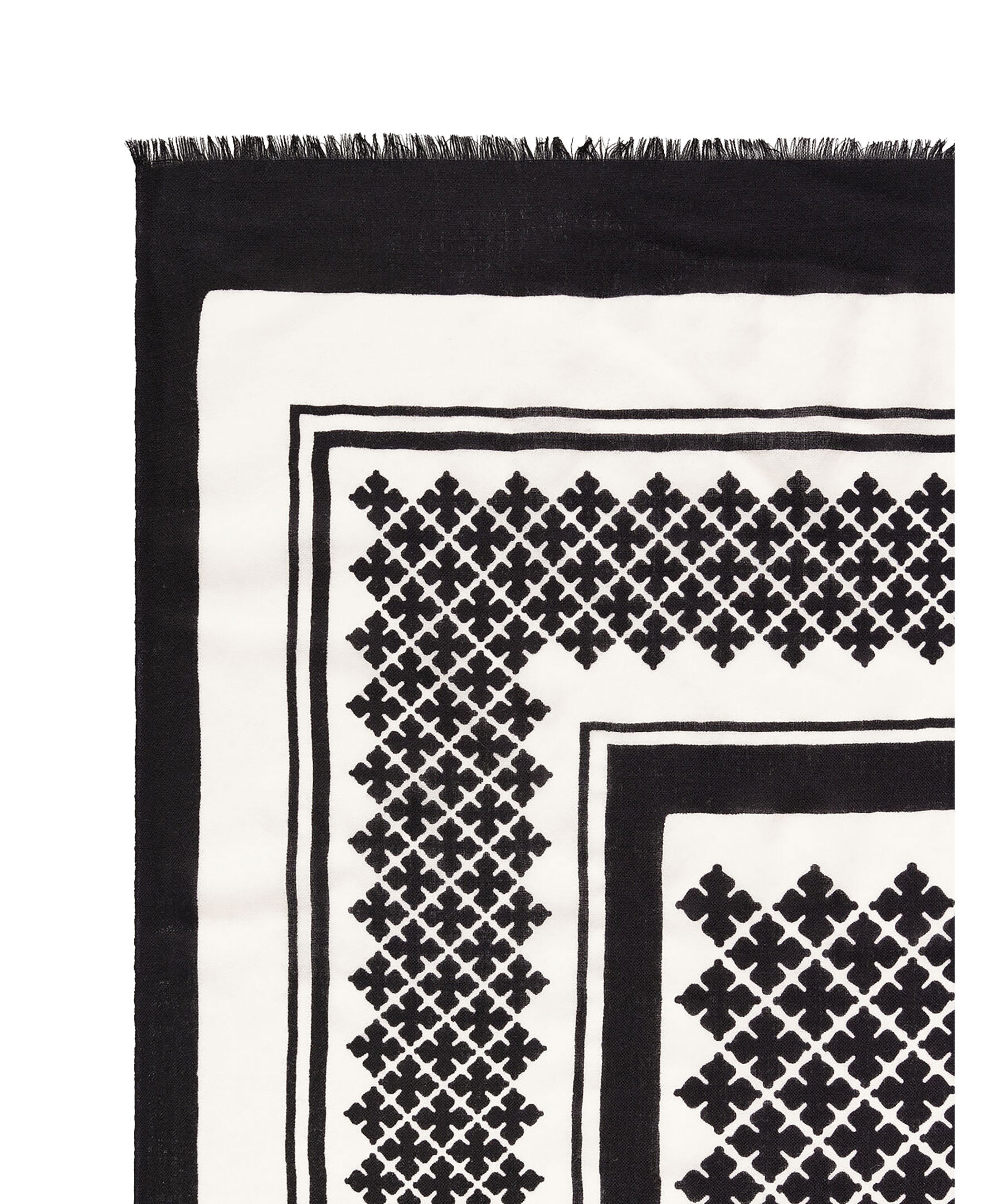Vit scarf med svarta mönster från By Malene Birger. Scarfens rektangulära siluett är utsmyckad med Malene Birgers signatur blommönster och fransar. Tillverkad i 100% ull. Mått: 100x 200 cm.