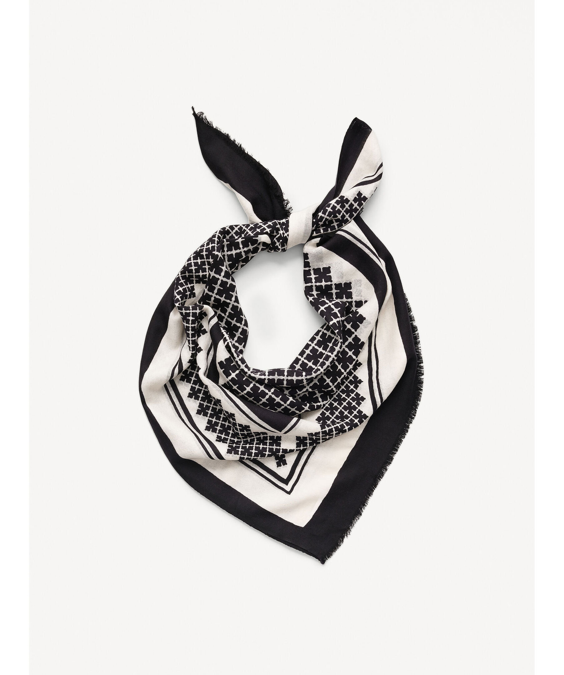 Vit scarf med svarta mönster från By Malene Birger. Scarfens rektangulära siluett är utsmyckad med Malene Birgers signatur blommönster och fransar. Tillverkad i 100% ull. Mått: 100x 200 cm.