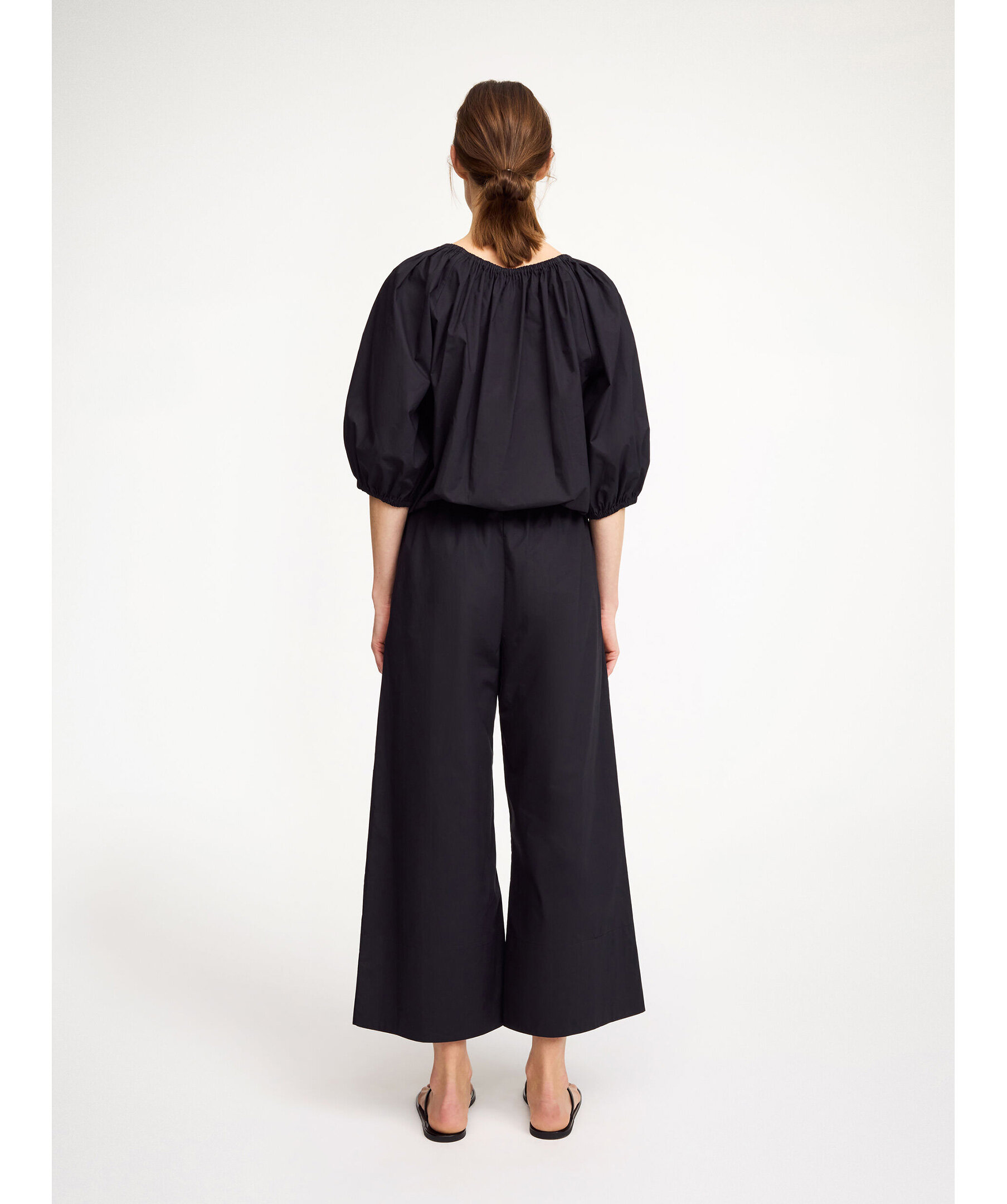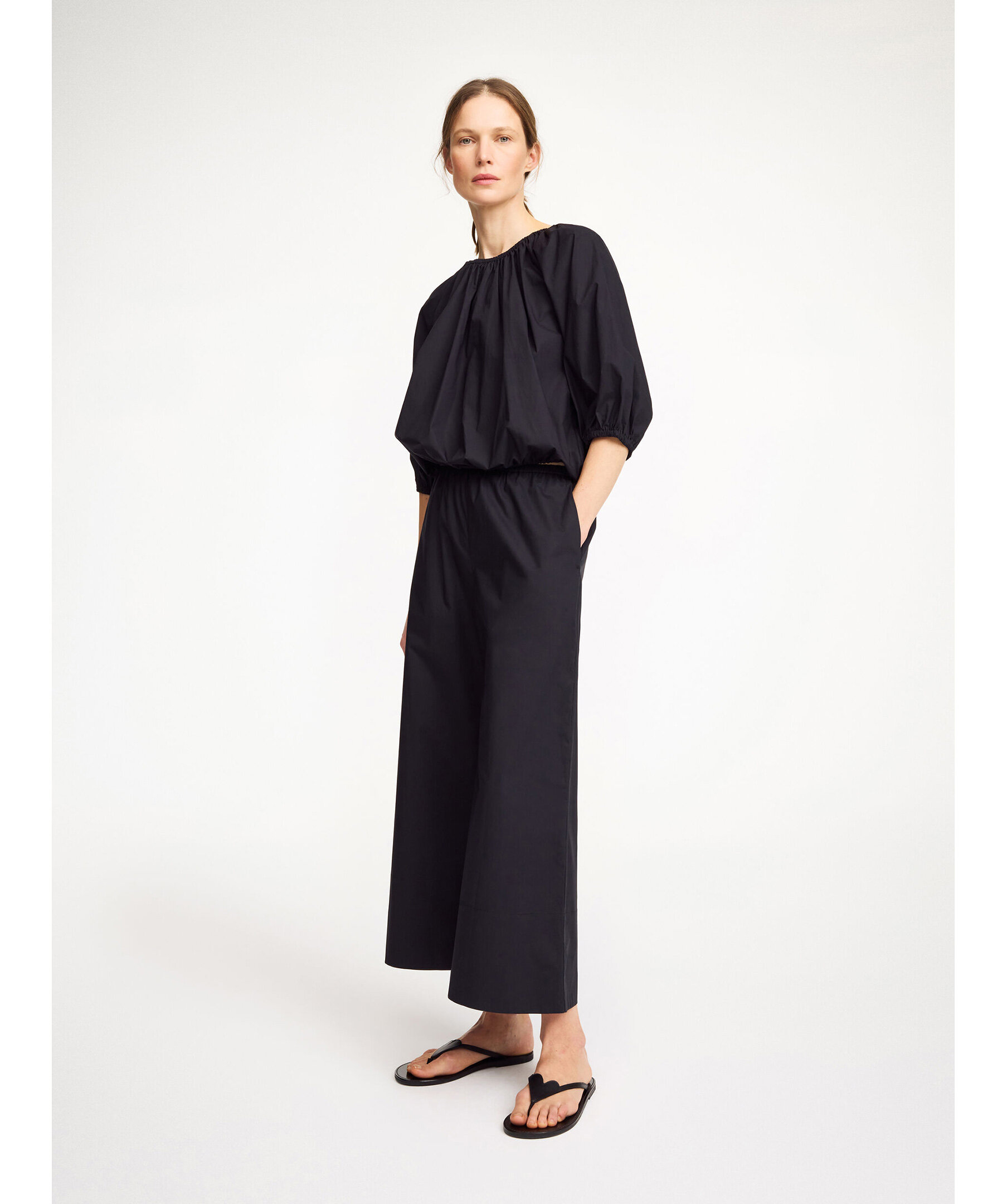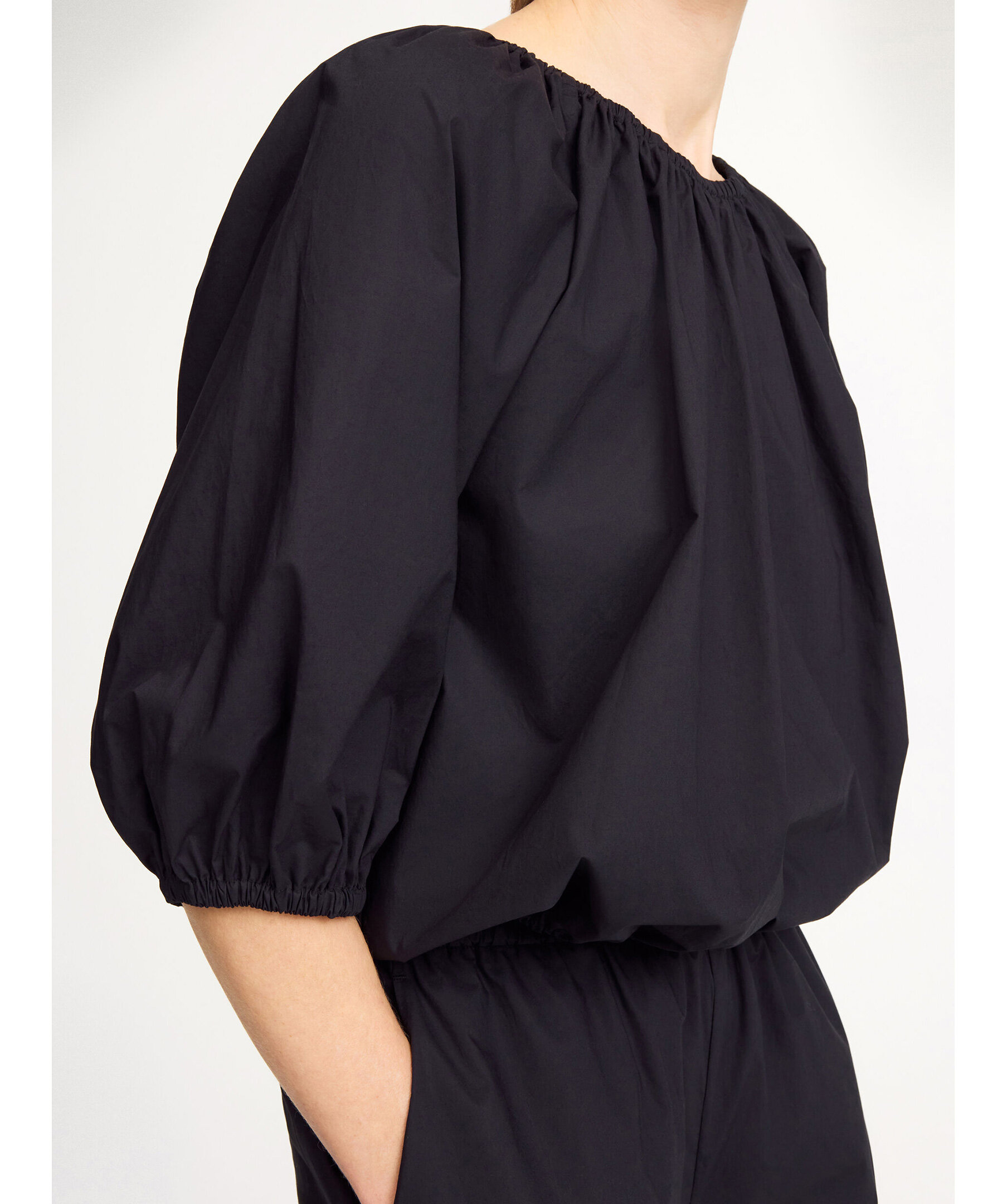 Svart Lelow organic cotton blouse från By Malene Birger. Blusen har en voluminös, luftig silhuett med elastiska avslut i halsringning, ärmslut och fåll som gör att den kan stylas både on och off shoulder för varierade looks. Tillverkad i krispig ekologisk bomull med en loose fit‑form som ger avslappnad elegans och modern känsla – ett perfekt val för både vardag och fest.