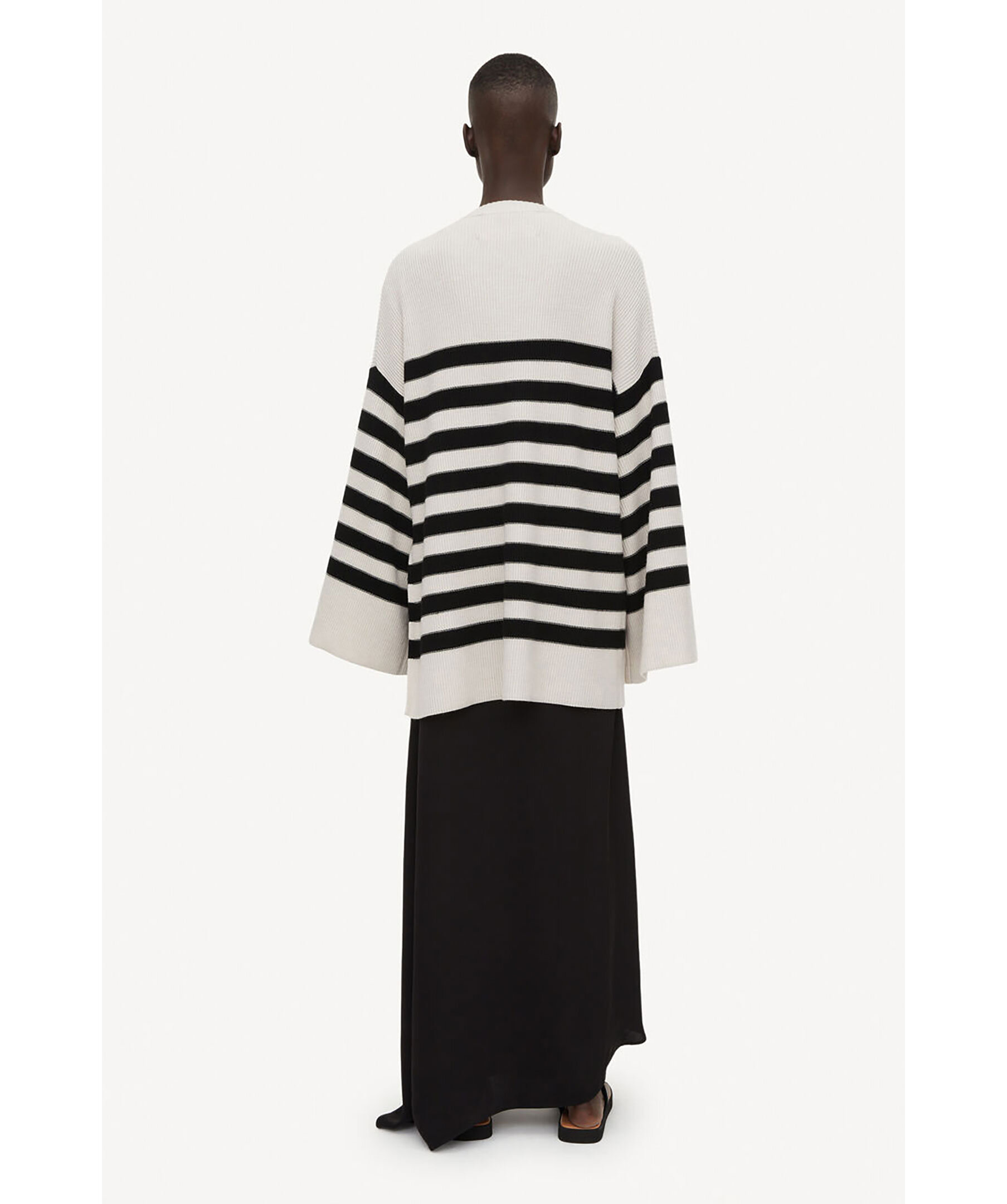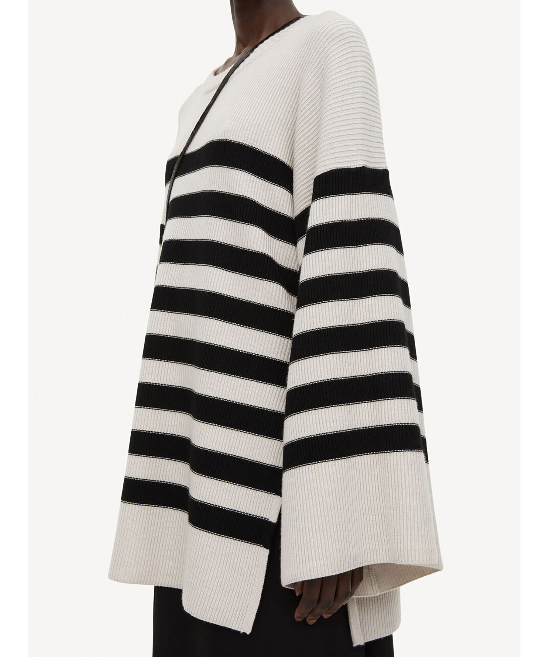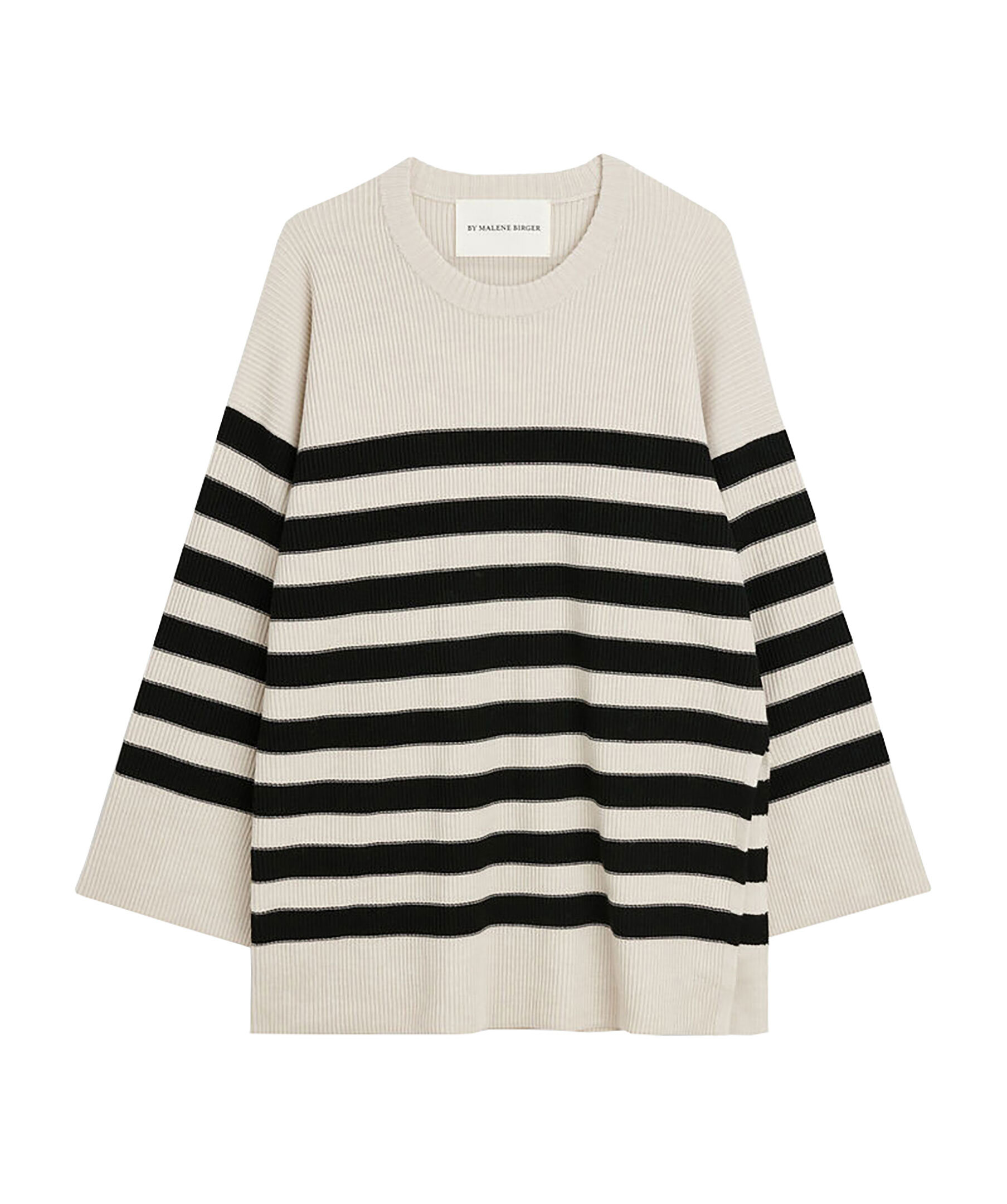 Beige och svart randig stickad tröja från By Malene Birger. Tröjan har en oversized passform och vida ärmar. Höga slitsar i sidorna. Tillverkad i merinoull.