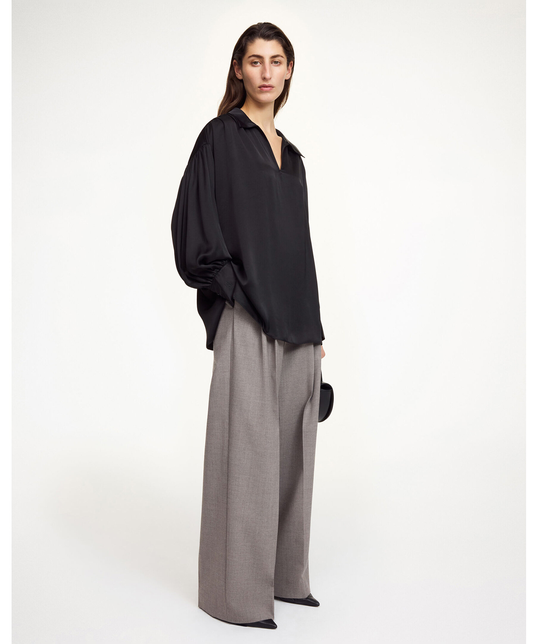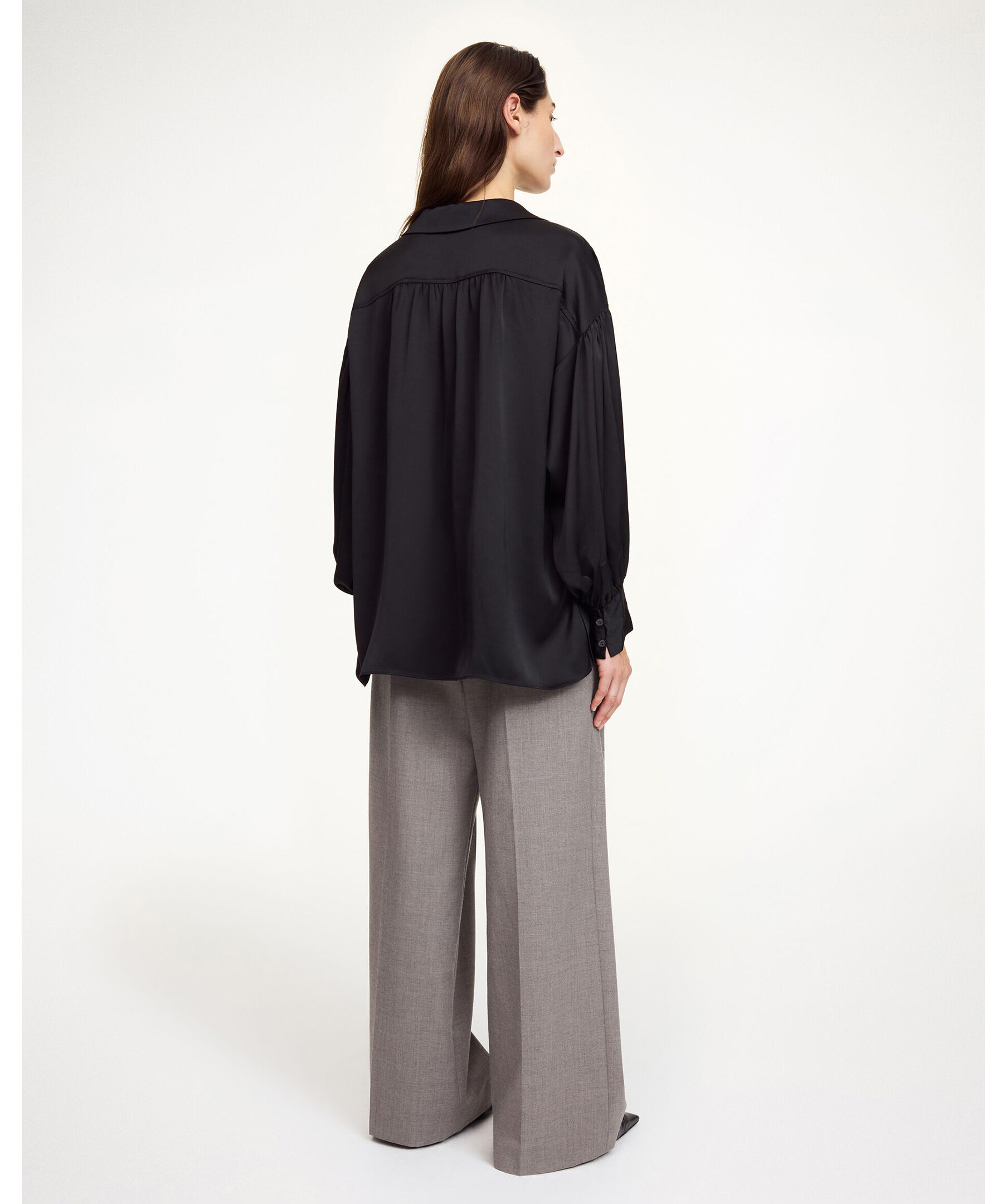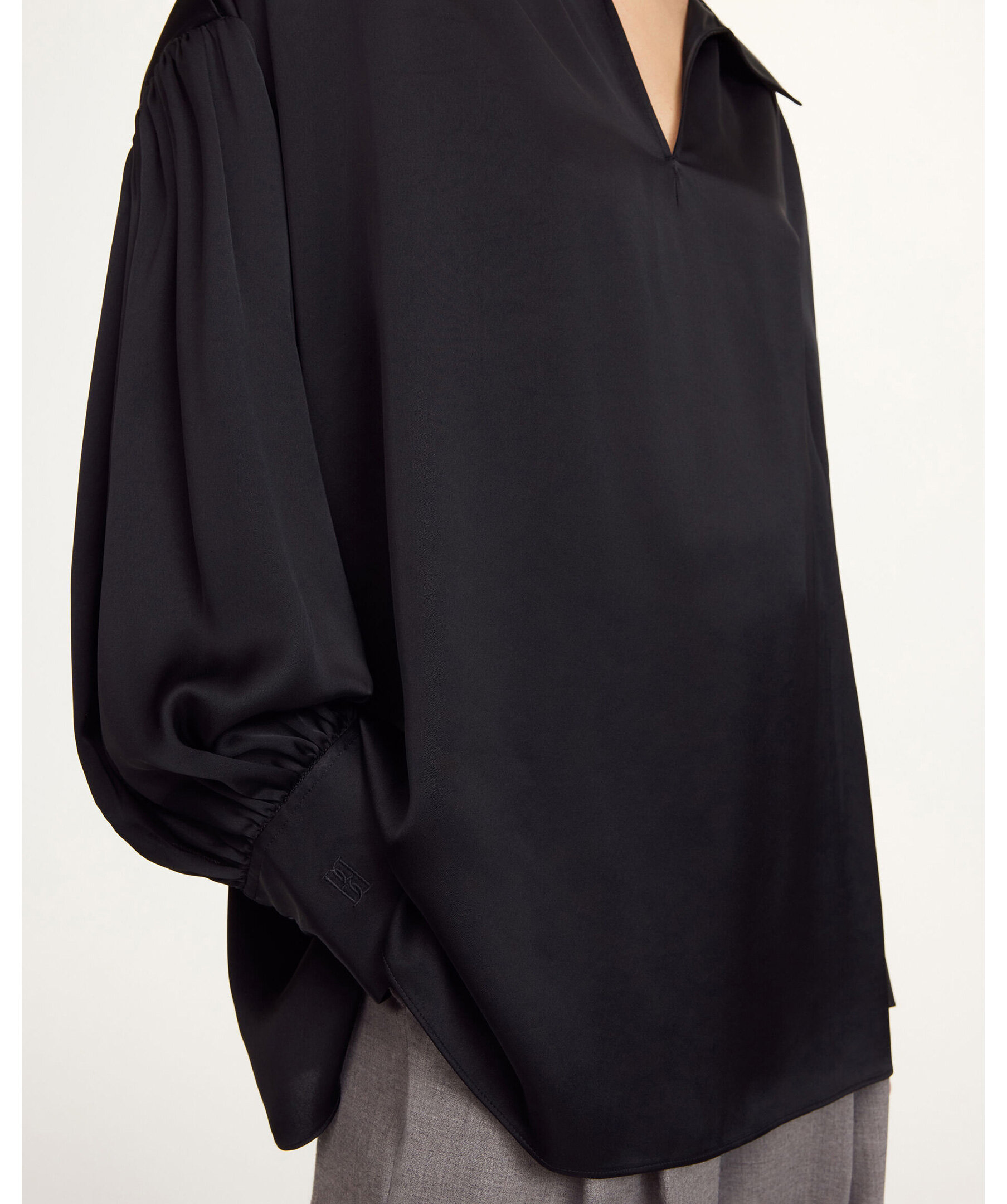 Elegant blus från By Malene Birger med en minimalistisk siluett. Tillverkad i mjuk, glansig satin med en tunikaliknande design, skarp krage, V-ringning och manschetter med knappar. Små sidslitsar och ett diskret broderat monogram adderar en sofistikerad finish – ett plagg som passar lika bra till vardags som till fest.