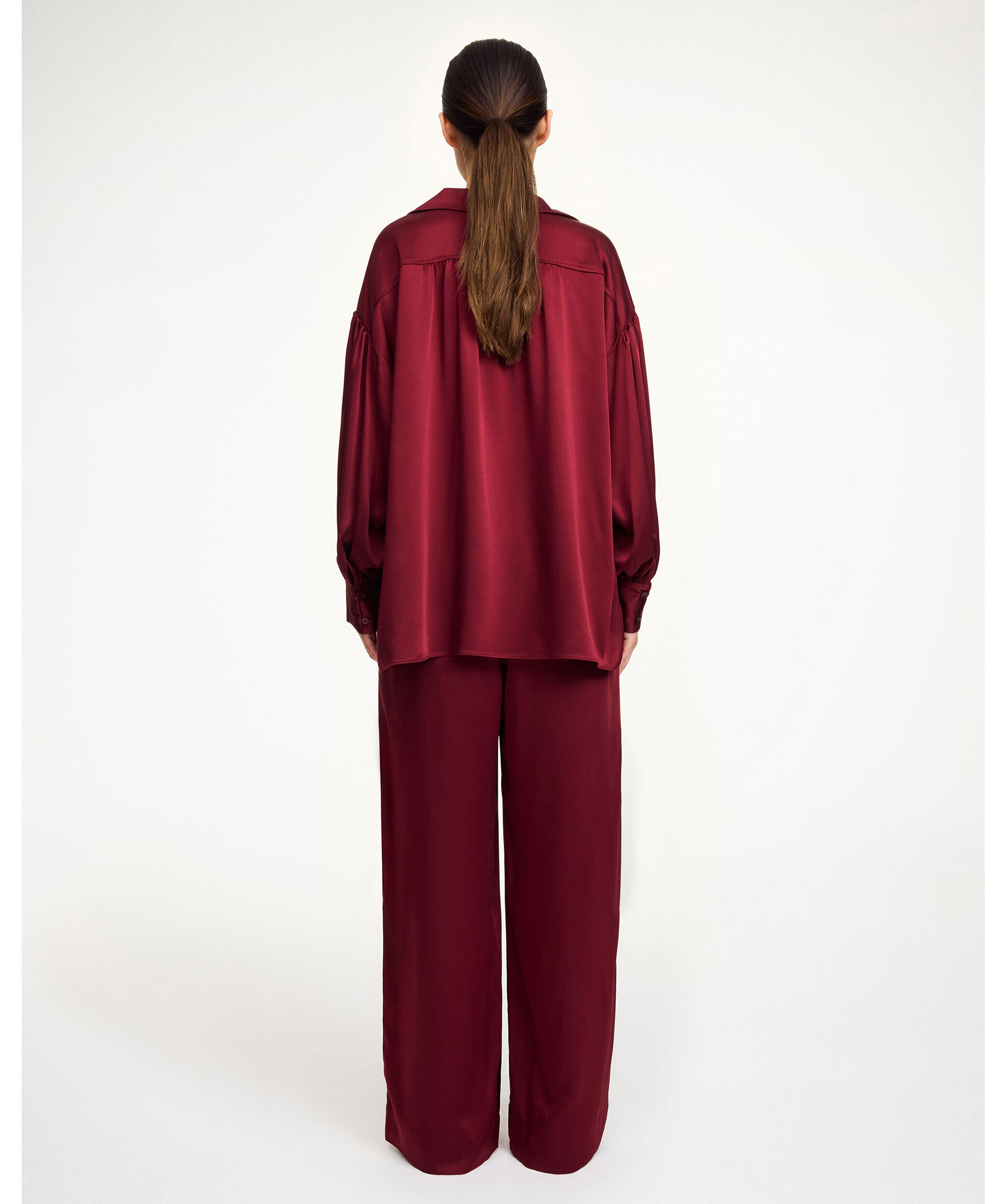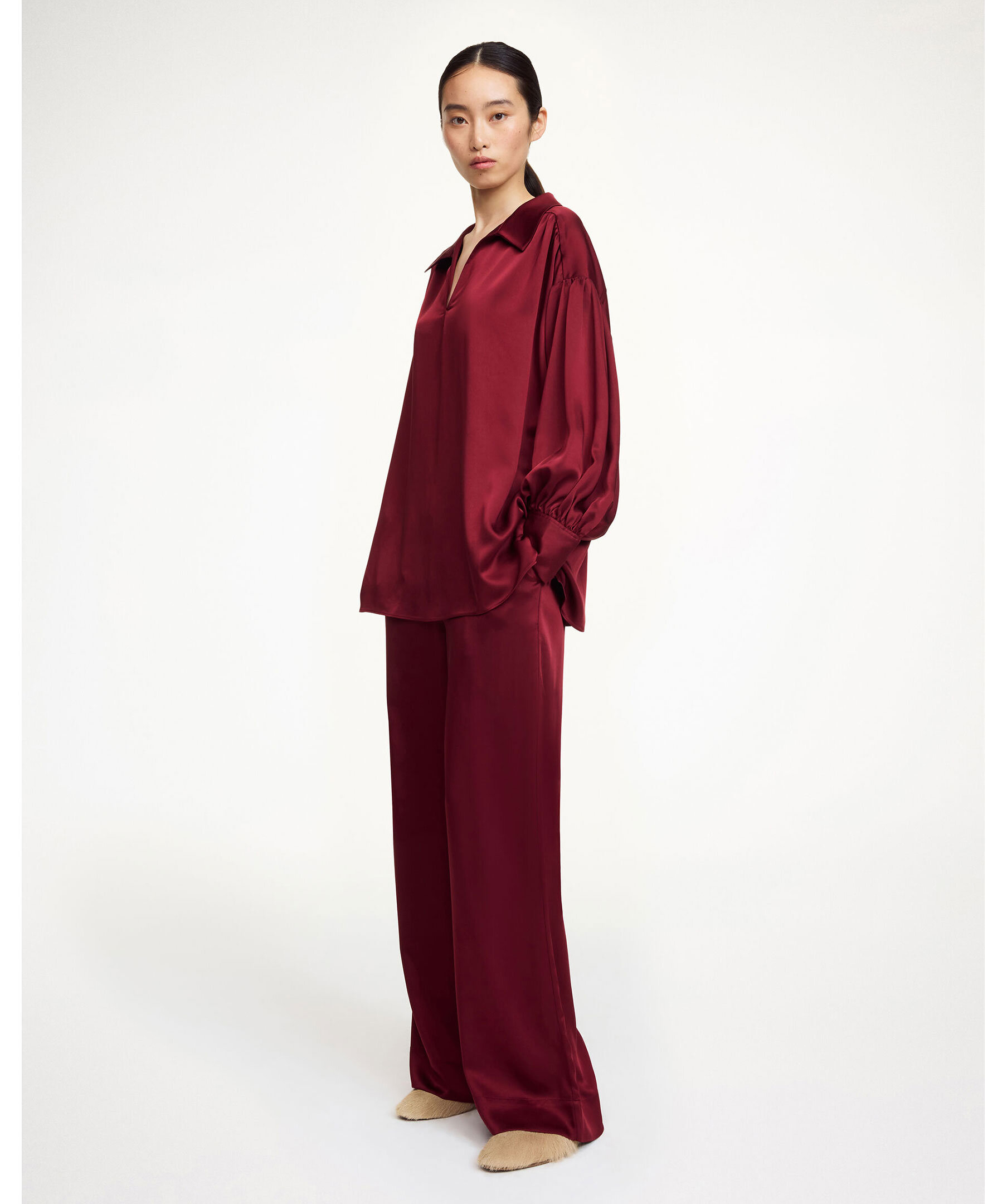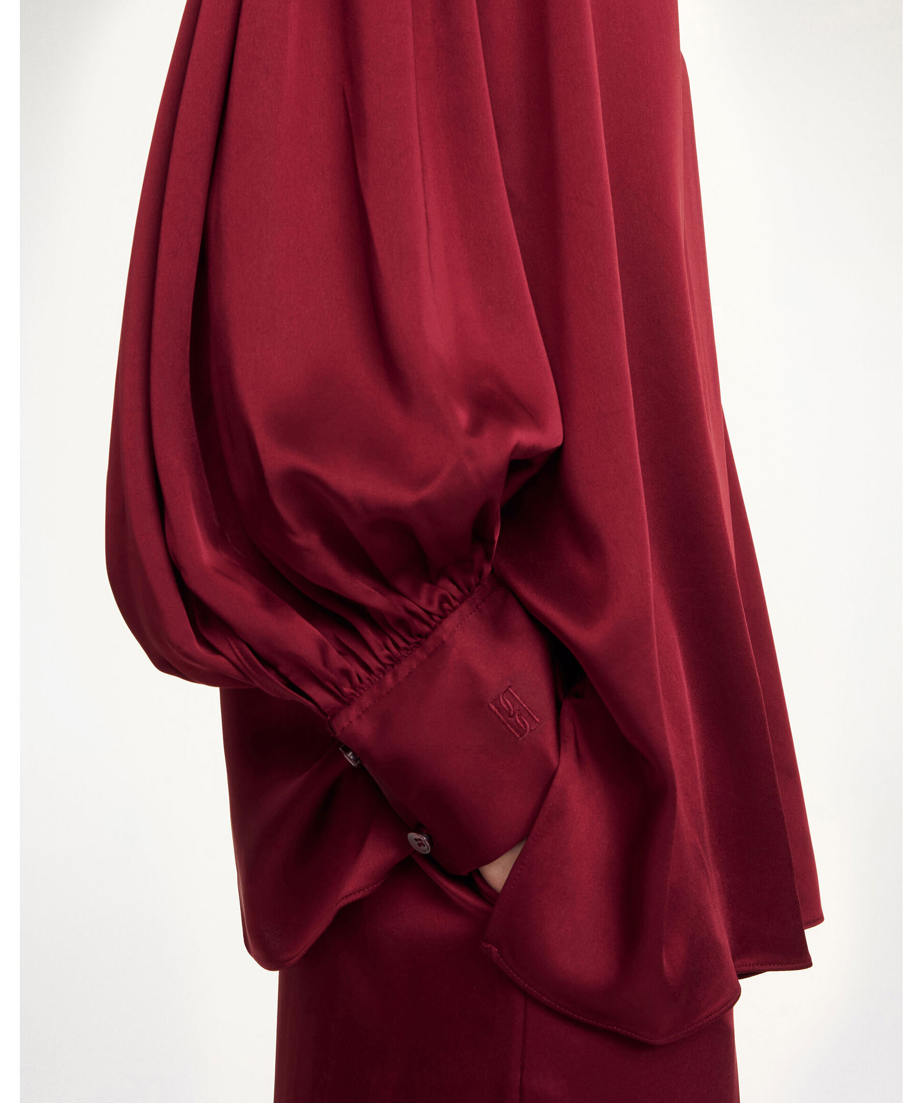 Elegant blus från By Malene Birger med en minimalistisk siluett. Tillverkad i mjuk, glansig satin med en tunikaliknande design, skarp krage, V-ringning och manschetter med knappar. Små sidslitsar och ett diskret broderat monogram adderar en sofistikerad finish – ett plagg som passar lika bra till vardags som till fest.